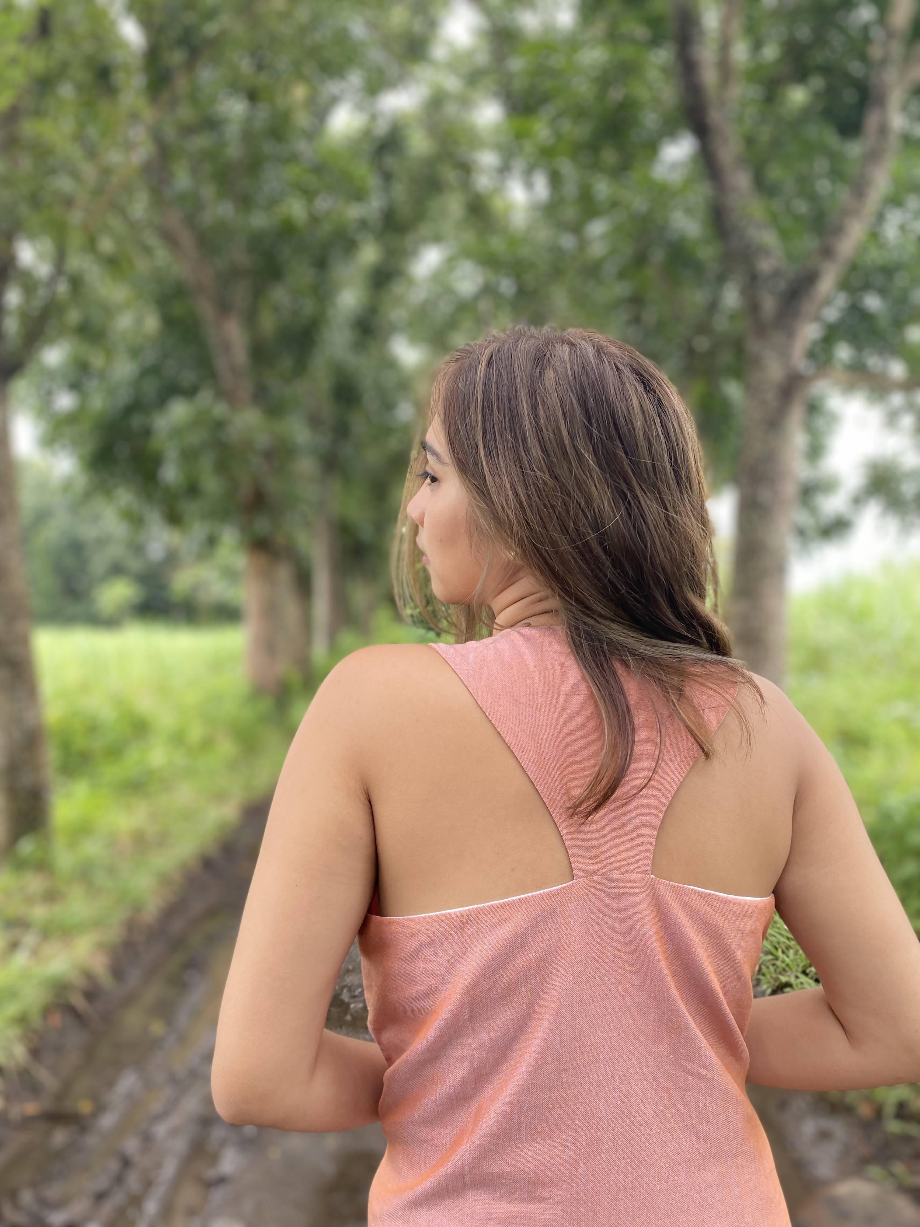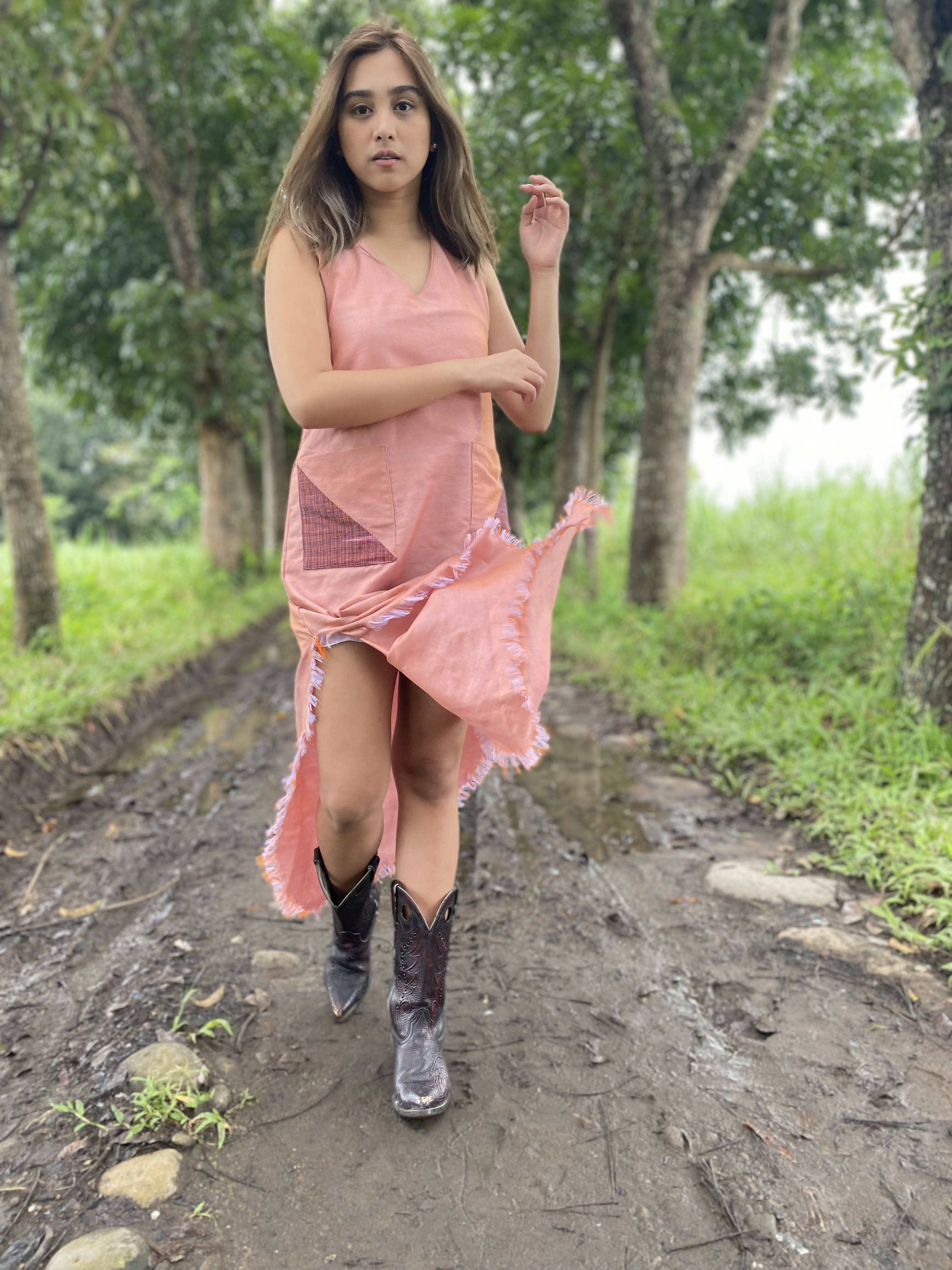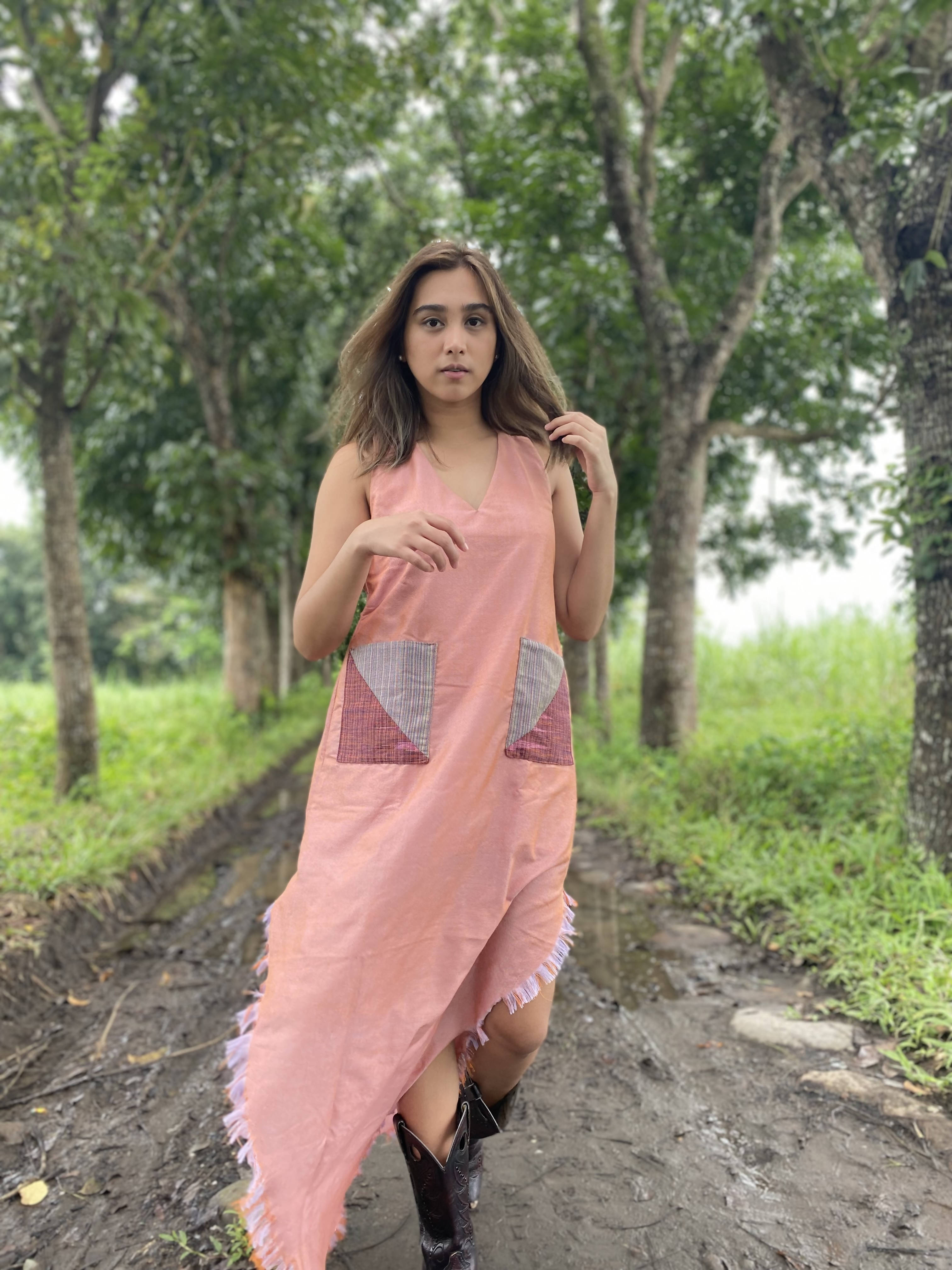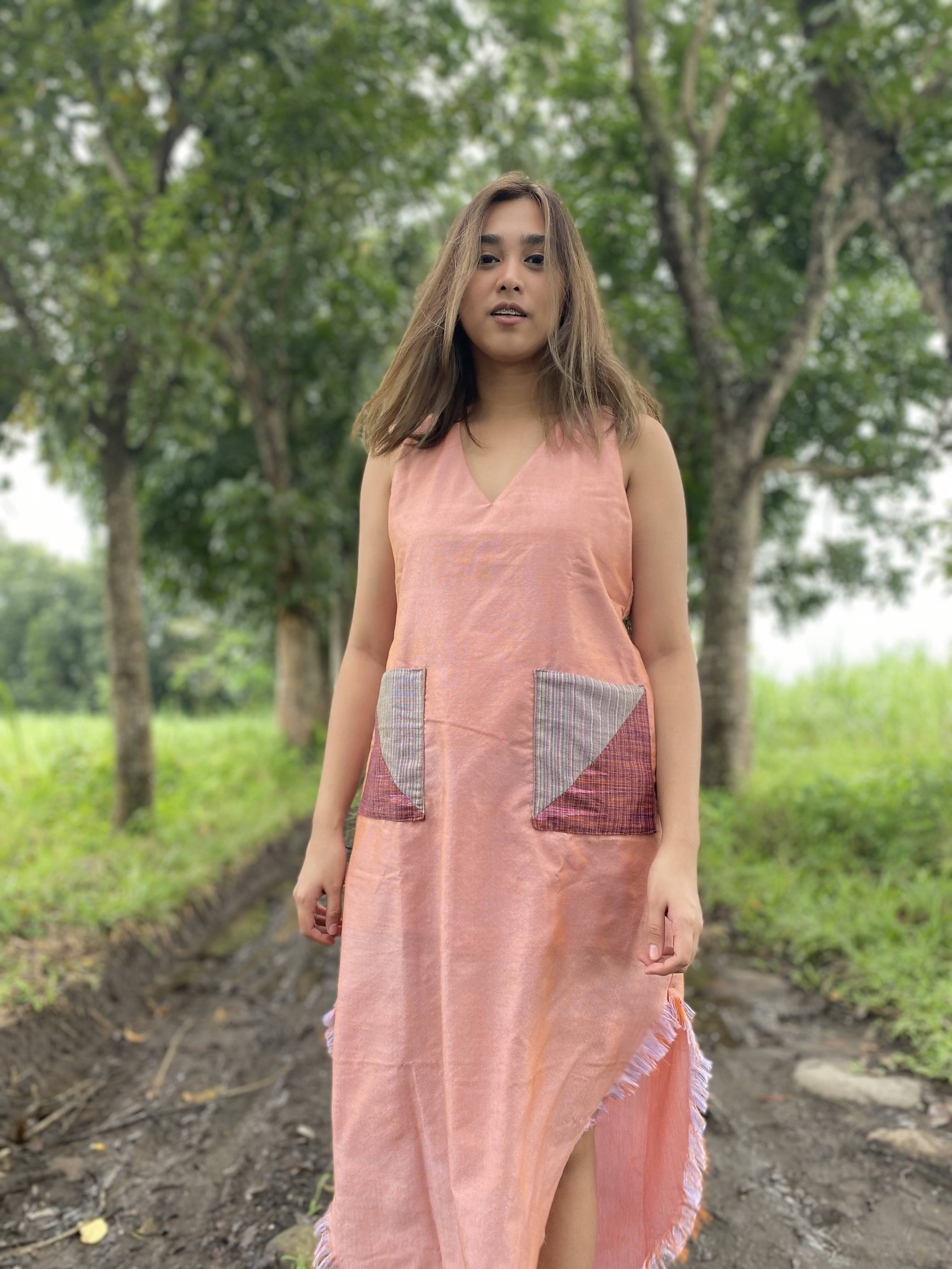 Designed from versatile polycotton, this dress is Naomi. The sleeveless features a feminine v neckline, a stunning fringe skirt with handy pockets using recycled cloth, designed by Vida.  This breezy dress in sophisticated shades of pink, red, and more earth tone colors, is 100% handwoven by Negros Island Weavers.