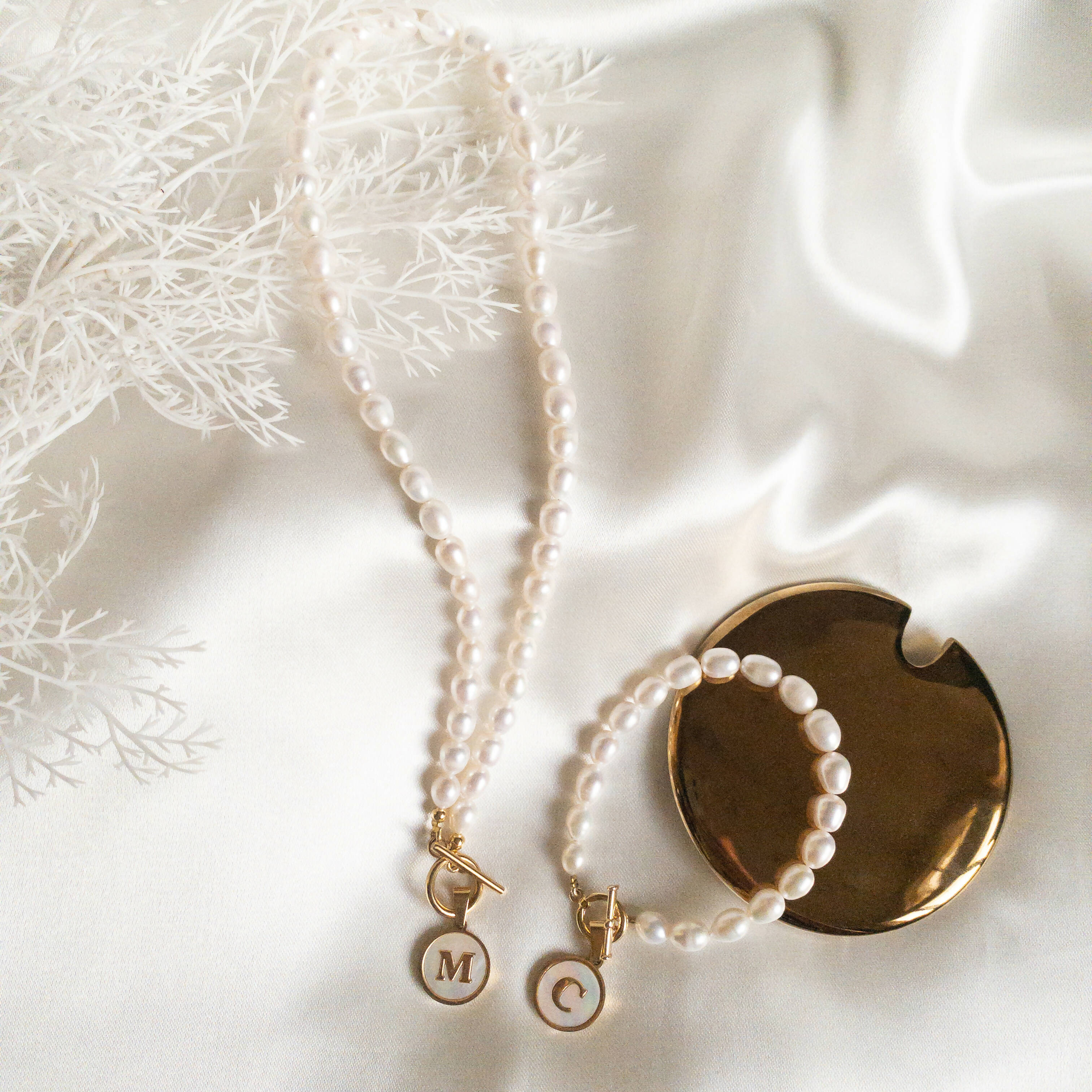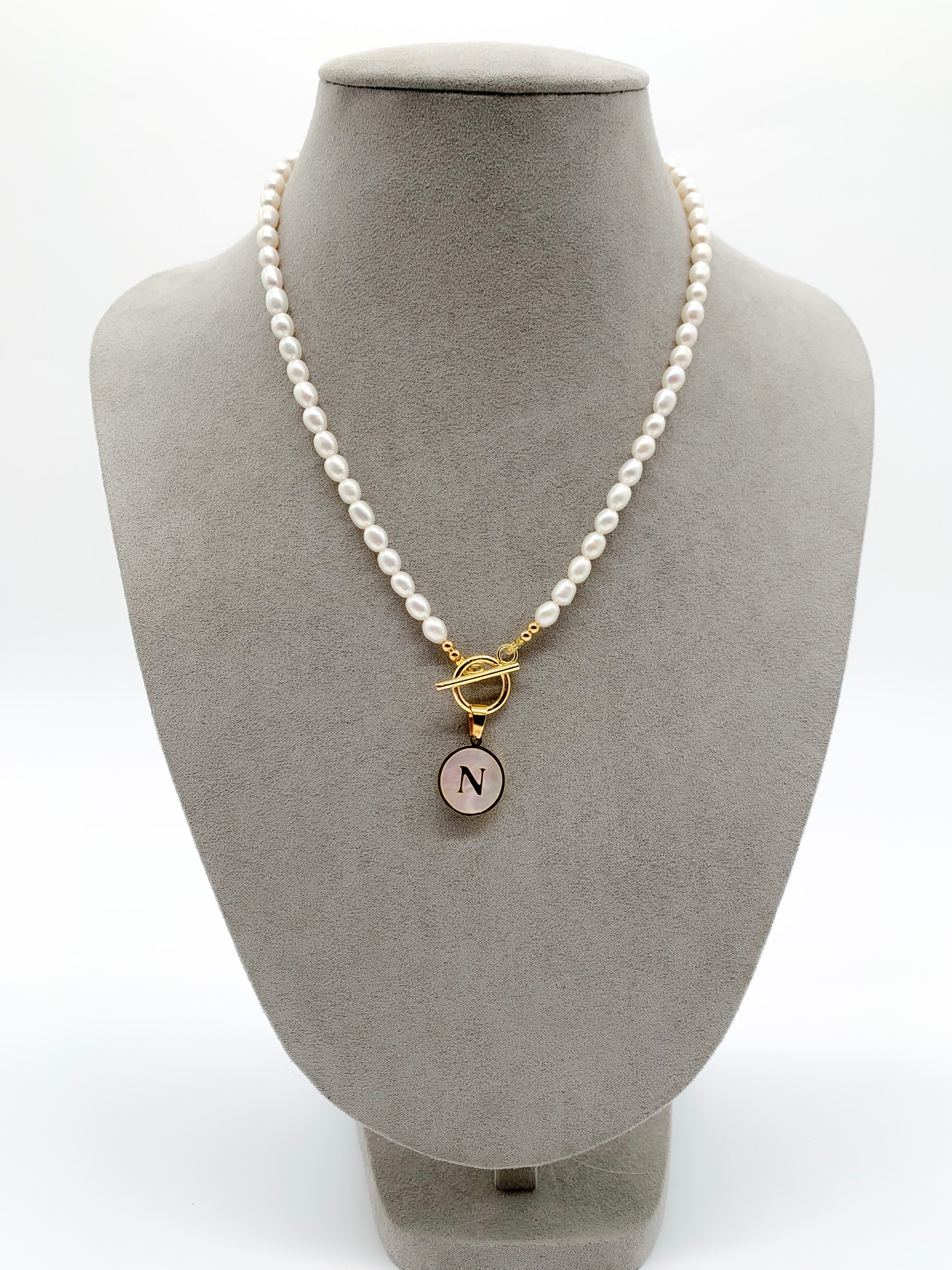 Statement Pearl Initial Necklace Pearl: Freshwater | High Quality | Rice Shape Pendant: Mother of Pearl Initials Get Your Own Initial