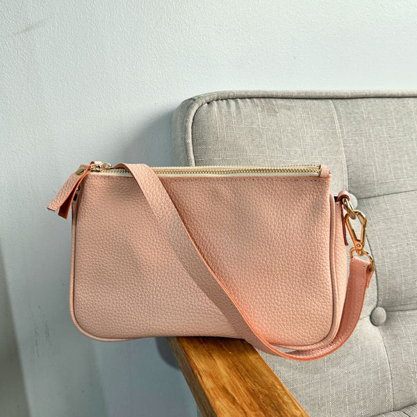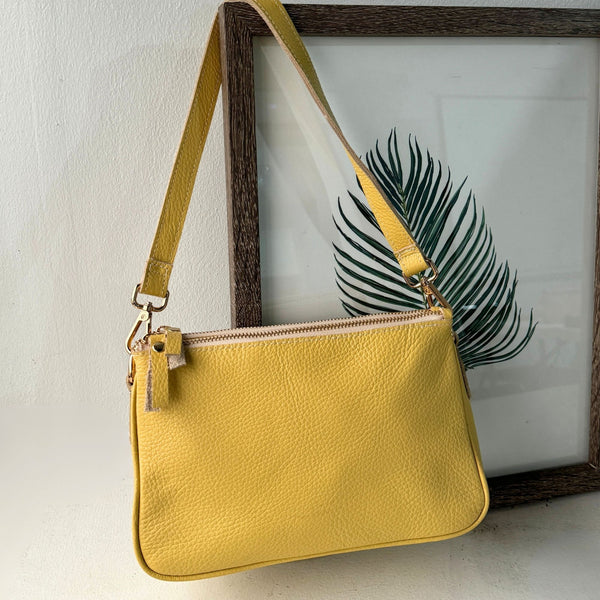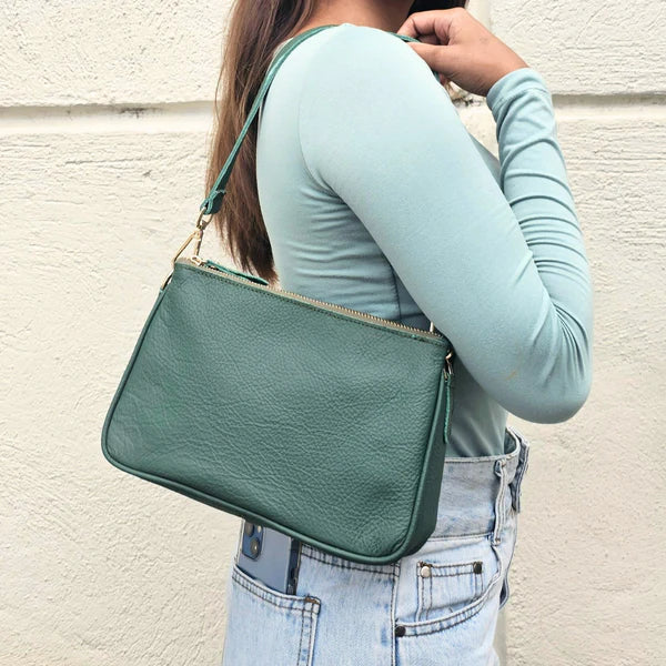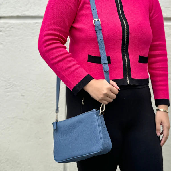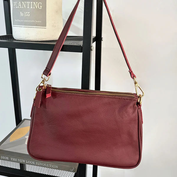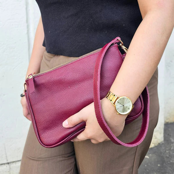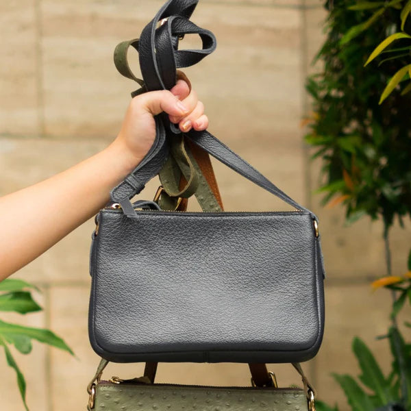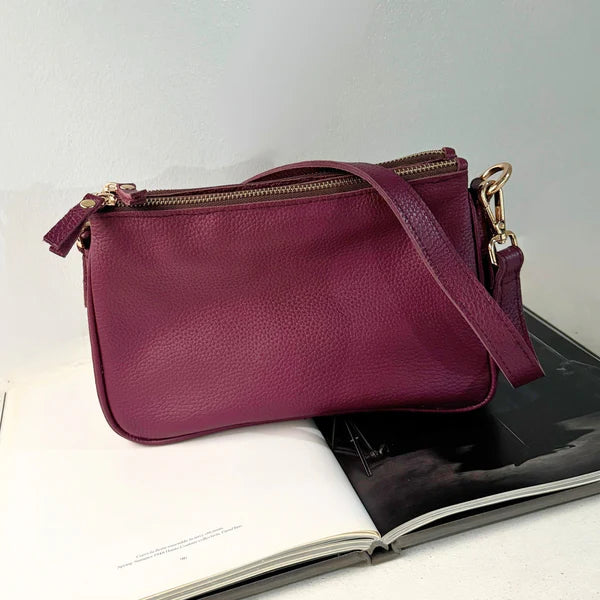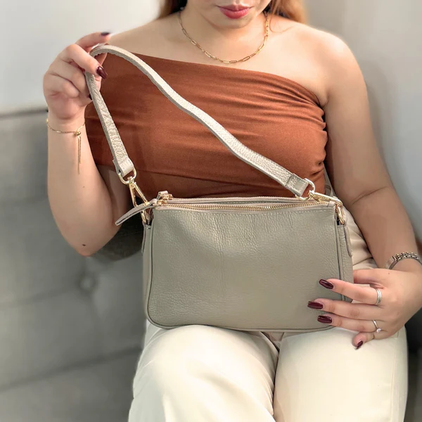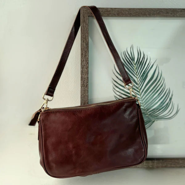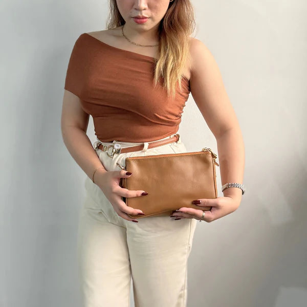 •Dimensions: (inches)•Width: 9”•Height: 6”•Depth: 2.5”•Short strap: .75W x 20”L•Long strap: .75W x 20”L•Exterior-•100% Cowhide Leather•With 2 zip compartments•With detachable, adjustable sling and short strap•Interior-•With lining •With one magnetic-close compartment