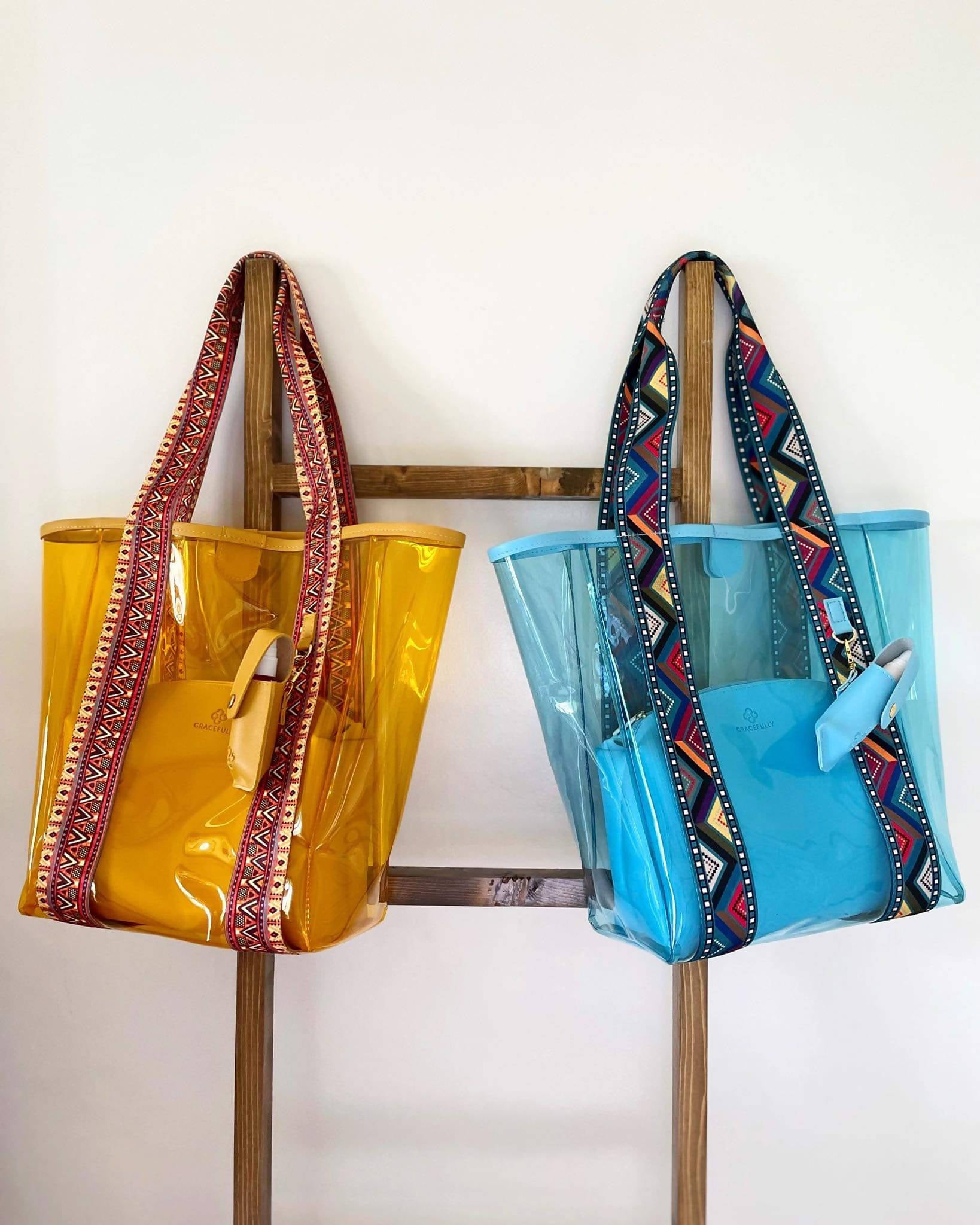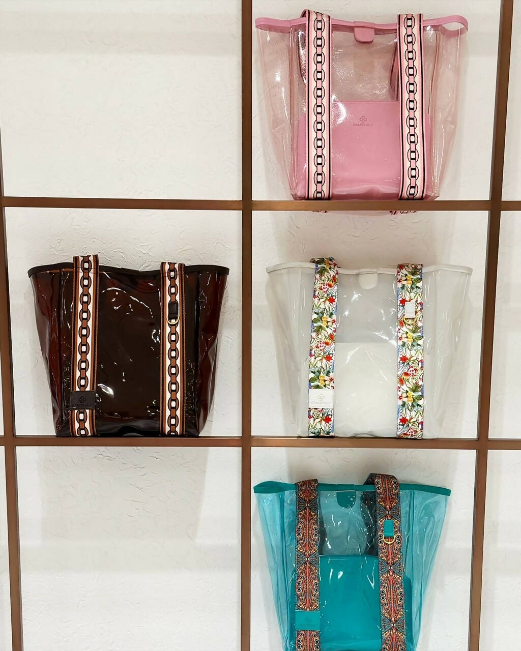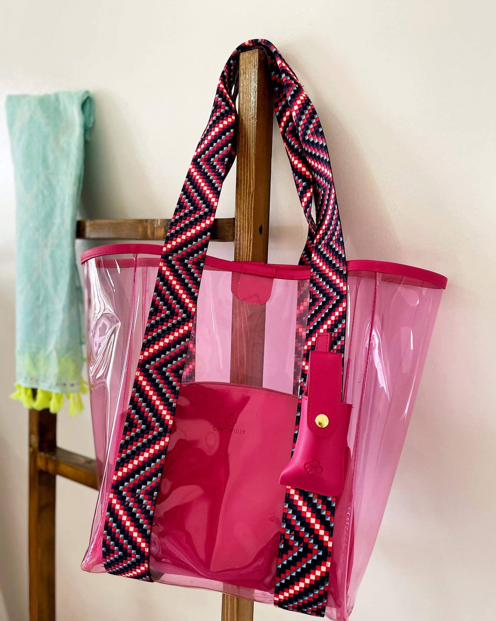 Candy Colored Jelly ToteInclusions :Detachable Leather Pouch with metal hardware for essentials 15.5" L x 14" H x 5" WDrop handle 10"