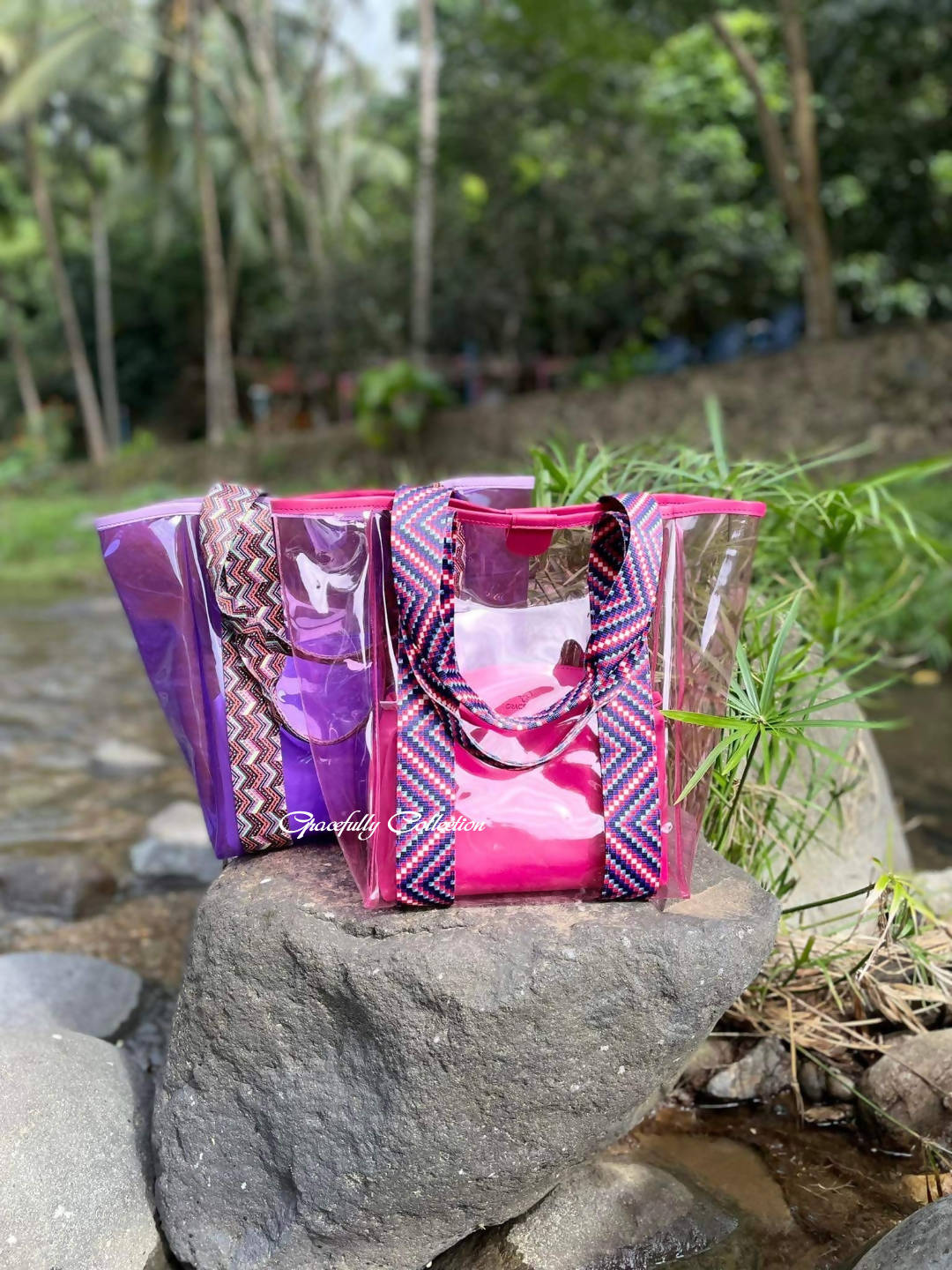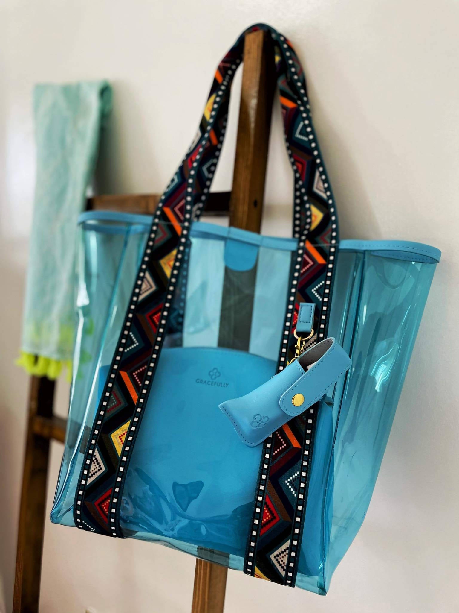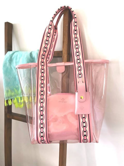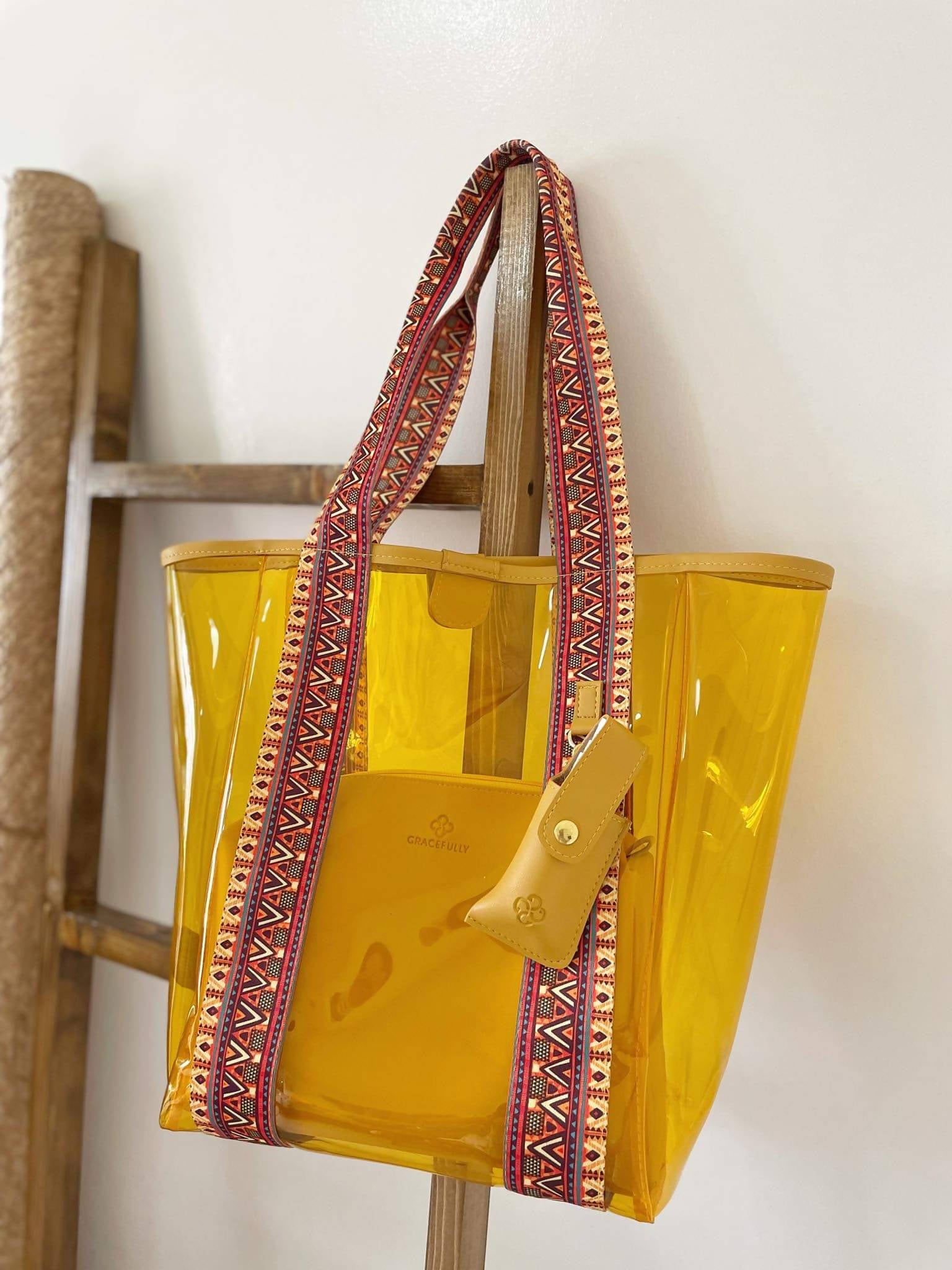 Candy Colored Jelly ToteInclusions :Detachable Leather Pouch with metal hardware for essentials 15.5" L x 14" H x 5" WDrop handle 10"