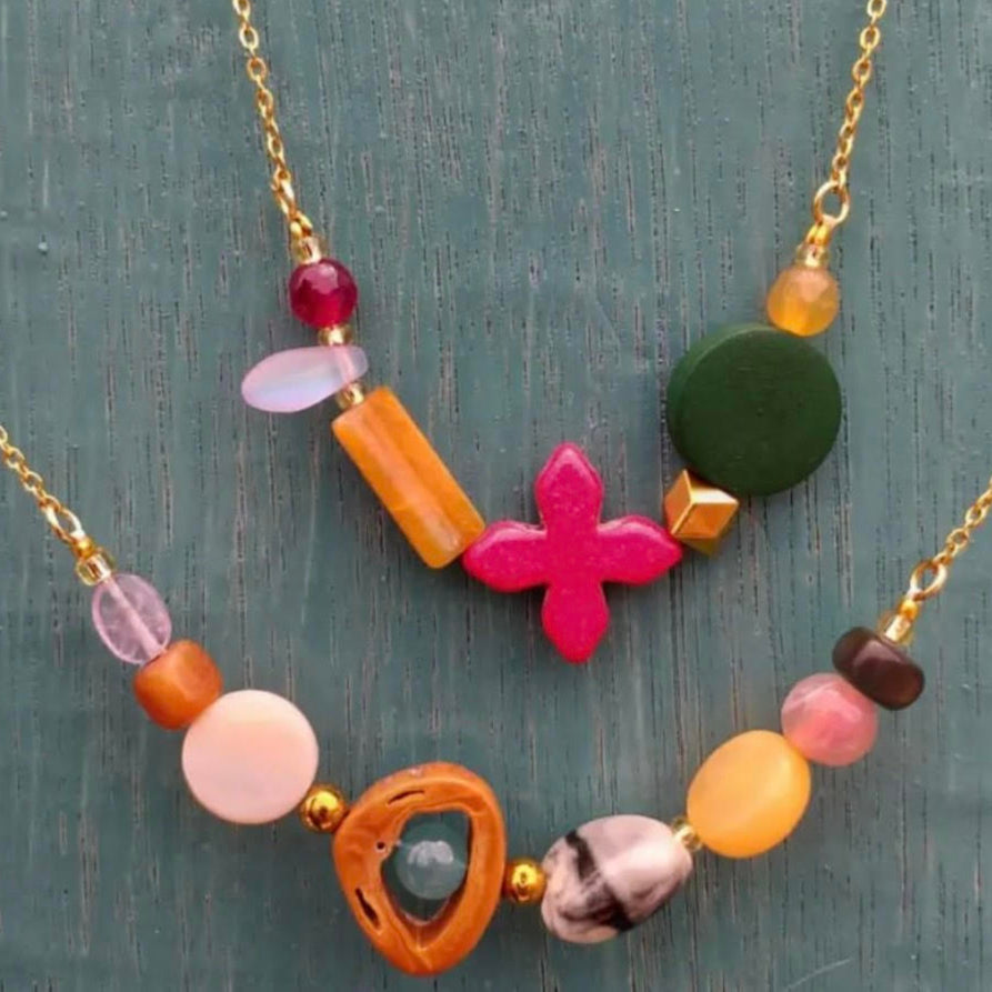 Assorted stones, glass, wood and pearls. Each piece is uniquely combined. Gold-plated Stainless Steel Chain. Length 18".