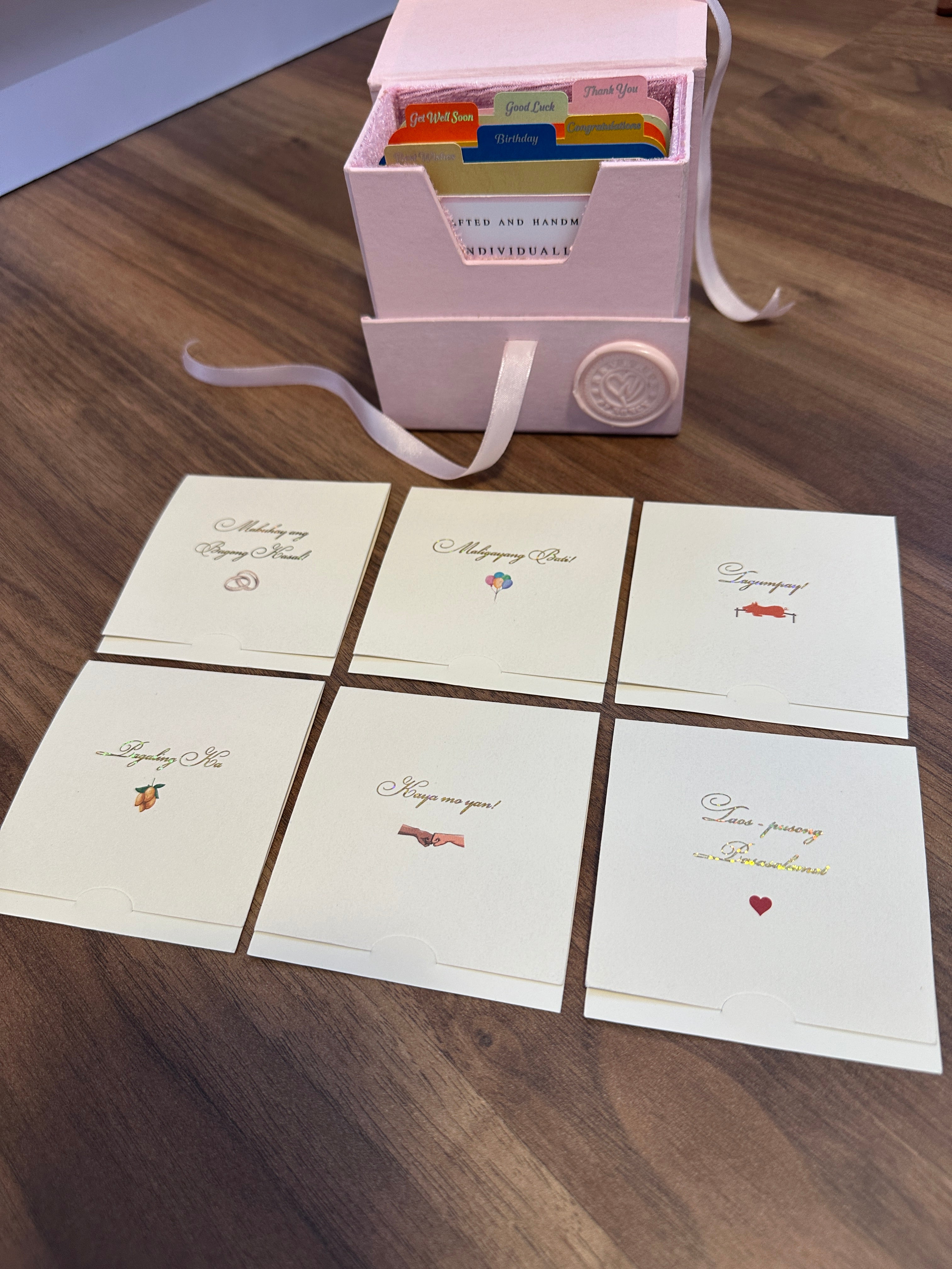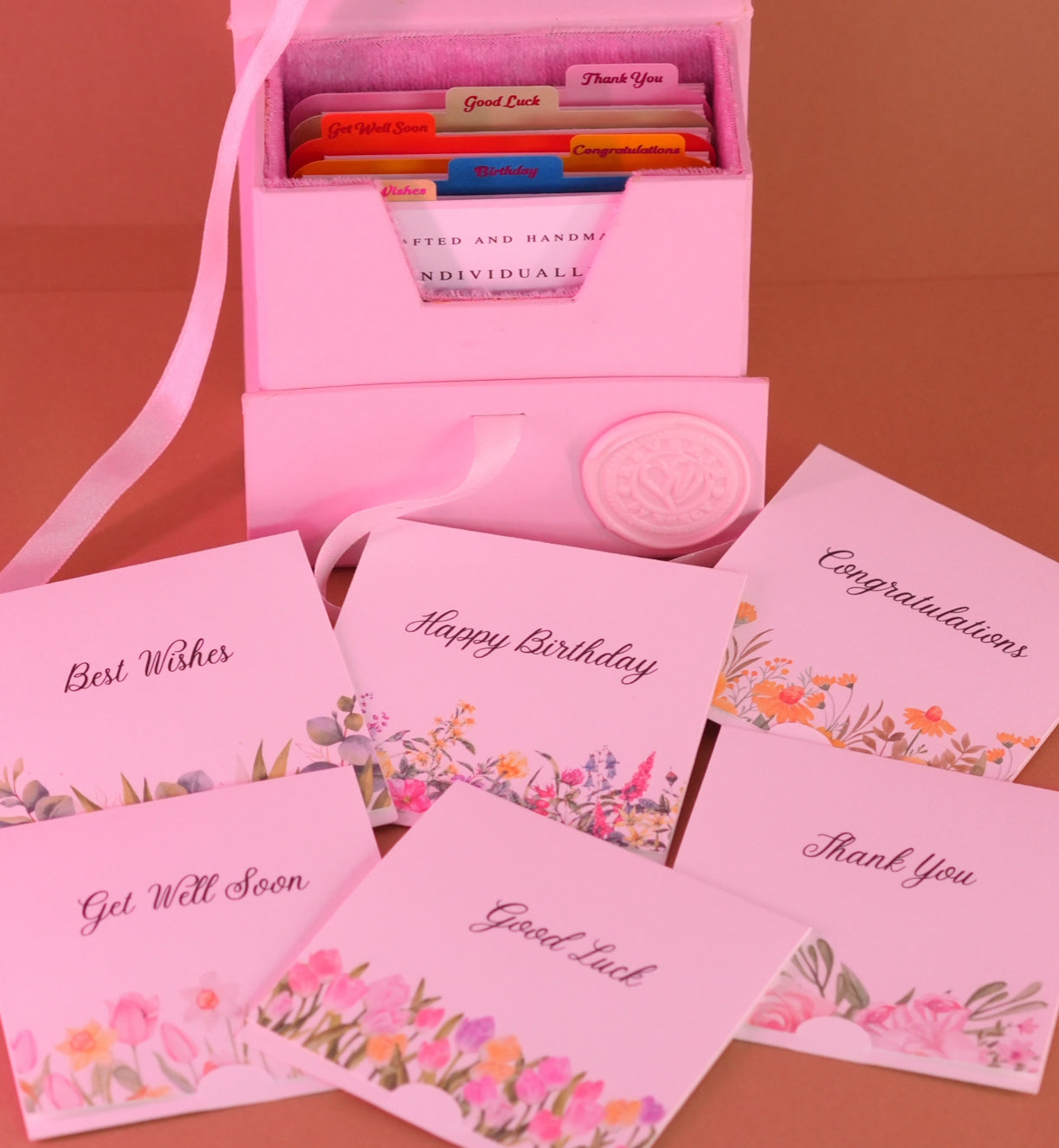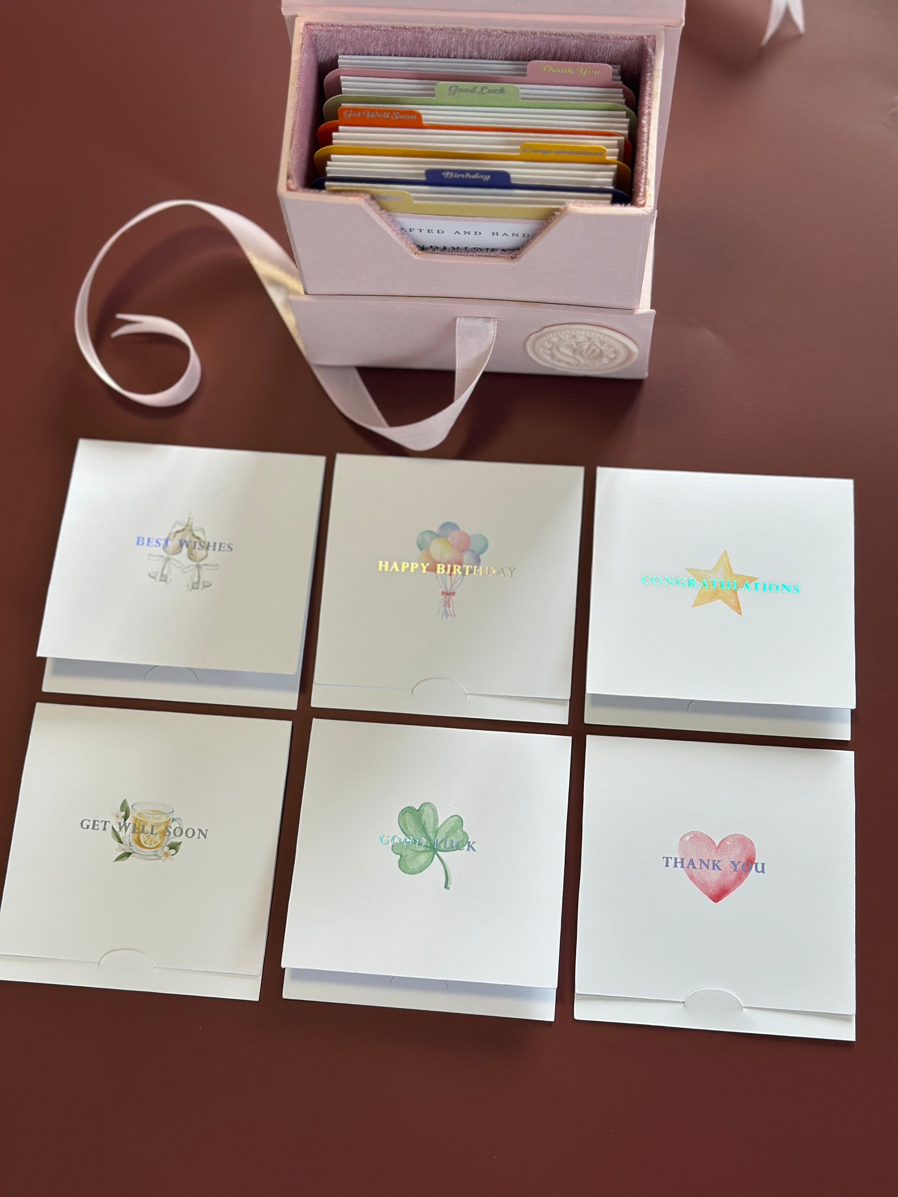 Each box includes 6 different occasions, with 4 cards per occasion. Total of 24 cards -- Best Wishes, Birthday, Congratulations, Get Well Soon, Good Luck & Thank You. Reverie By Nancy creates all stationery with premium specialty paper. Crafted and handmade with care - please handle gently.