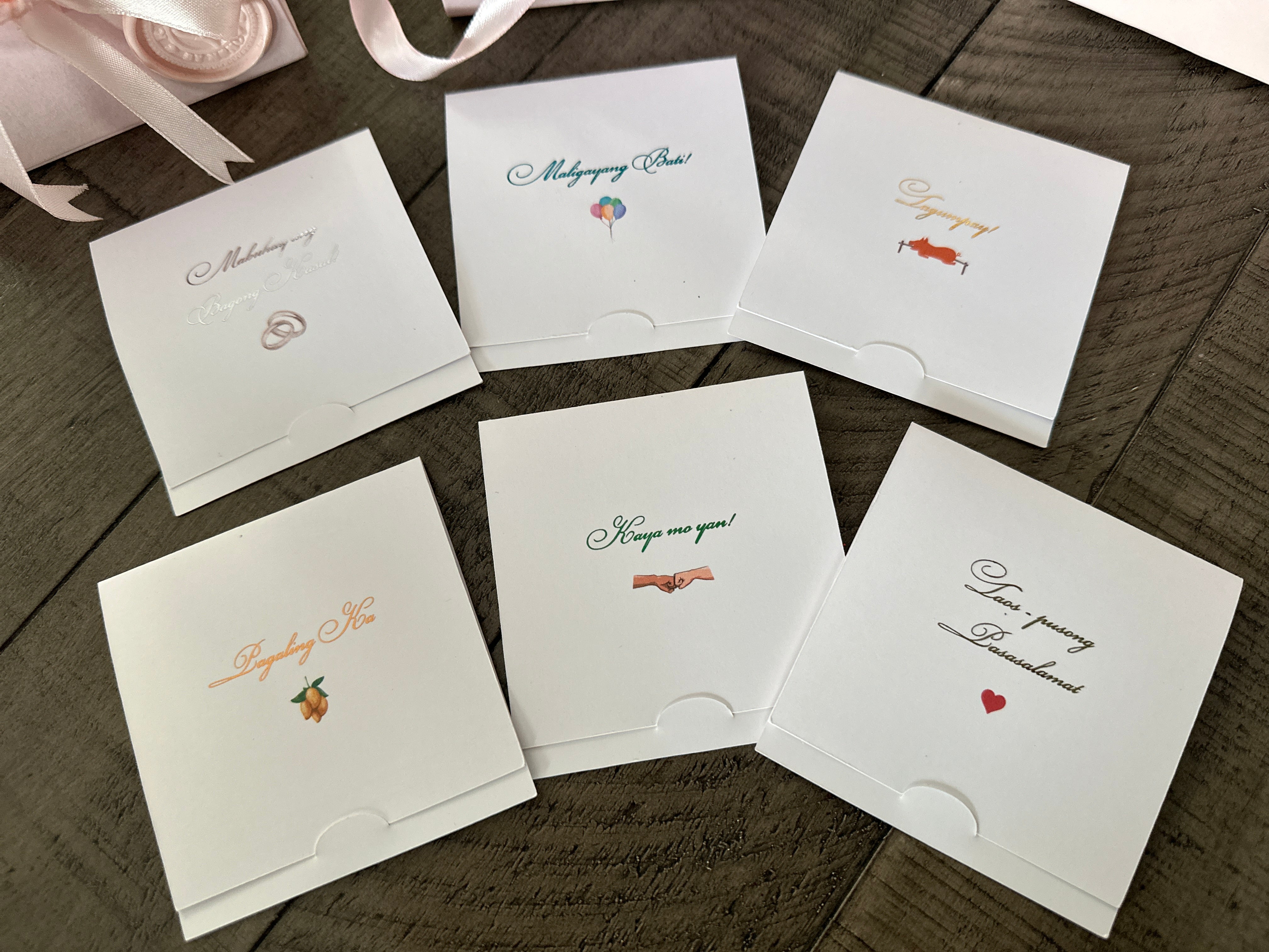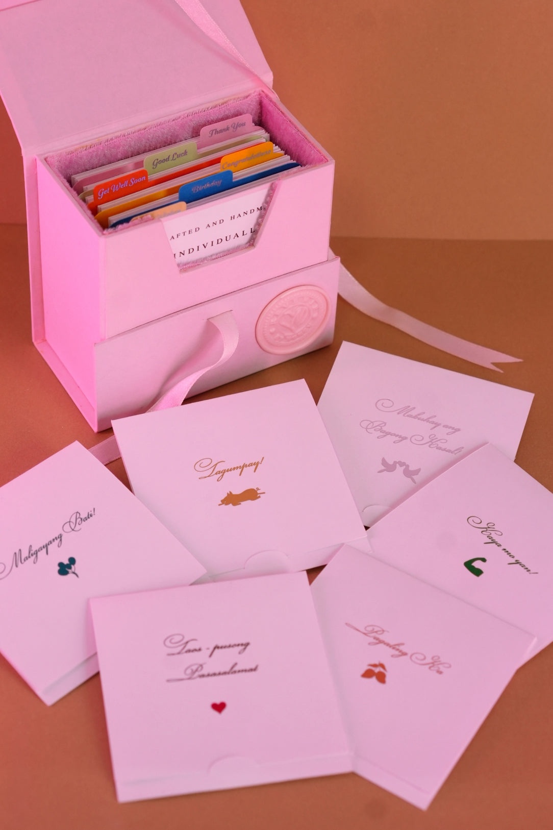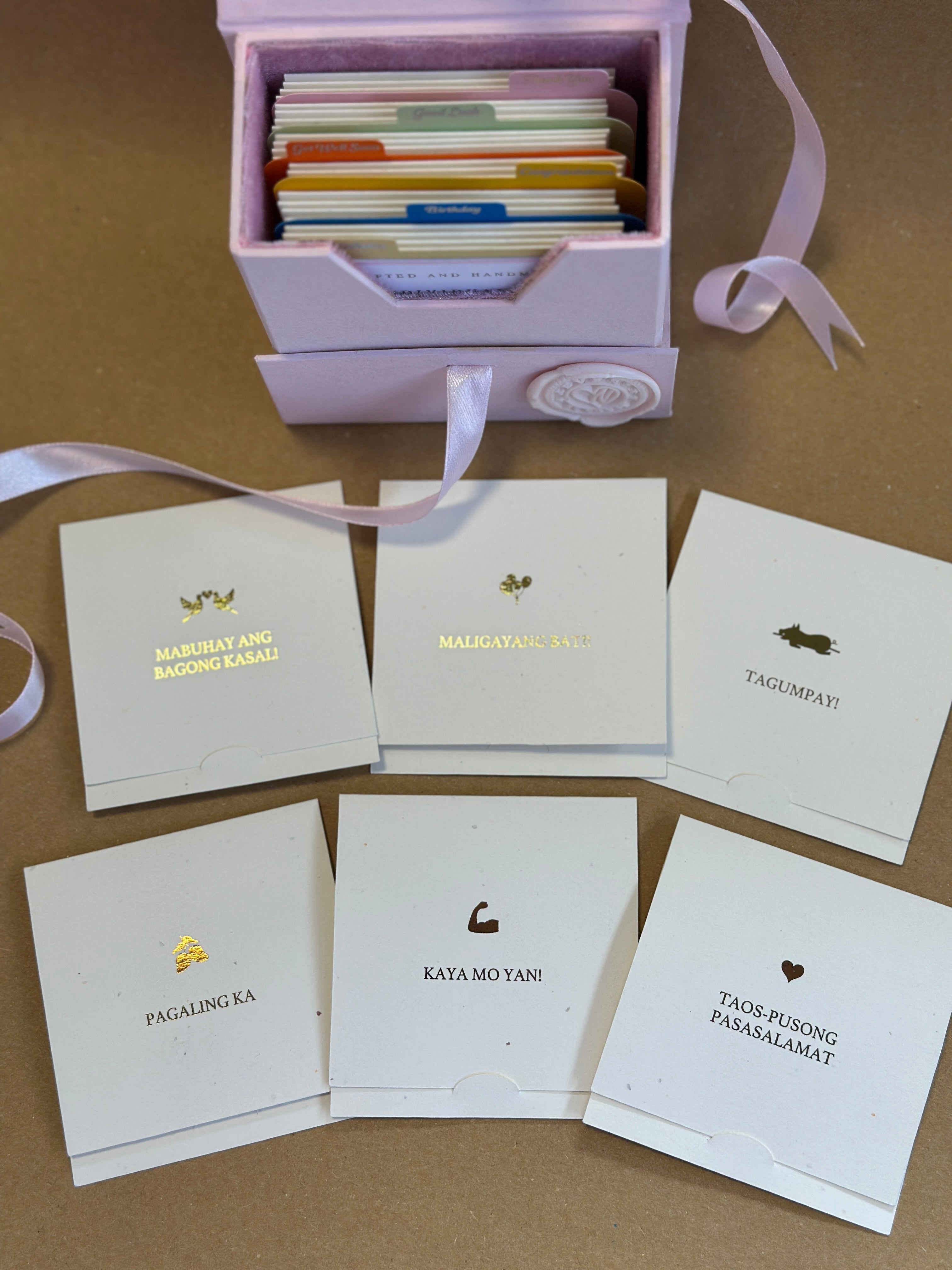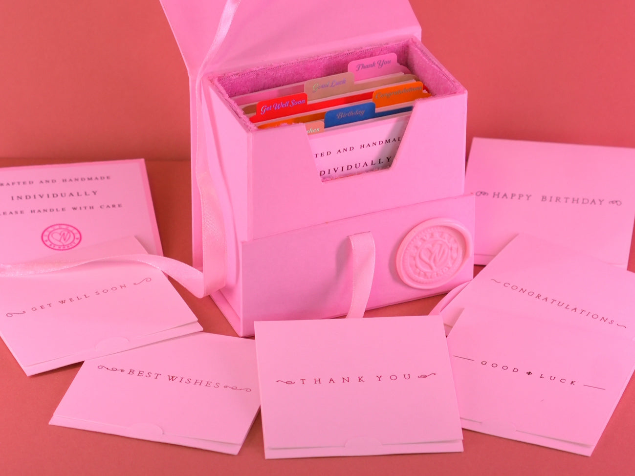 Each box includes 6 different occasions, with 4 cards per occasion. Total of 24 cards -- Best Wishes, Birthday, Congratulations, Get Well Soon, Good Luck & Thank You. Reverie By Nancy creates all stationery with premium specialty paper. Crafted and handmade with care - please handle gently.
