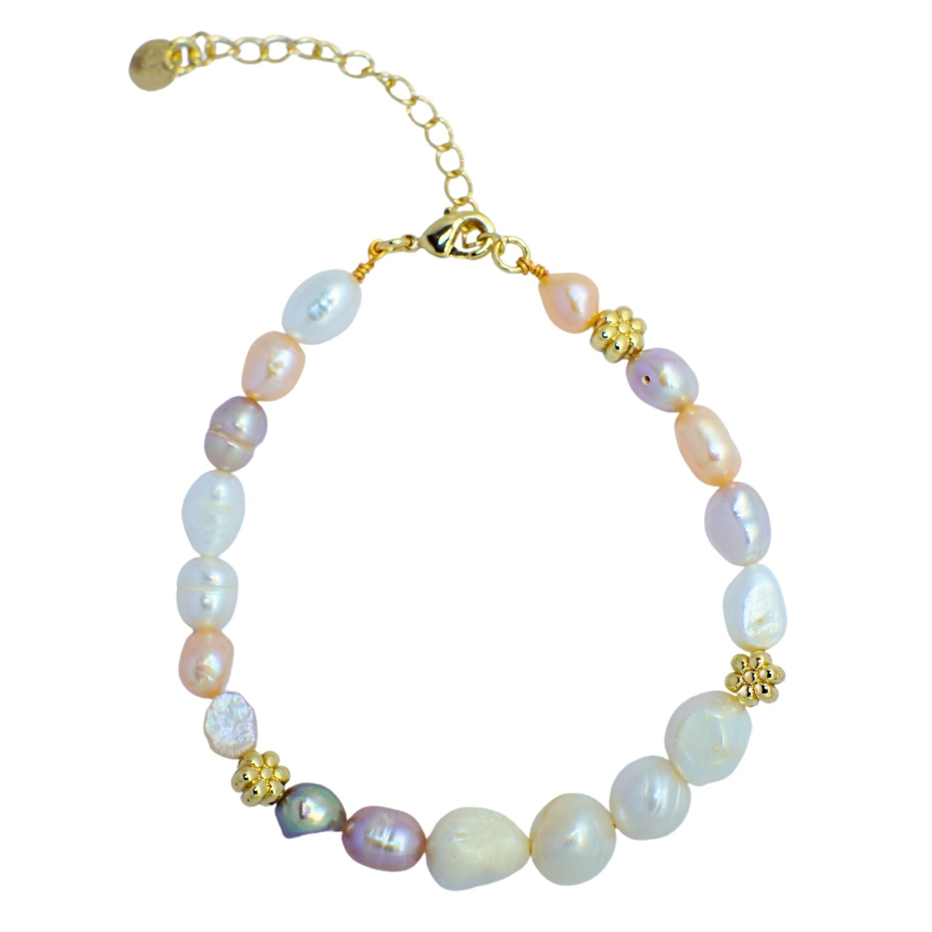 Features a mix of Osaka freshwater pearls and 9–10mm baroque pearls, accented with gold floral charms. All pearls are ethically sourced from freshwater farms across Asia, including the Philippines. Hand-strung on the island with a secure clasp and extension chain for a comfortable, adjustable fit.