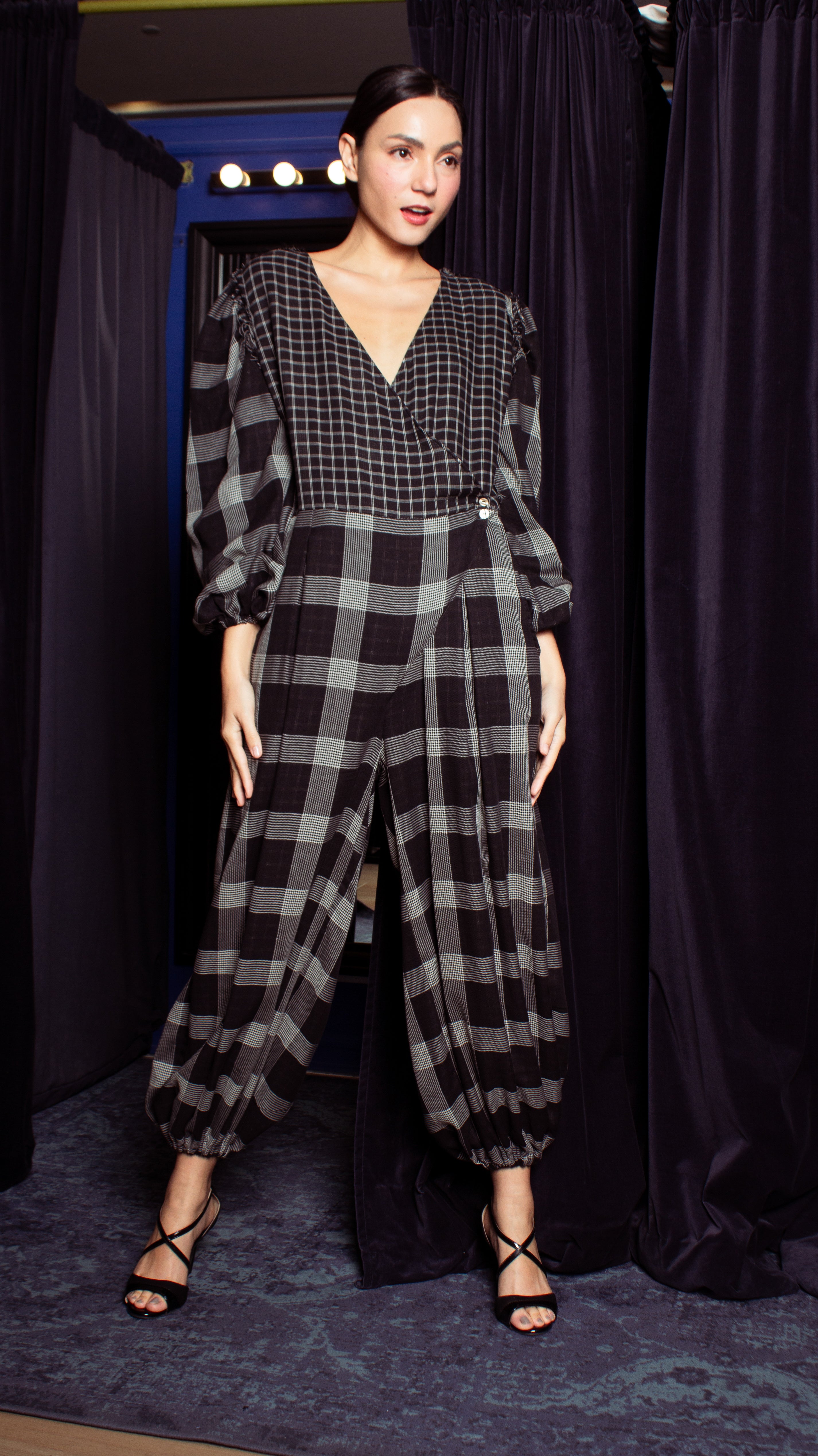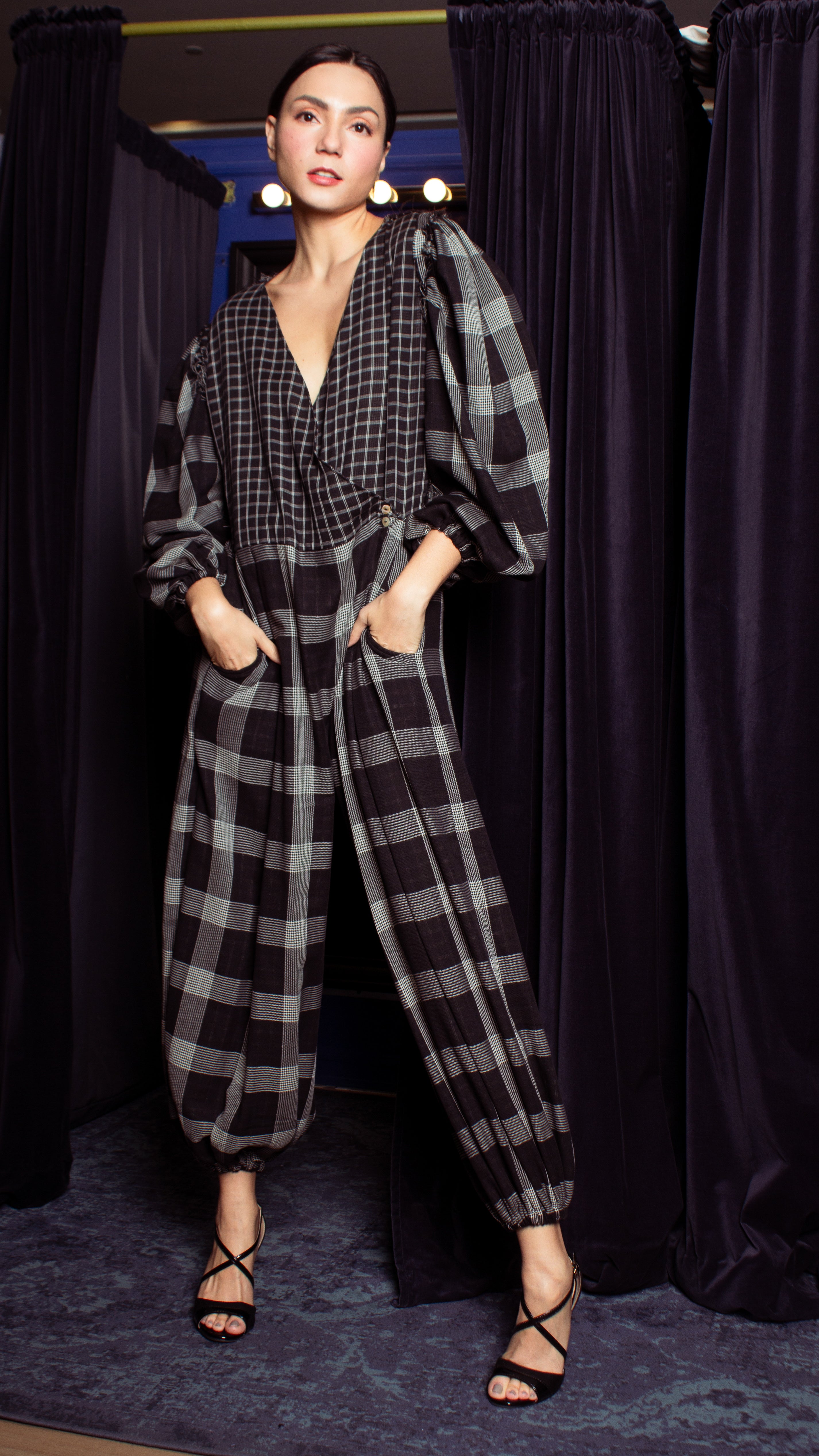 Oversized Front Wrap Jumpsuit with Belt in Black and White Checks