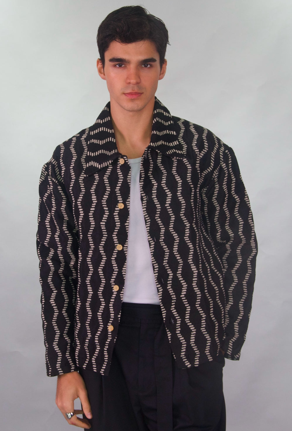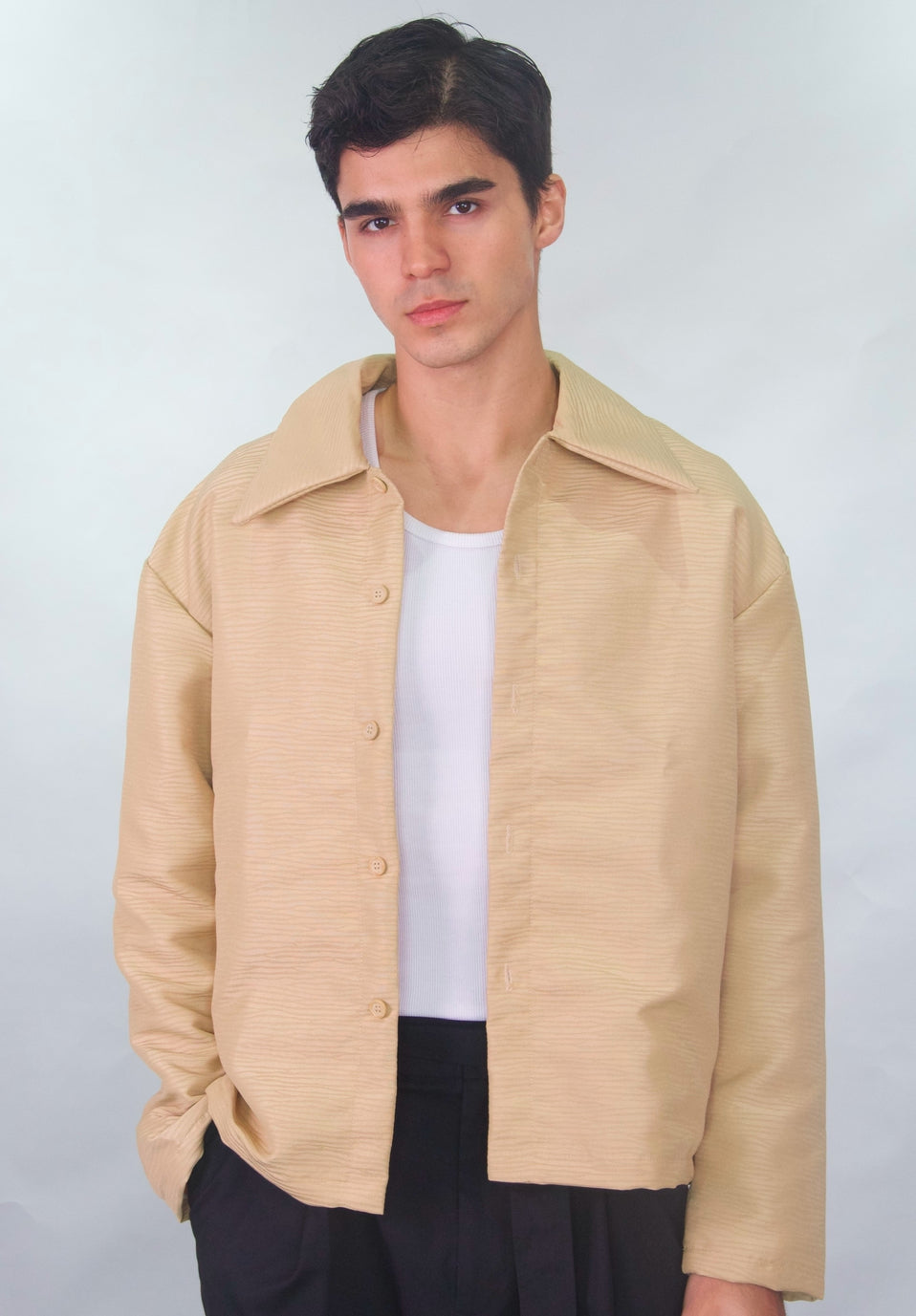 an oversized jacket with snap details on the arm cuffs and waist for adjustable cinching