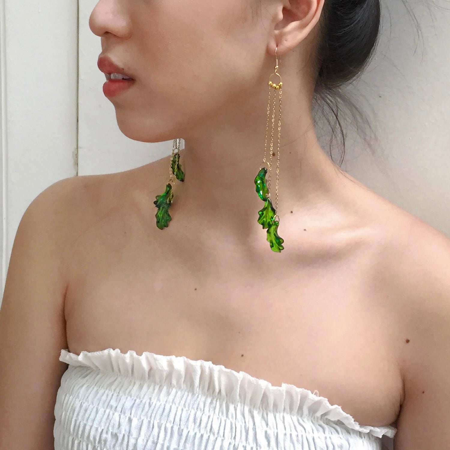 Handmade tropical drop earringsComponentsGold-plated hooksAcrylic leaves Dimensions5.5 inches in lengthLightweightDue to the handmade nature of our earrings, lengths and sizes may vary but very minimal.