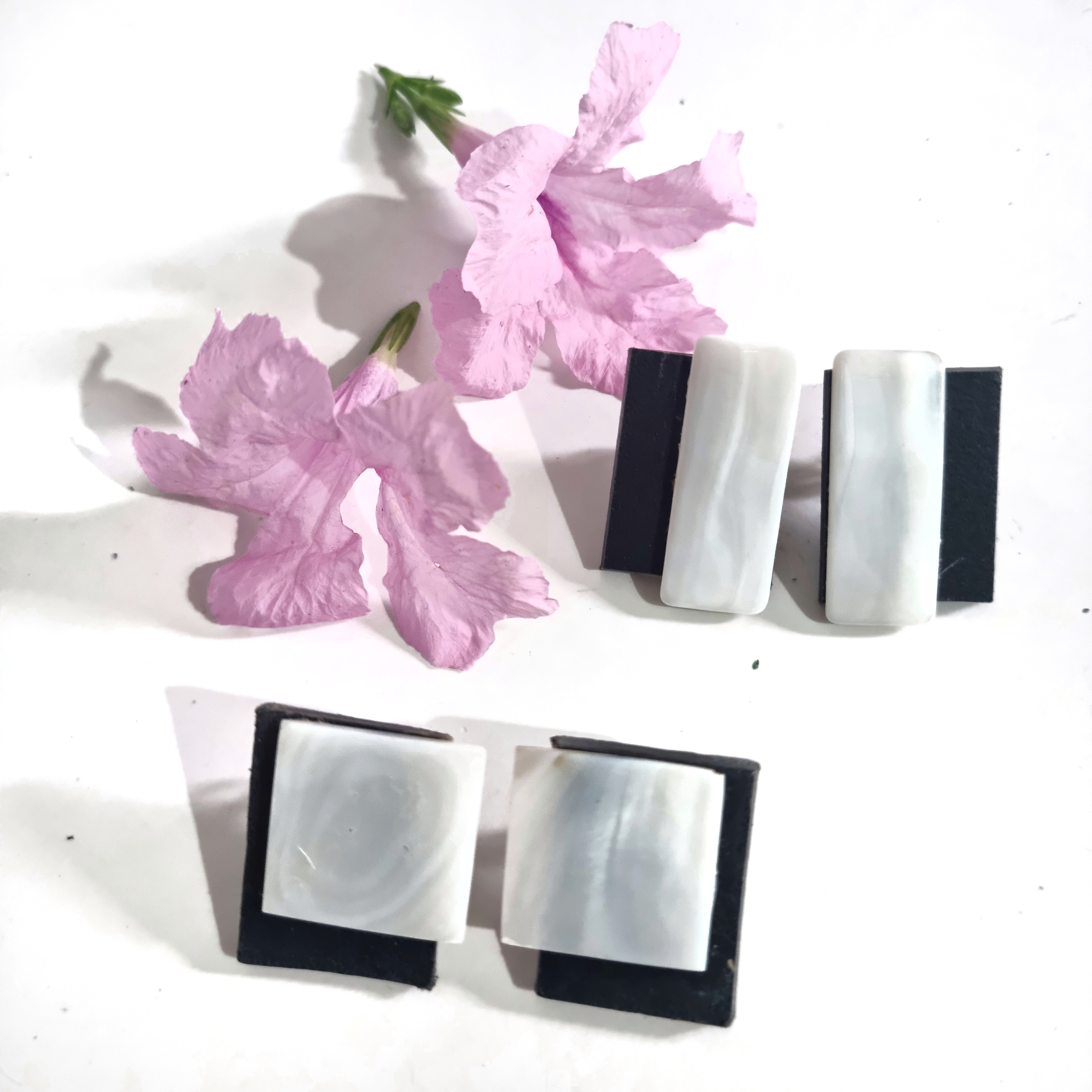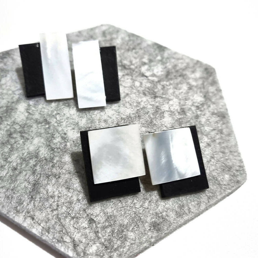 - Made from hand-cut upcycled vegetable-tanned leather, locally-sourced Mother of Pearl, and hypoallergenic stainless steel studs.