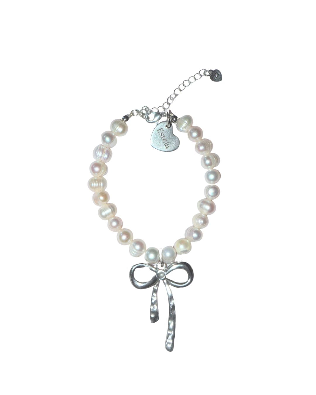 Timeless with a touch of sweetness, this bracelet features hand-selected freshwater pearls strung together with a hammered silver bow charm. Finished with an adjustable chain and signature Estela heart tag — delicate, sculptural, and perfect for layering.