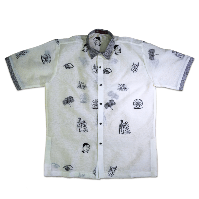 White piña barong with grey-white woven accents and Philippine national symbols embroidered: Mango, Anahaw, Sampaguita, Jose Rizal, Barong at Baro't Saya, Philippine Pearl, Carabao