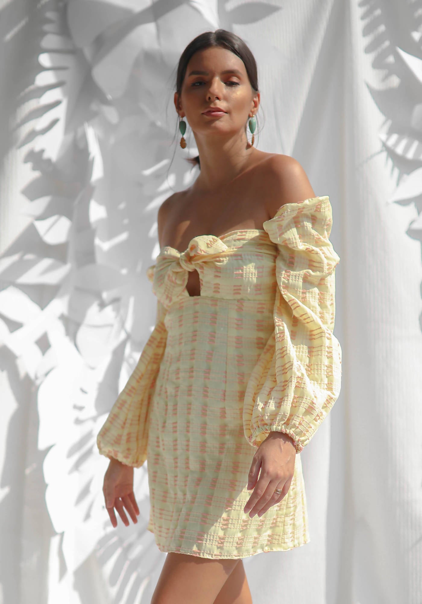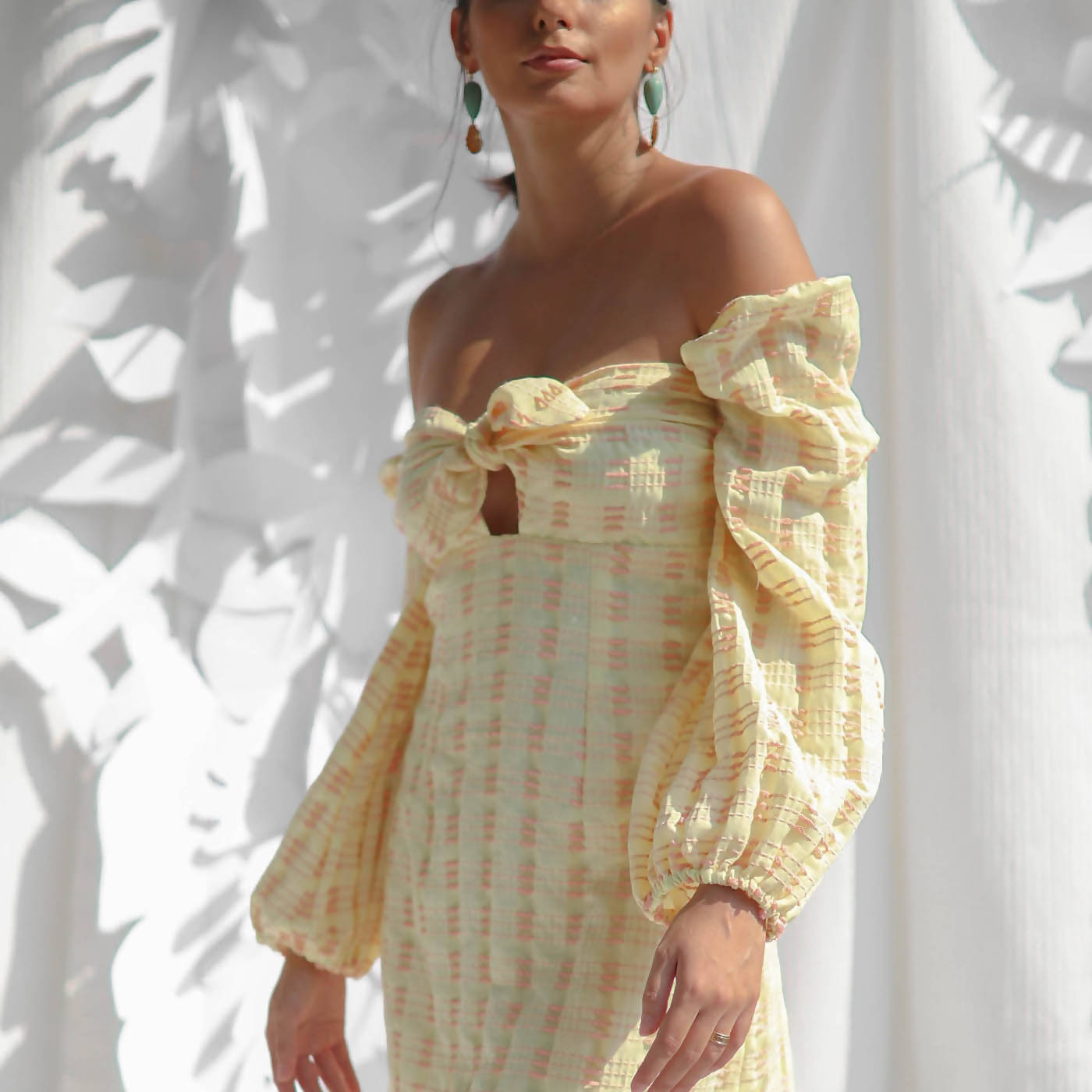 • Puff sleeved dress made with textured cotton, lined- can be worn sleeves up or off shoulder