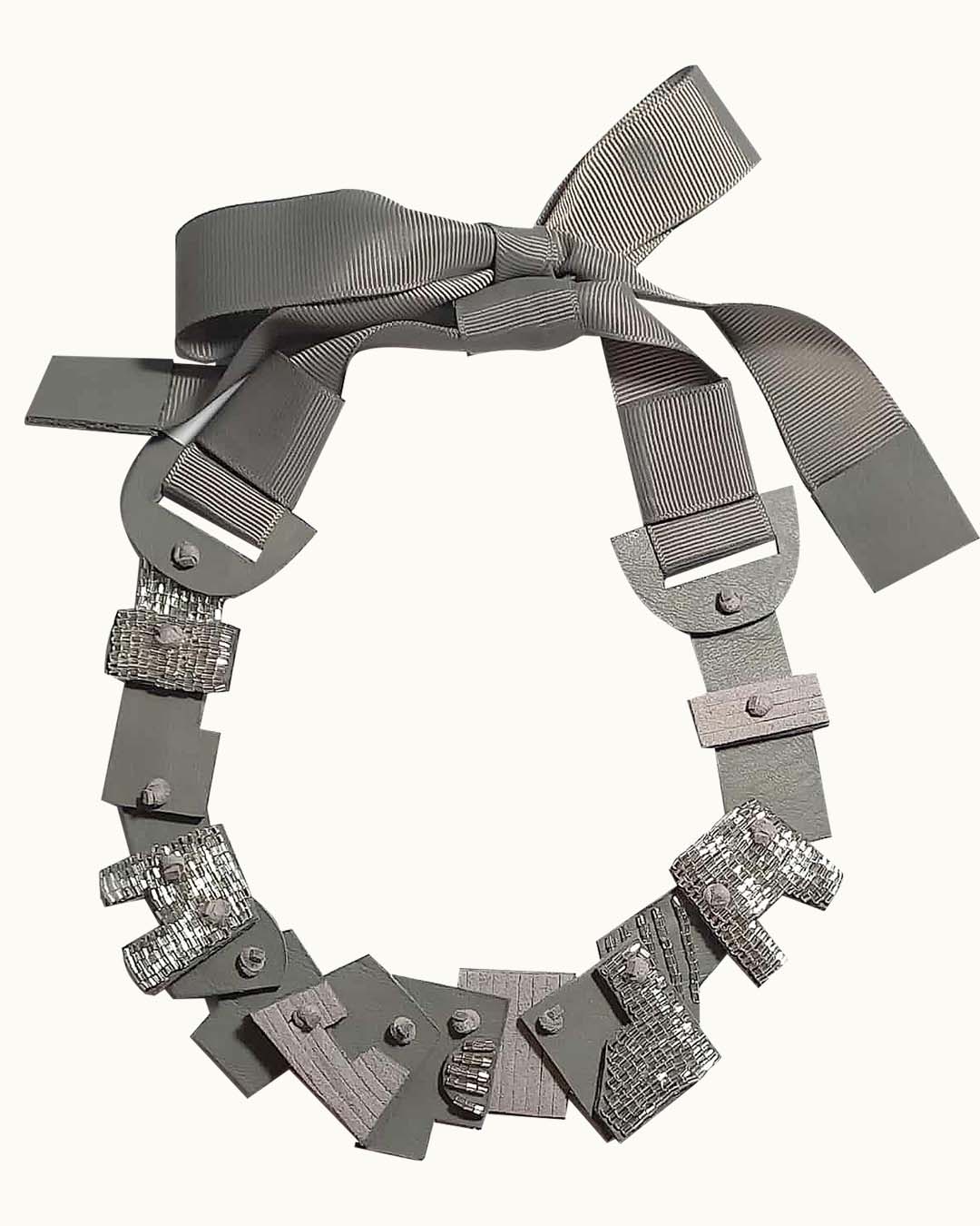 “Pieces” Mini Leather Handbeaded Neckpiece – In Silver & Grey