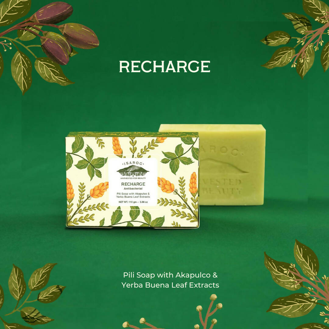 Harnessing the active ingredients of Philippine BotanicsRECHARGE Pili Soap with Akapulco and Yerba Buena Leaf Extracts(ANTIBACTERIAL)  FUNCTION Supports clear and deeply cleanses without drying. Leaves you feeling refreshed and moisturized.   AROMA Uplifting, and refreshing herbal green blend PHILIPPINE BOTANICS Pili, Akapulco, Yerba Buena (PH Mint) Pro-Earth, Skin Safe, Filipino Craftsmanship100% Plant Origin, Palm-Free, Cruelty-FreeMade in Small Batches in a FDA Approved FacilityHarvested for Beauty. Harvested for You.