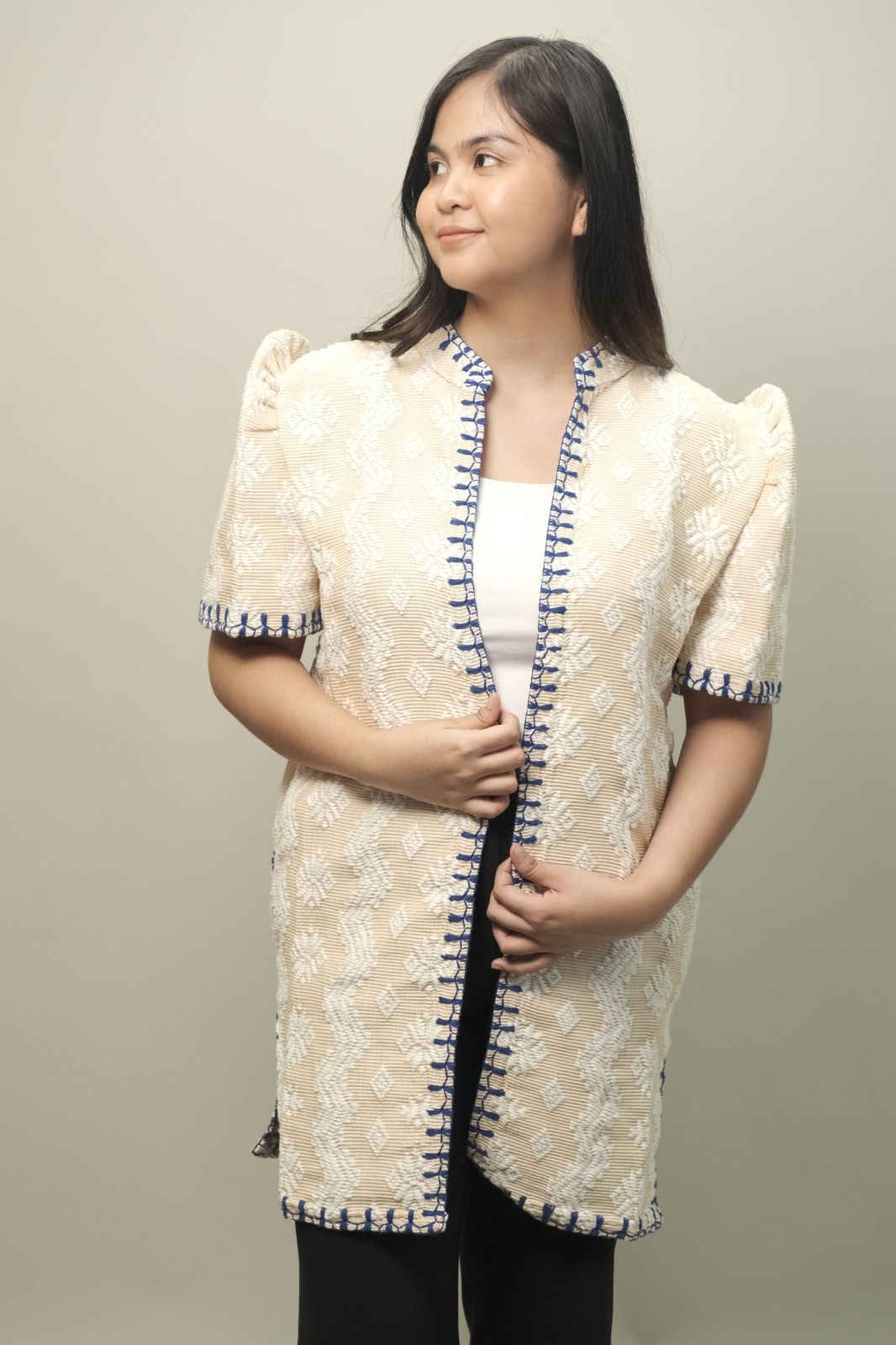 Long modern filipinaina in cream with blue Itneg embroidery - XL size (44" chest, 18" shoulders)