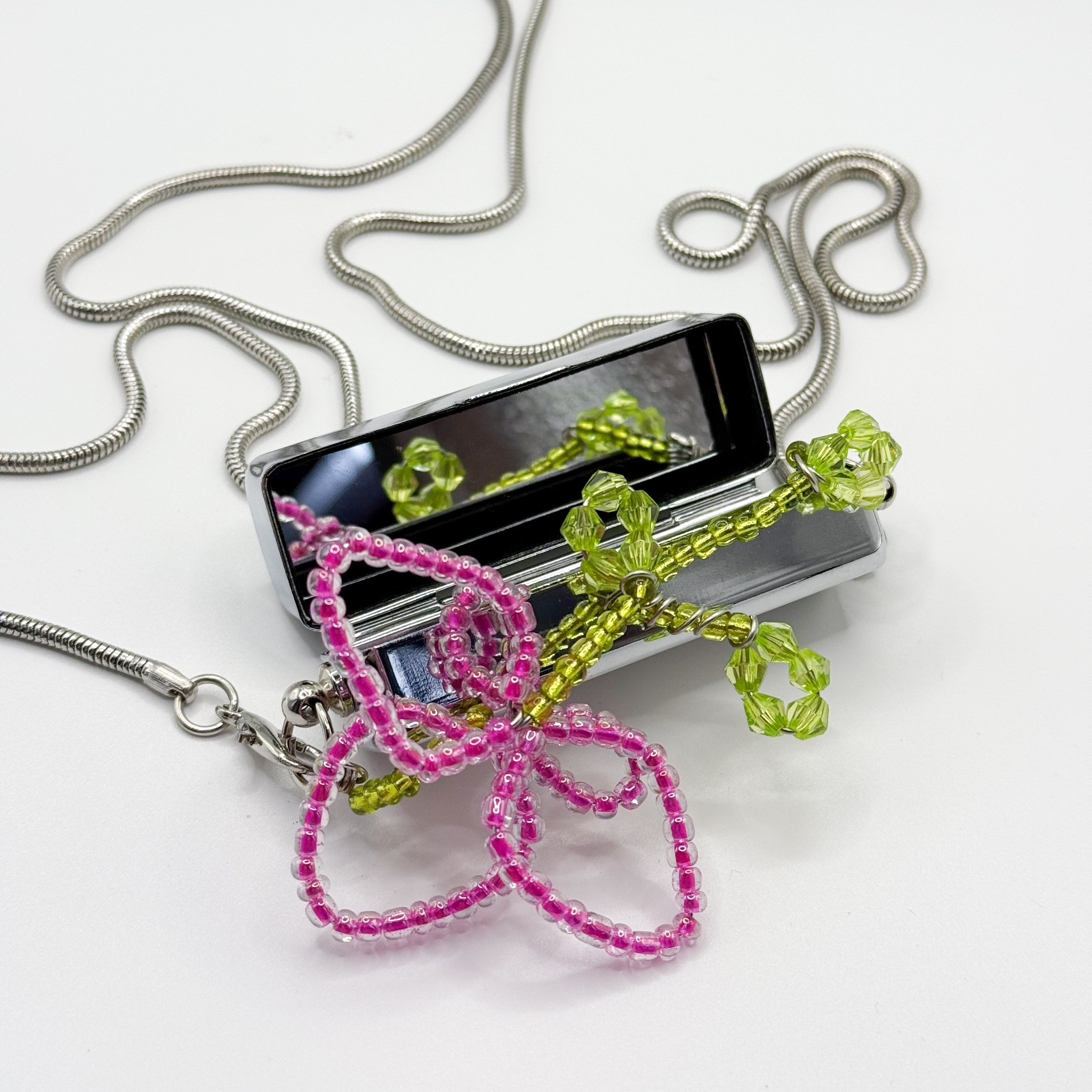 • Handmade beaded flower charm paired with a sleek mini case for your daily must-haves
