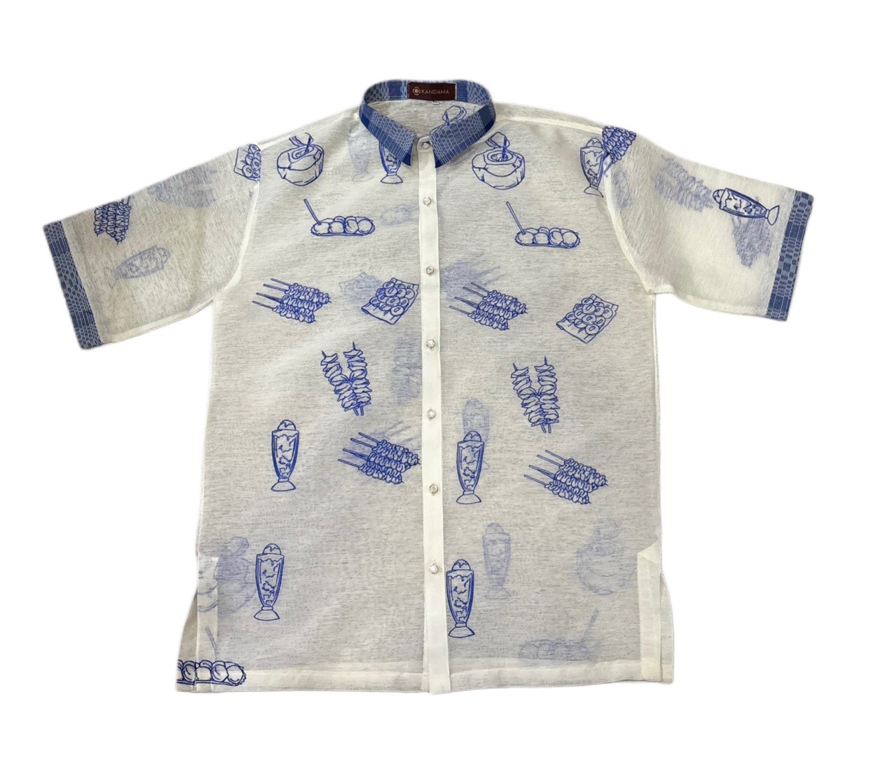 This polo shirt reimagines a Filipino classic with artisanal flair. It features a button-down silhouette accentuated by handwoven fabric from Abra, thoughtfully placed on the collar and sleeve trimmings for a refined yet cultural touch. The shirt’s standout detail is its embroidery inspired by beloved Filipino street food — from isaw and fish balls to halo-halo — celebrating everyday local flavor through intricate needlework. The result is a versatile piece that blends heritage craftsmanship with contemporary design, perfect for both casual and formal settings.