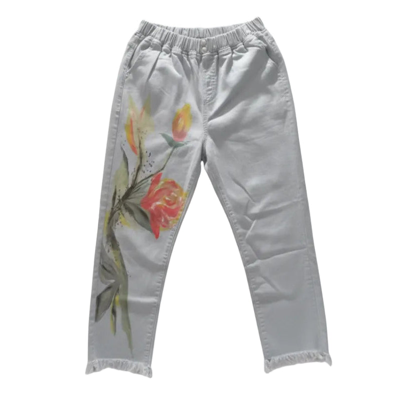 • Soft light-blue denim pants with a gaterized waist, hand-painted pink floral artwork, and finely embroidered flowers with bird motifs—each piece uniquely expressive.