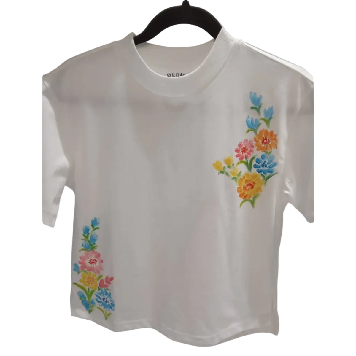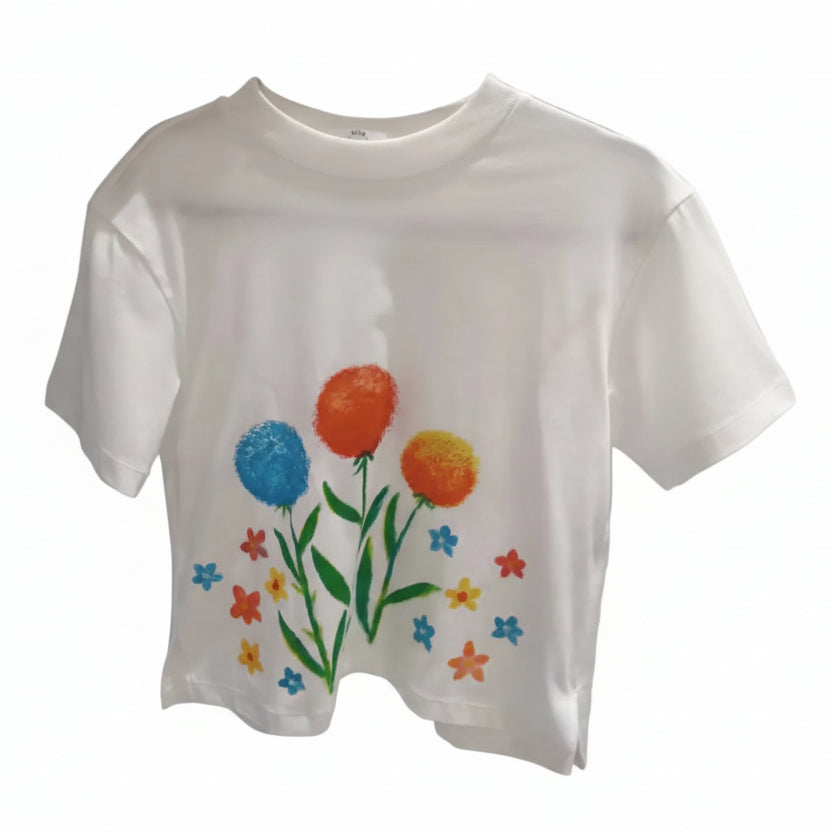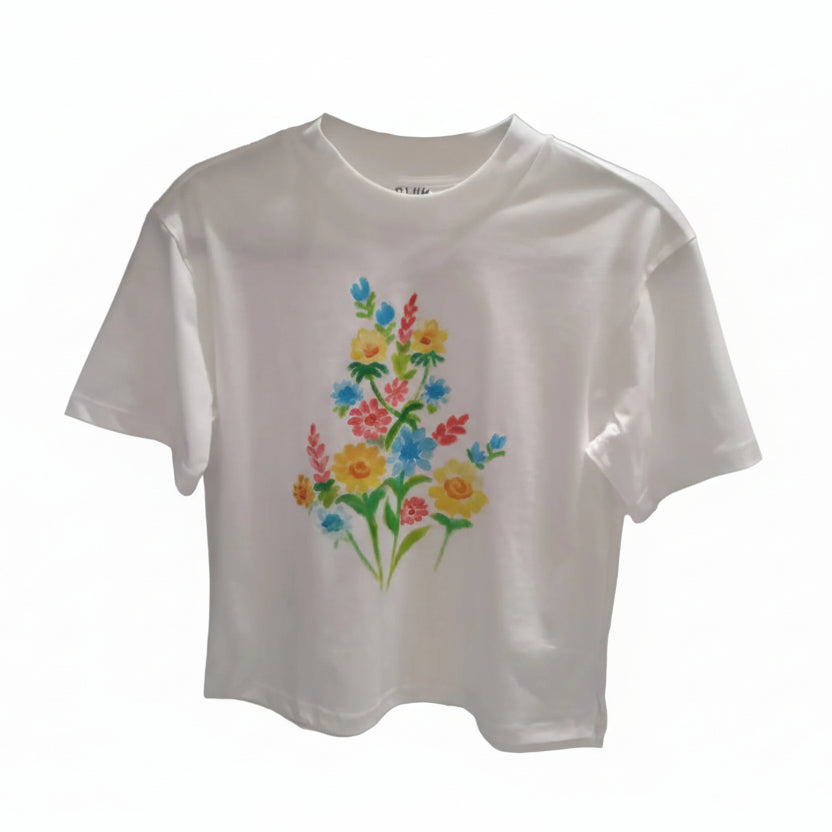 Round-neck white blouse in soft premium cotton, each hand-painted floral design is one-of-a-kind. Free-size silhouette blends everyday wearability with artisanal, luxury appeal, perfect for curated wardrobes.