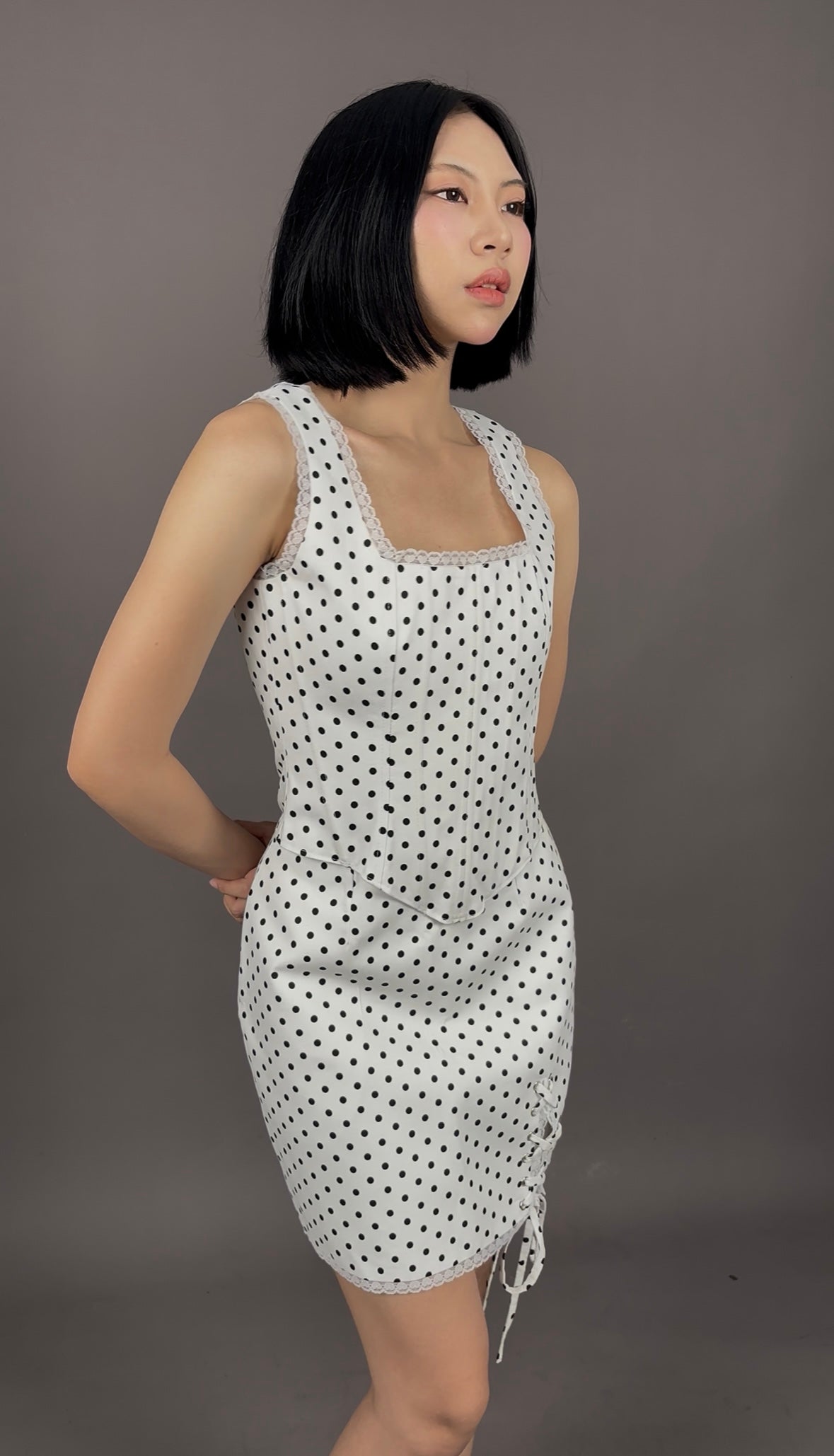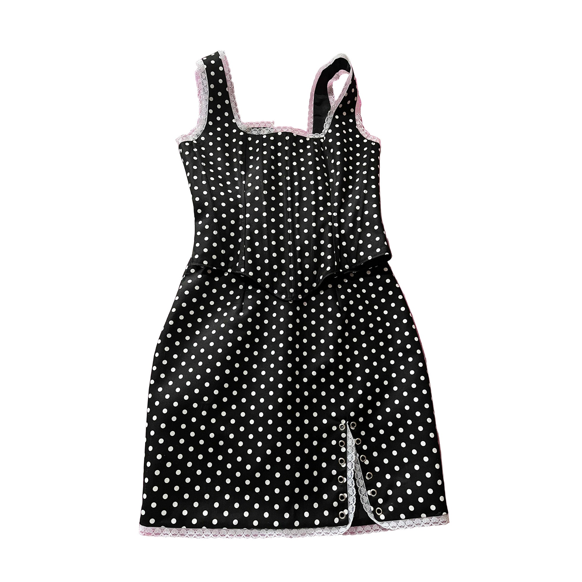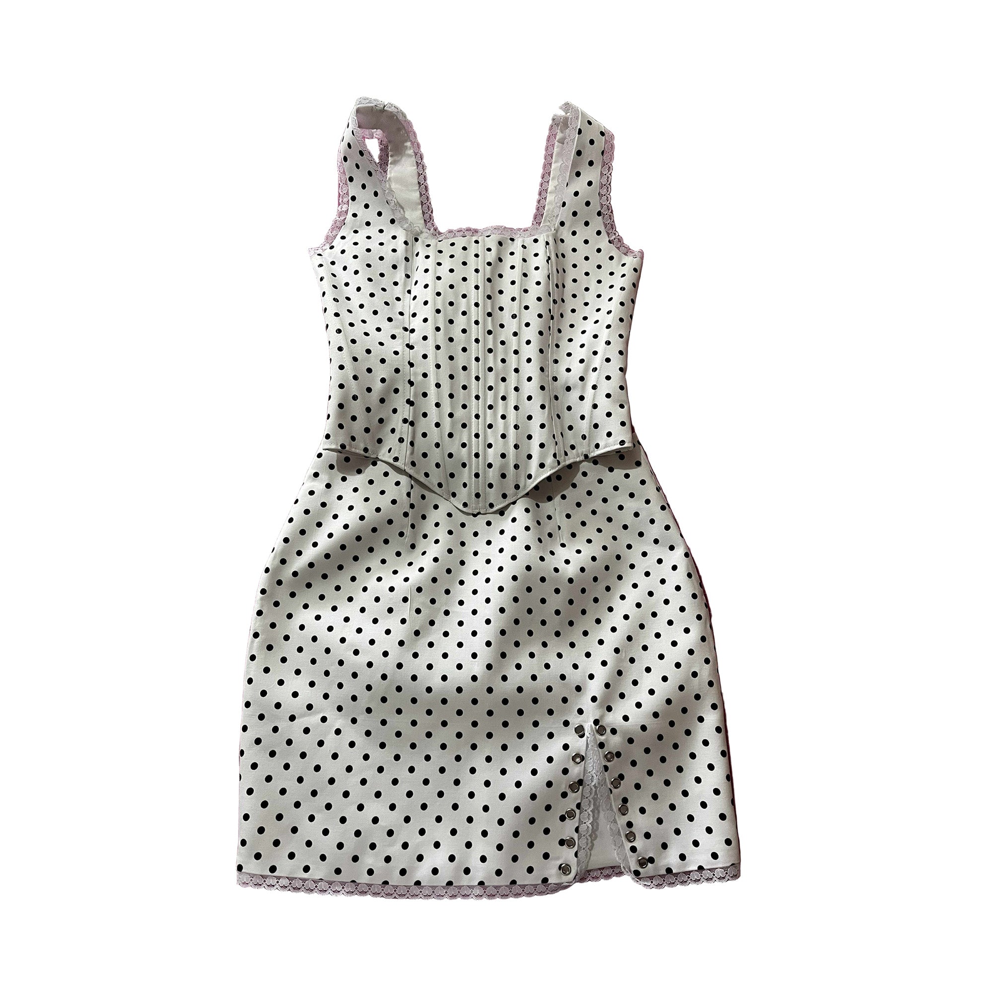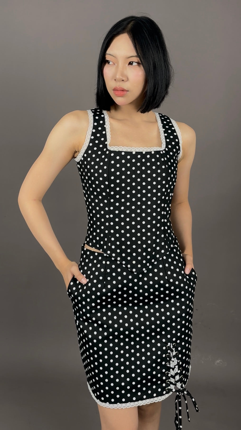 The Polka Noir corset and skirt set blends classic sophistication with playful whimsy. The corset features sleek black fabric dotted with crisp white polka dots, tailored to sculpt the silhouette with structured boning and delicate piping, while the matching skirt flows in soft waves.