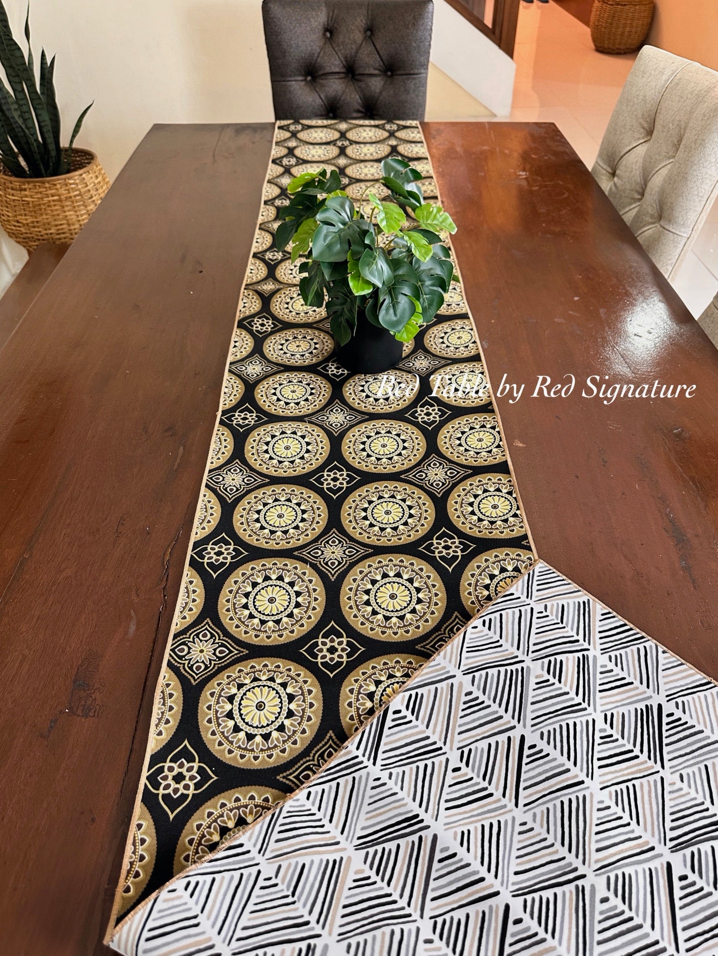 Transform your dining table with our premium reversible table runners. Featuring elegant lining, two stylish designs, and perfect fits for 6, 8, 10, & 12-seater tables.