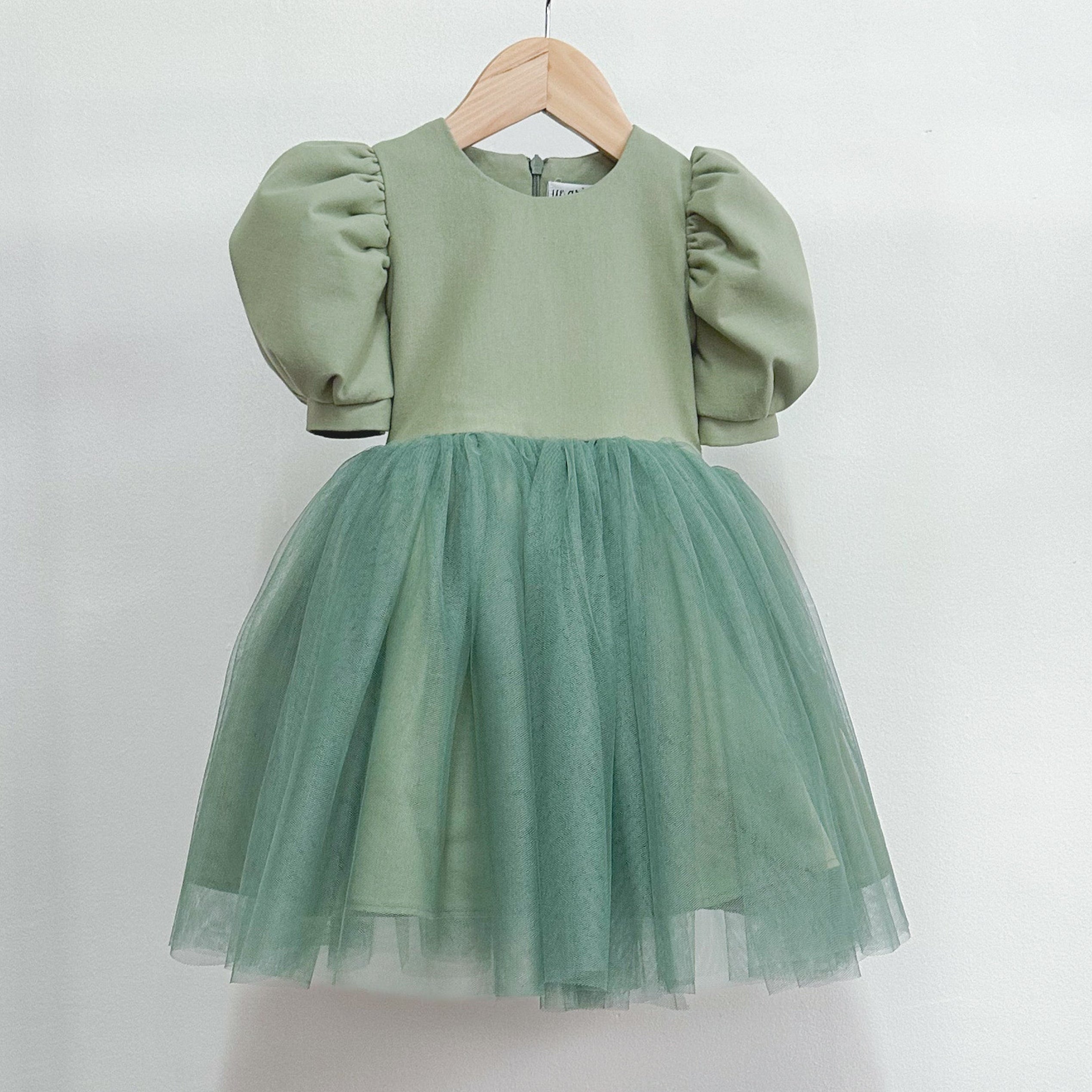 A classic Unaricci piece featuring puff sleeves and a below-the-knee balloon skirt in sage linen and layered tulle — a graceful blend of structure and whimsy.Size Chart: Age  Chest Waist Sh - Waist Hips Skirt Length 2-3yo 22" 20" 8 1/4" Free Size to follow 4-5yo 24" 22" 8 3/4" Free Size to follow 6-7yo 25" 22" 10" Free Size 19" 7-8yo 26" 24 1/2" 10" Free Size to follow 9-10yo 27 1/2" 24 1/2" 11" Free Size 19" 11-12yo 29 1/2" 27" 11 1/4" Free Size to follow