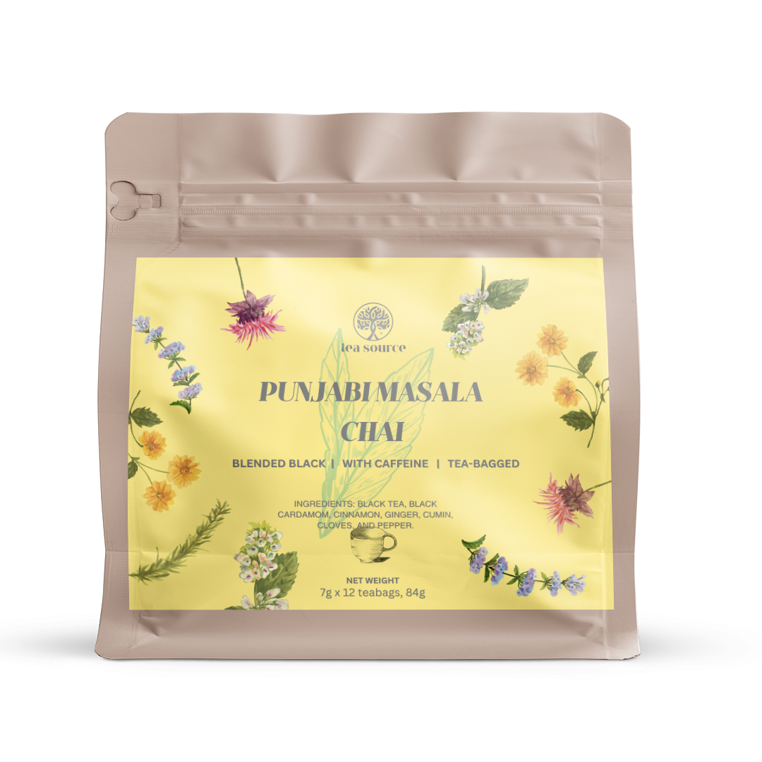 Punjabi Masala Chai offers a full-bodied black tea base complemented by the warming spices of black cardamom, cinnamon, ginger, cumin, cloves, and pepper. The spices bring a fiery kick with earthy, aromatic sweetness, while the black tea provides a strong, malty foundation. Each sip is a bold combination of heat, spice, and a touch of sweetness.