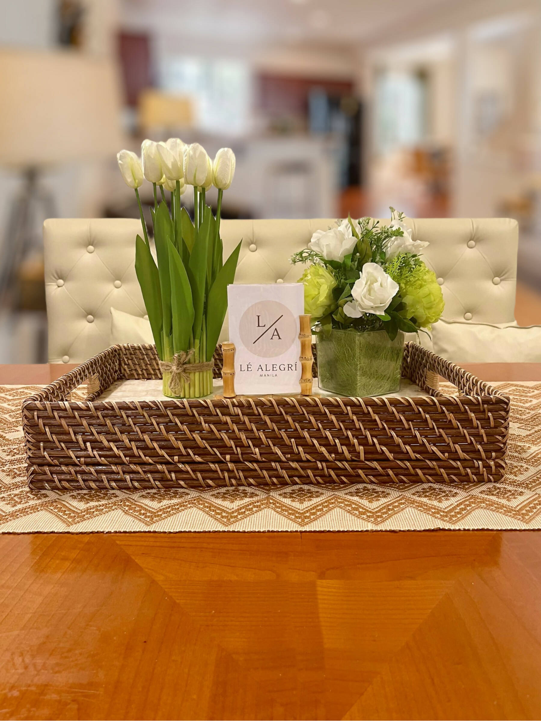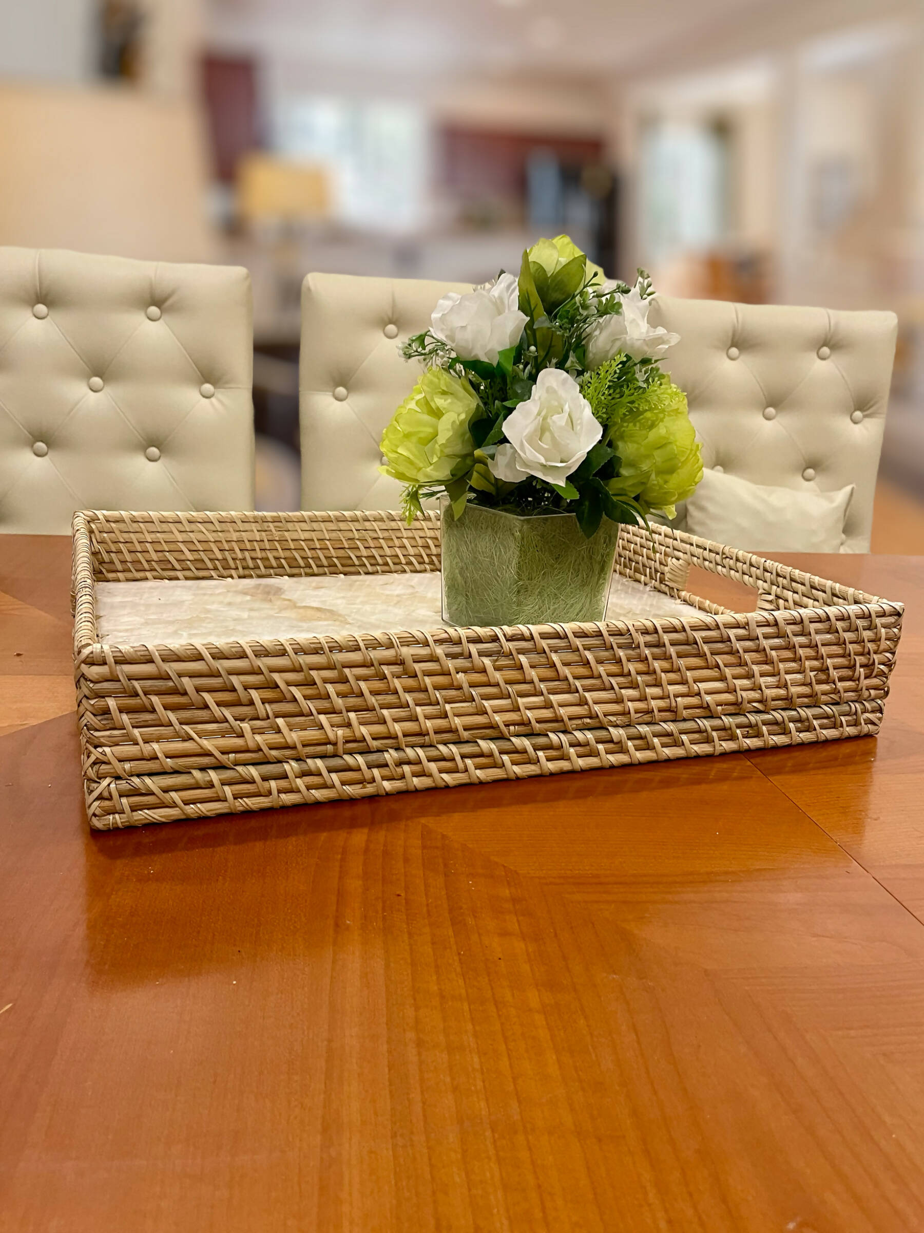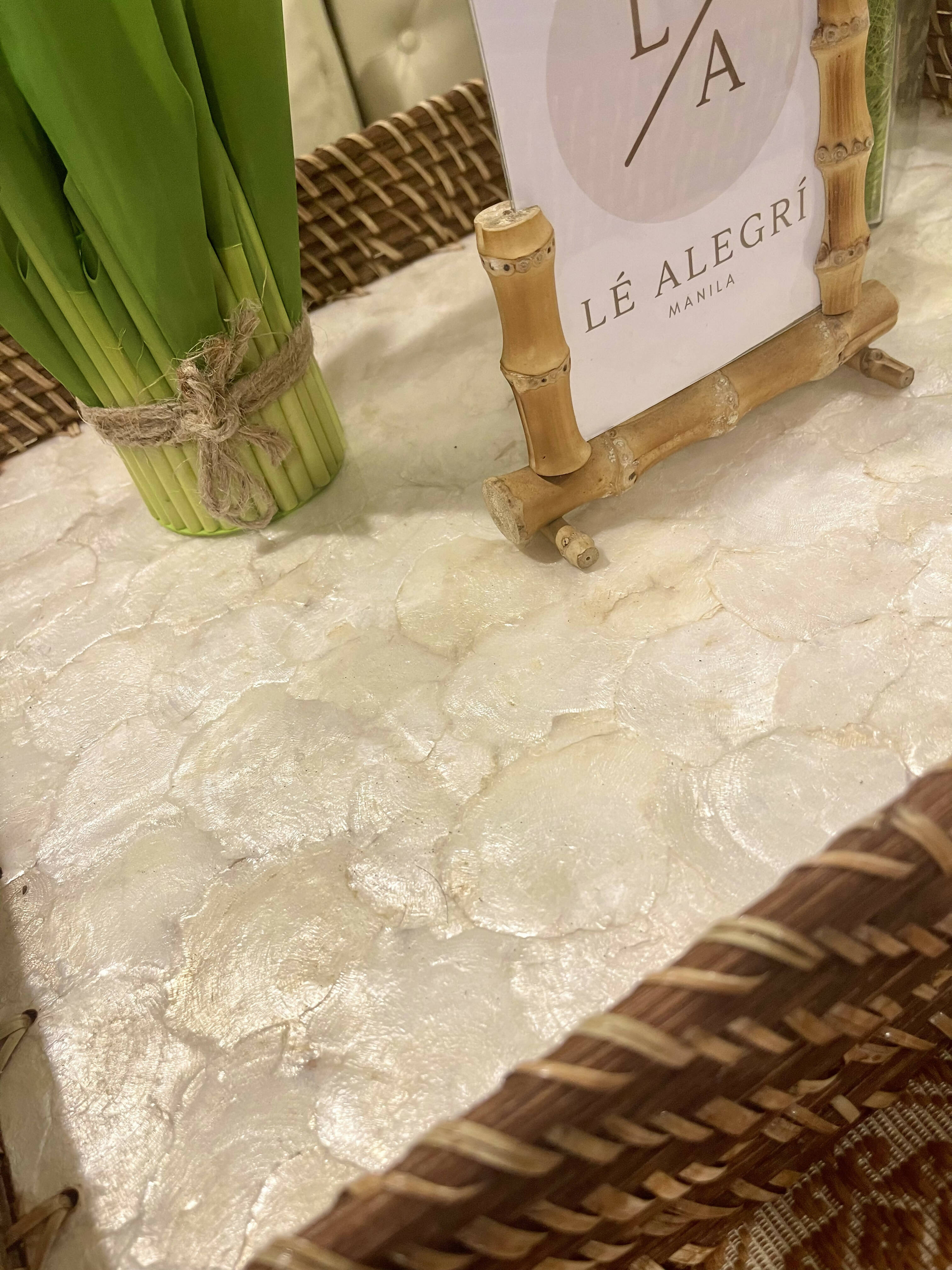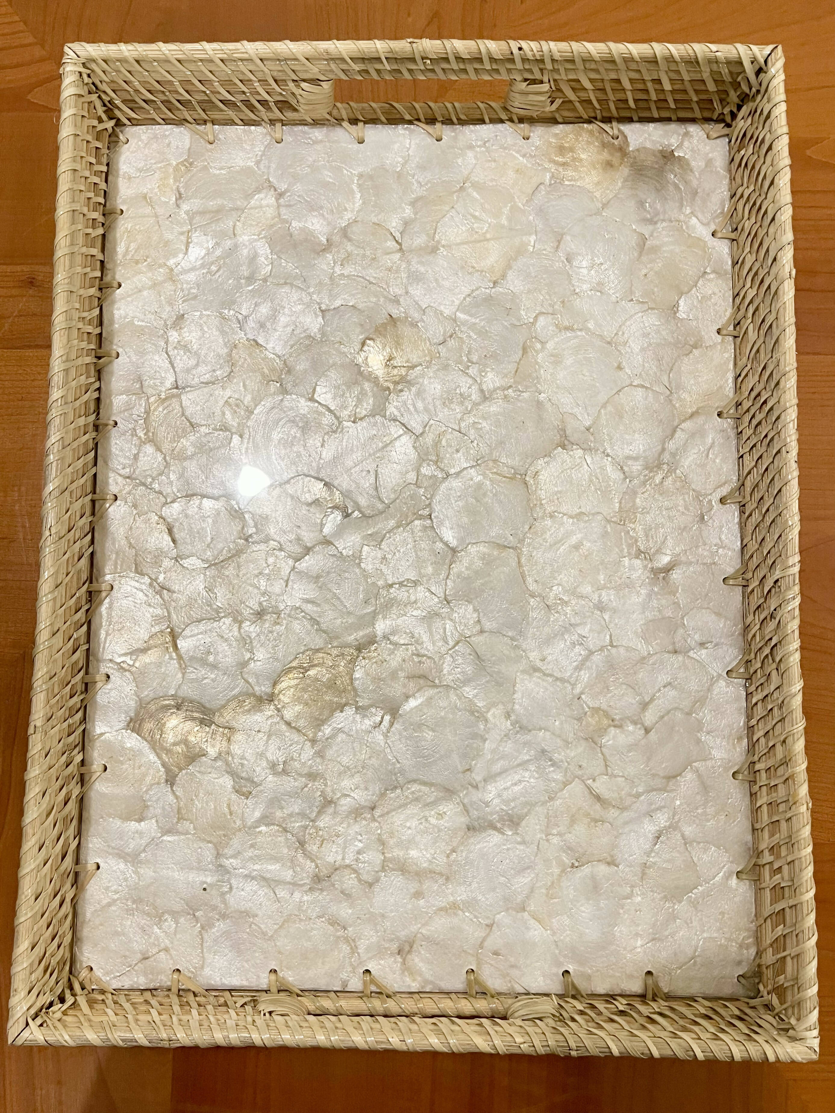 Well crafted decorative wicker tray with intricate pearlized in lay. Laminated to perverse its beauty. Heavy duty and decorative! Made to perfection for all of your occasions.