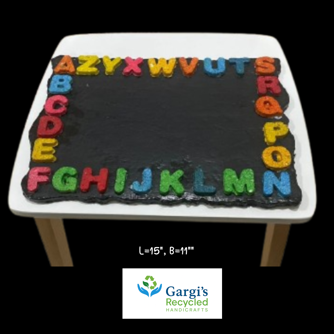 Encourage learning while caring for the planet with this handmade blackboard slate! Made from shredded paper, it is sun-dried, lightweight, durable, and sustainable. Featuring vibrant alphabet borders, this eco-friendly writing pad makes learning fun for kids while promoting environmental awareness.♻️ Sustainable | Handmade | Educational📏 Size: 15" x 11"🌱Perfect for early learners, classrooms, and creative play!