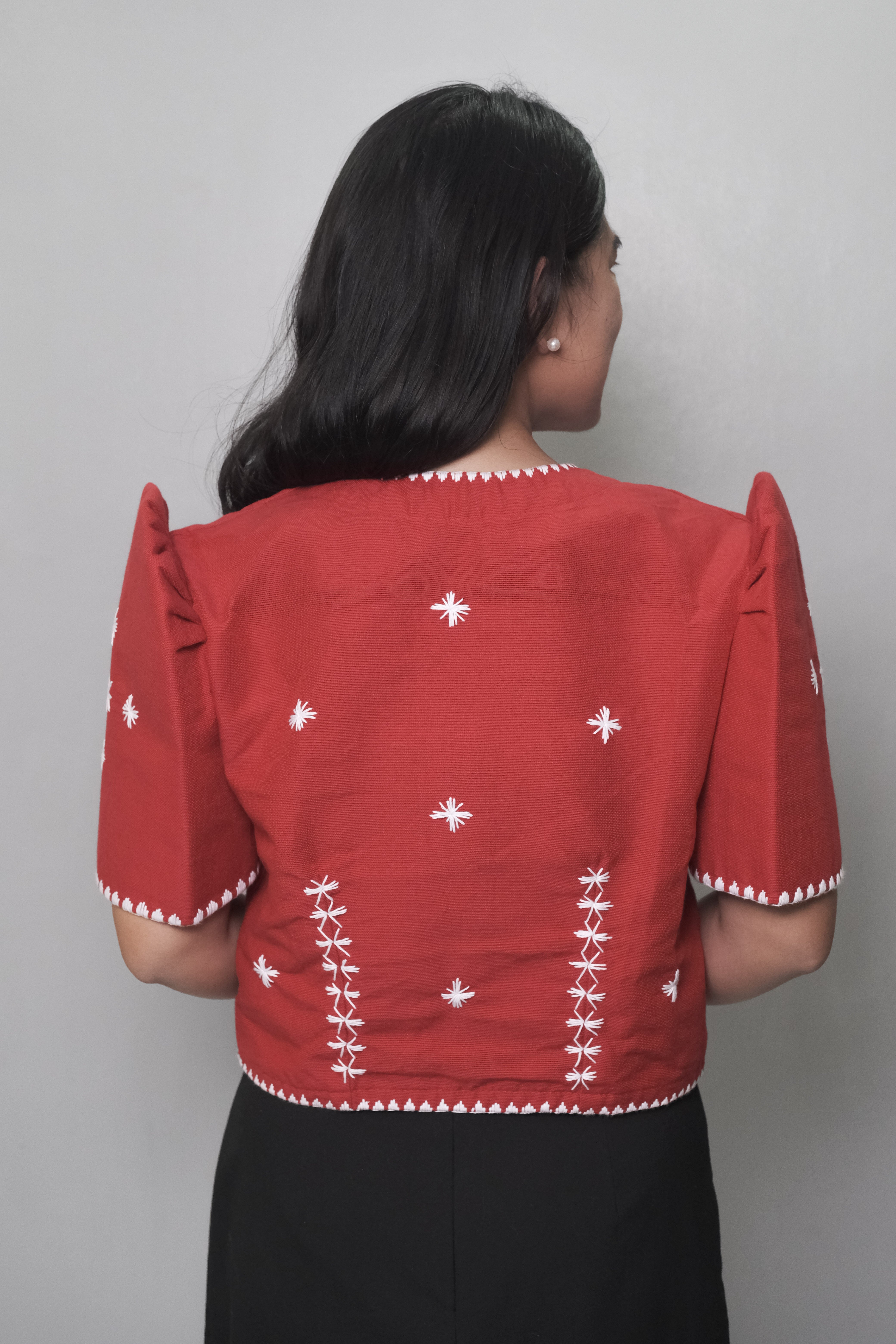 Handmade Bolero in Red Kantarines weave with white handstitched embroidery by Itneg artisans. Part of our Modern Filipiniana collection.