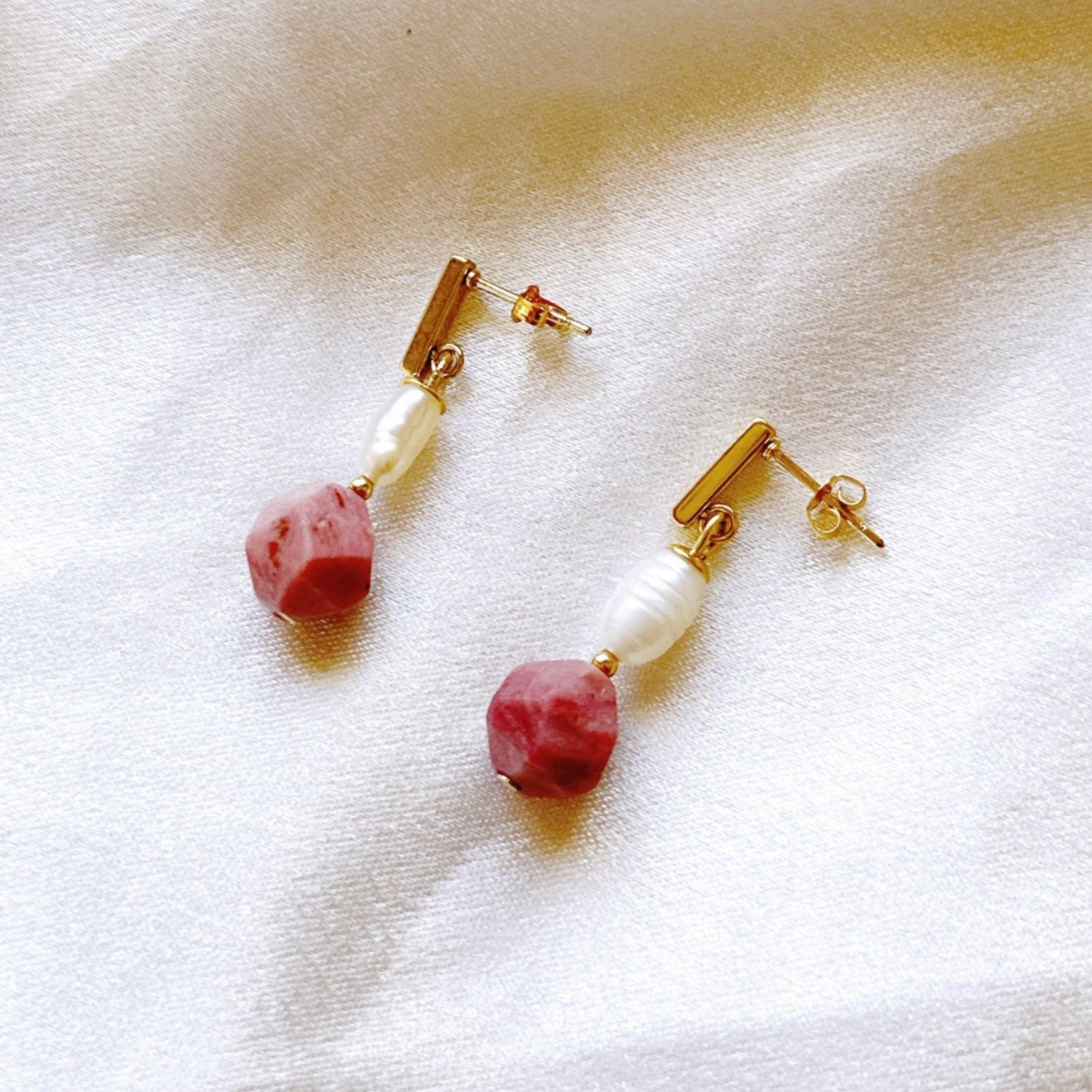 made with natural rhodonite gemstone and rice pearl hanging delicately on a stainless steel bar stud.