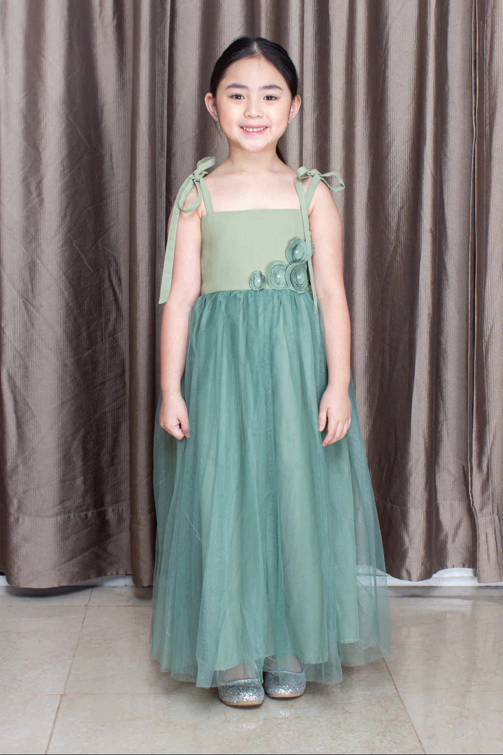 Upper body and straps are linen in fabric, upper body is semi loose and not meant to be fitted with adjustable straps. Fabric: Linen, Tulle Color: Sage Size Chart: Age  Chest Waist Sh - Waist Hips Skirt Length 4-5yo 24 1/2" 24" adjustable covered 4 3/4" Free Size 21 1/2" 6-7yo 25 1/2" 25 1/2" adjustable covered 5 1/2" Free Size 25 1/4" 7-8yo 26 1/2" 26" adjustable covered 5 1/2" Free Size 26 1/4" 9-10yo 28" 27 1/2" adjustable covered 6 1/2" Free Size 29"