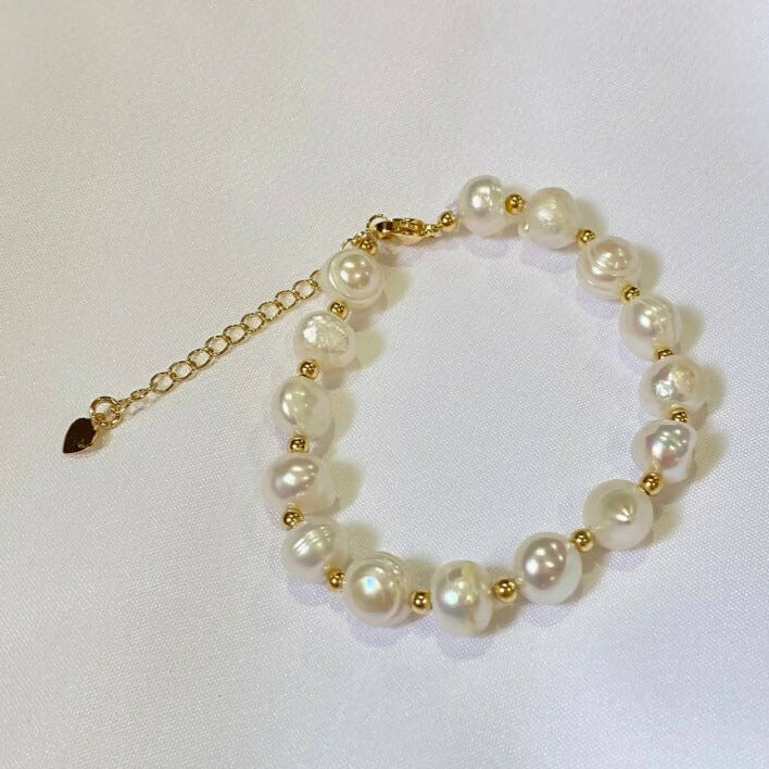 Freshwater Pearl Bracelet Material: Gold Plated Lock with Extension Length: 8-10 inches Shape: Potato Size: 8-9 mm Spacer: Gold Plated Balls