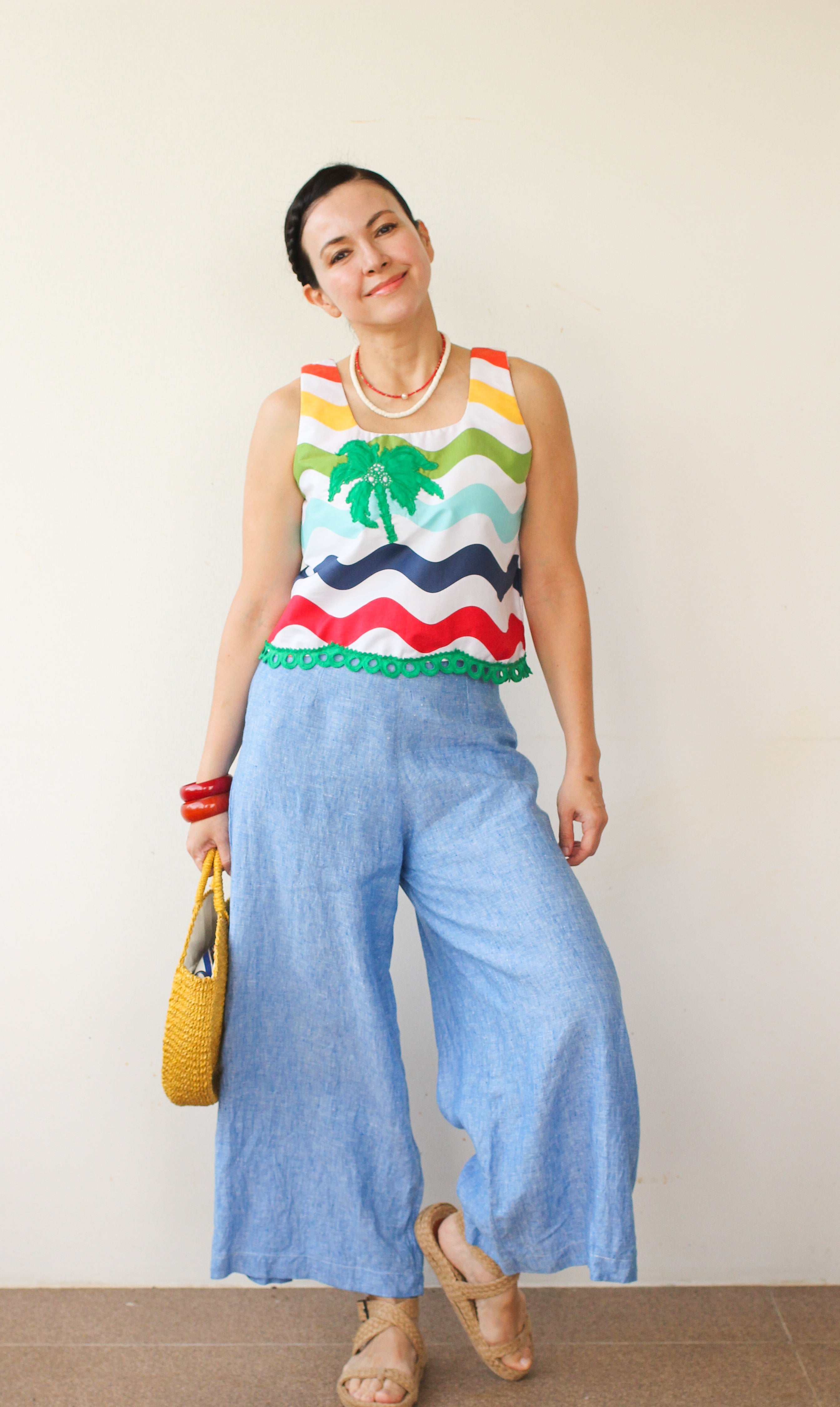 Meet Rio – your new go-to for effortless summer style! This top is designed to make a statement with its bold, colorful striped curve pattern, complemented by delicate embroidery and eyelet accents.