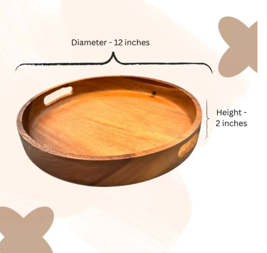 Elegant wooden tray with natural wood grain. Available in round and rectangle. Heavy, durable, and expertly crafted for home or serving use.