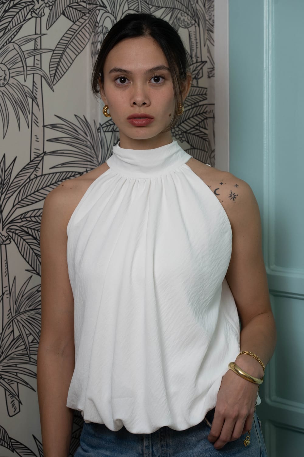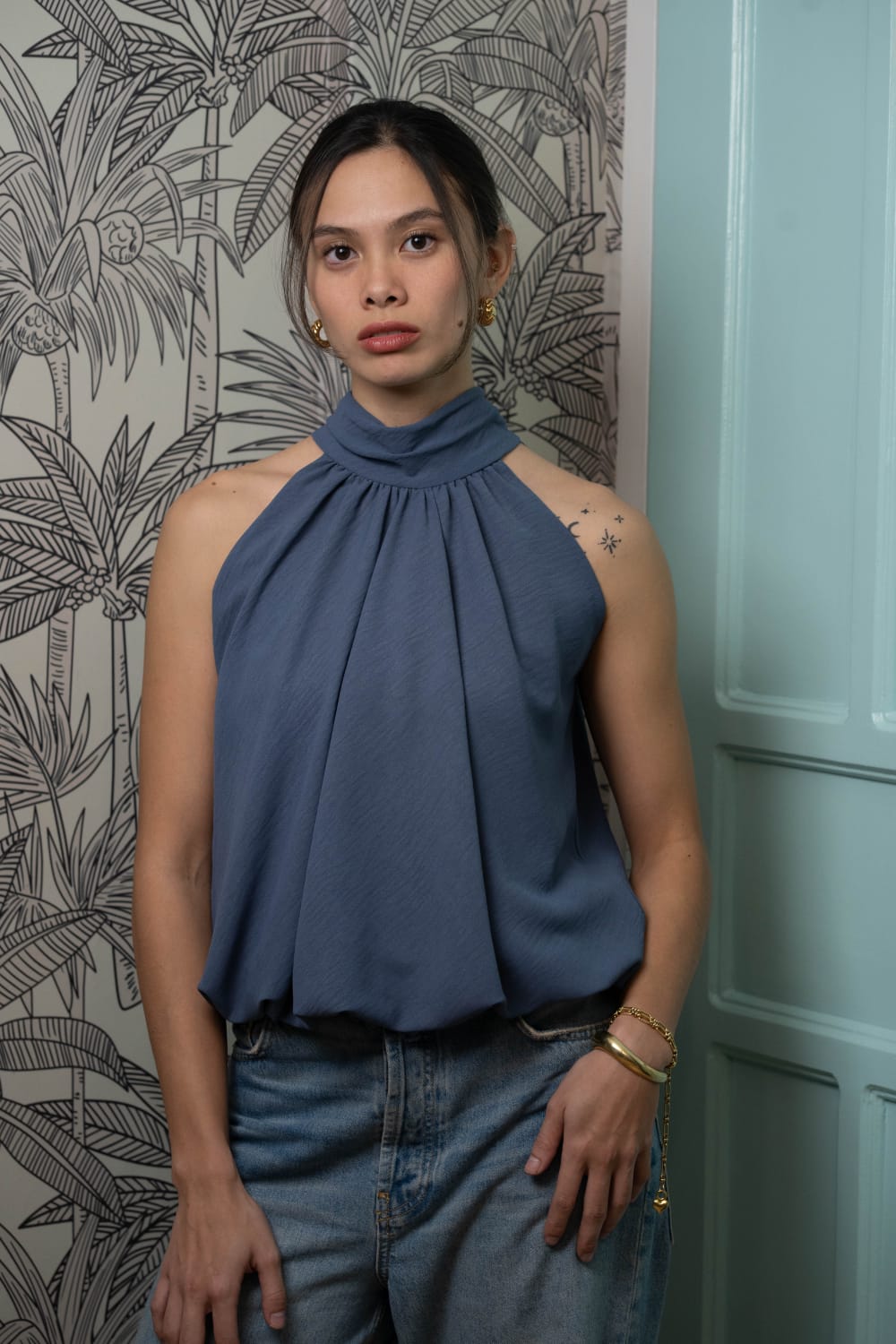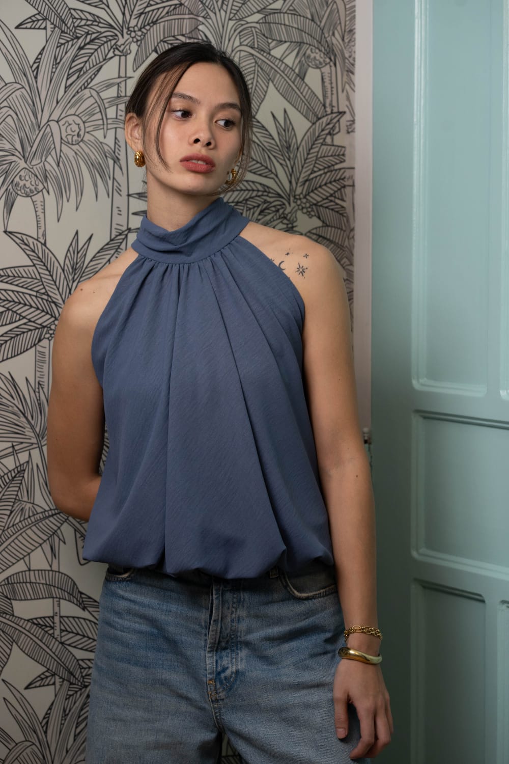 Crepe bubble halter tops with tie detail on the neck.