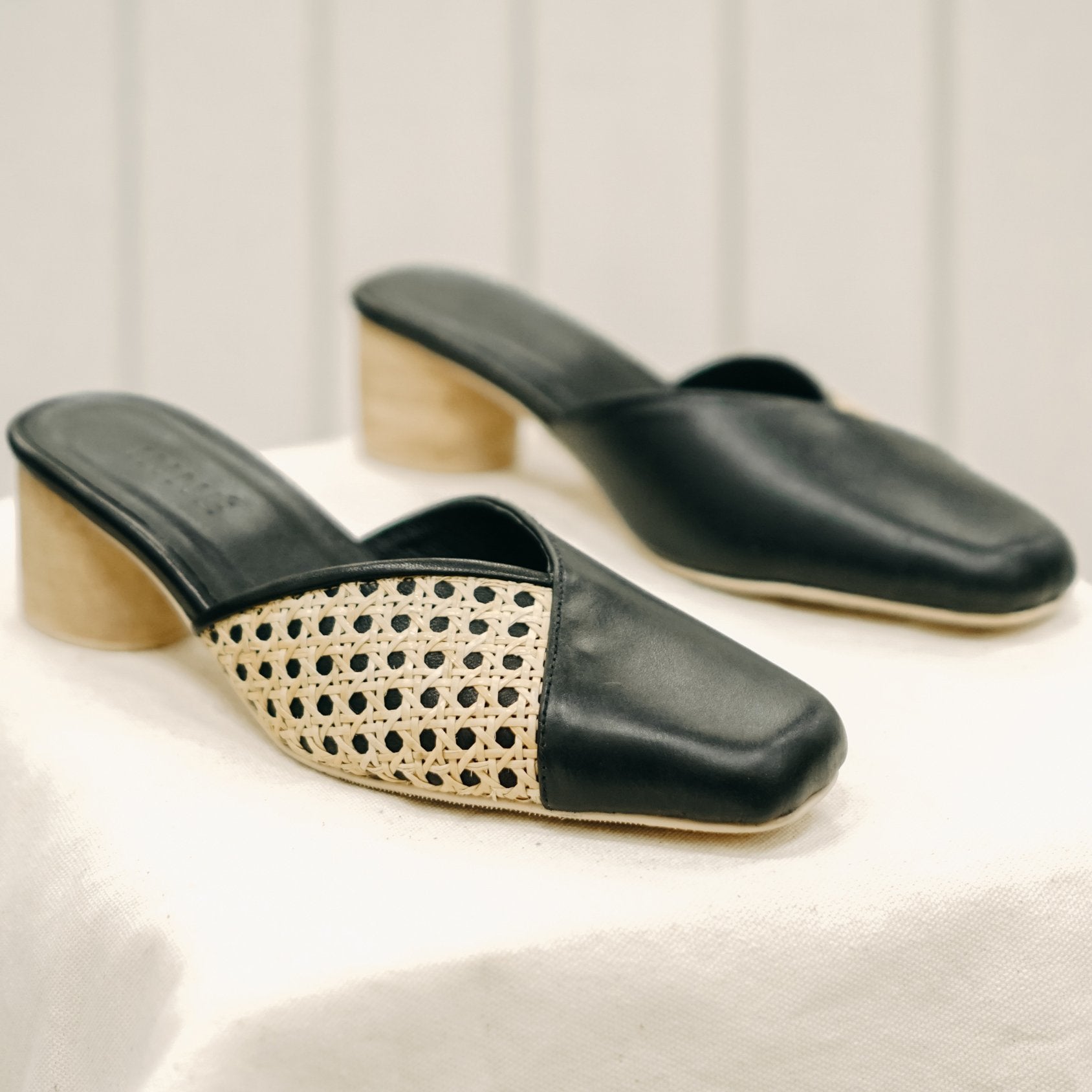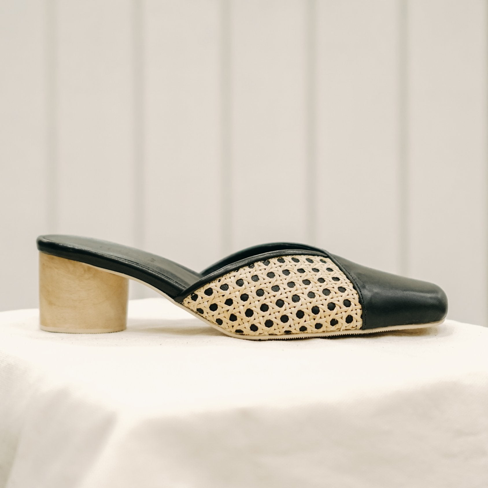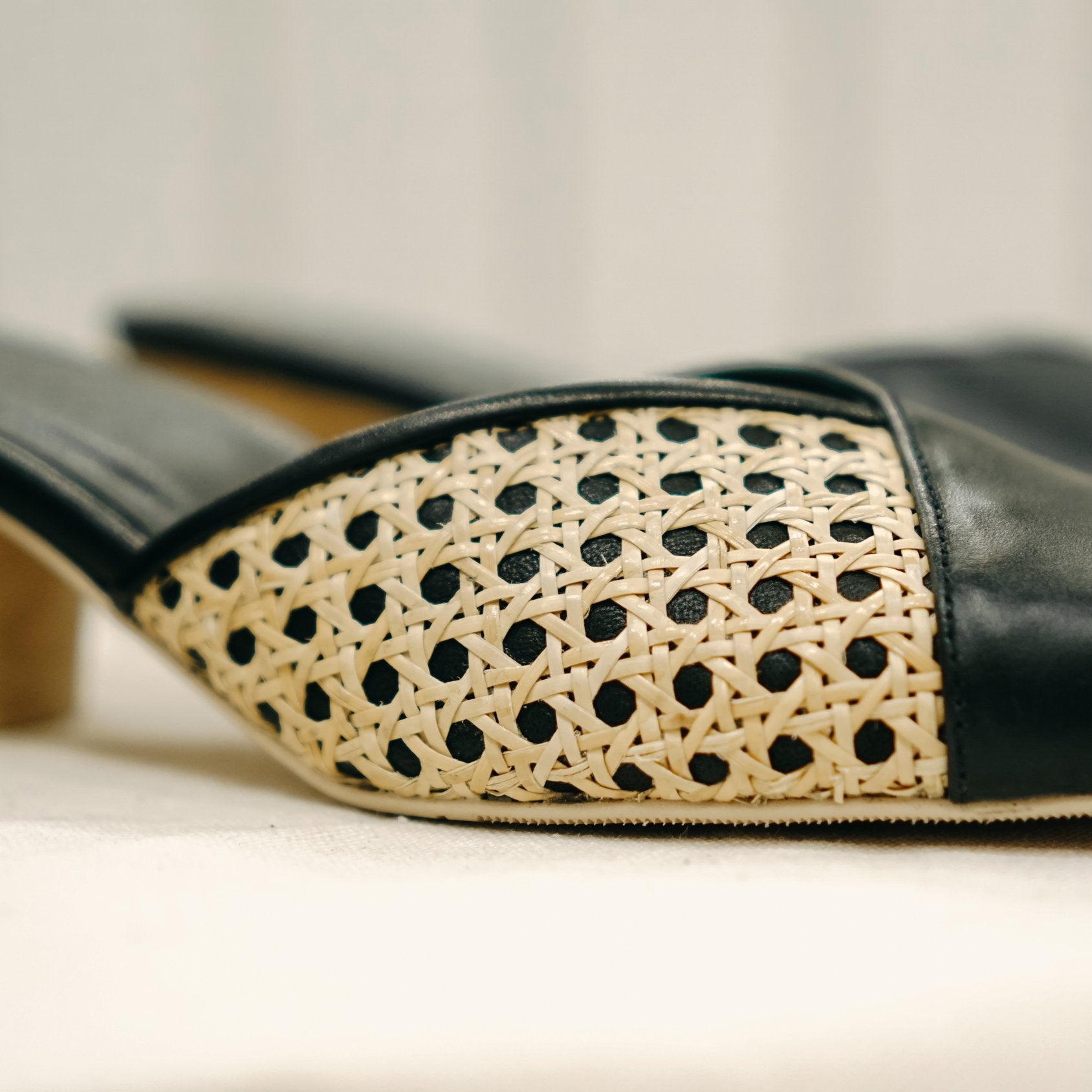 An asymmetrical, square toe mule with a cylindrical wooden heel that can easily take your look from day to night. Represents the merging of past and present, with overlapping layers of handwoven rattan in traditional solihiya weave and genuine leather.This piece uses thin strands of rattan handwoven into sunburst patterns, known as solihiya in the Philippines. Typically used for making baskets and furniture, this naturally sustainable material is lightweight, durable, flexible, and suitable for outdoor use.Sizes run big for this style. We recommend going a size down if you are in between sizes or have narrow feet. See our Size Guide for more information. Handwoven rattan upper Genuine cowhide leather Genuine soft lambskin leather underlay and trim Soft leather lining Cushioned insoles for extra comfort 2" cylindrical wooden heel Rubber sole Care: Use of leather protector is recommended before wear.