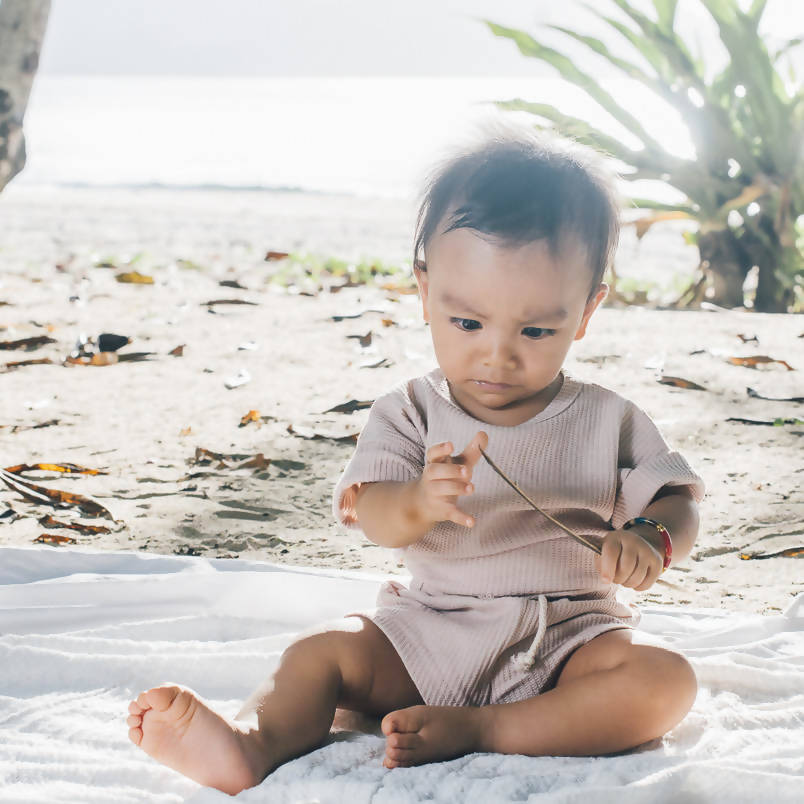 (Veya & Bloom)The Sandy Set, made for every day play from buttery soft organic waffle cotton material. The shorts are loose fitted with plenty of room and have an elasticated waist band with functional thick rope tie. This material has some stretch, the top is slightly oversized and the shorts are true to size, we love them best styled up for an oversized look.
