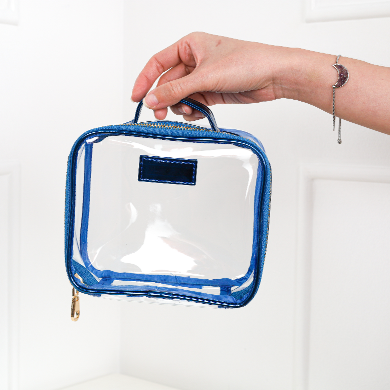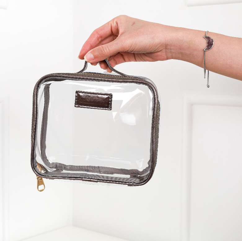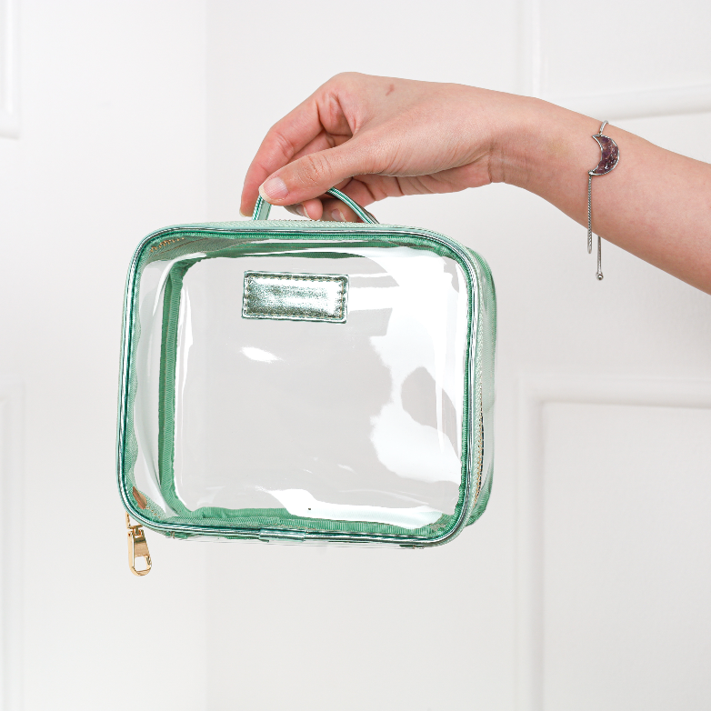 Features: Clear PVC body for quick visibility Glossy trim in vibrant shades Gold-tone zip closure with easy-pull tab Top handle for easy carrying Water-resistant and easy to wipe clean Dimension: H: 15 x L: 18 x W: 7 cm