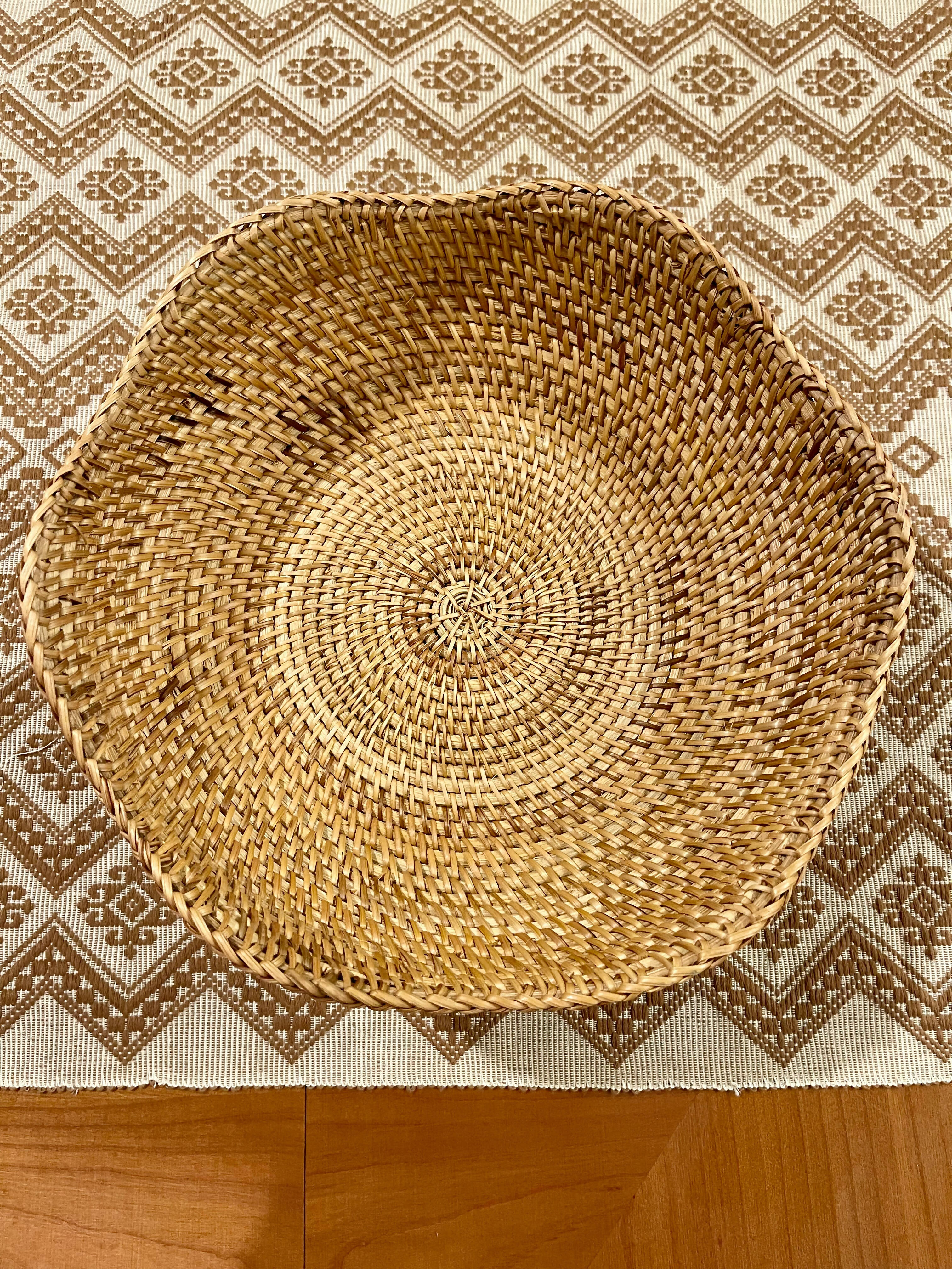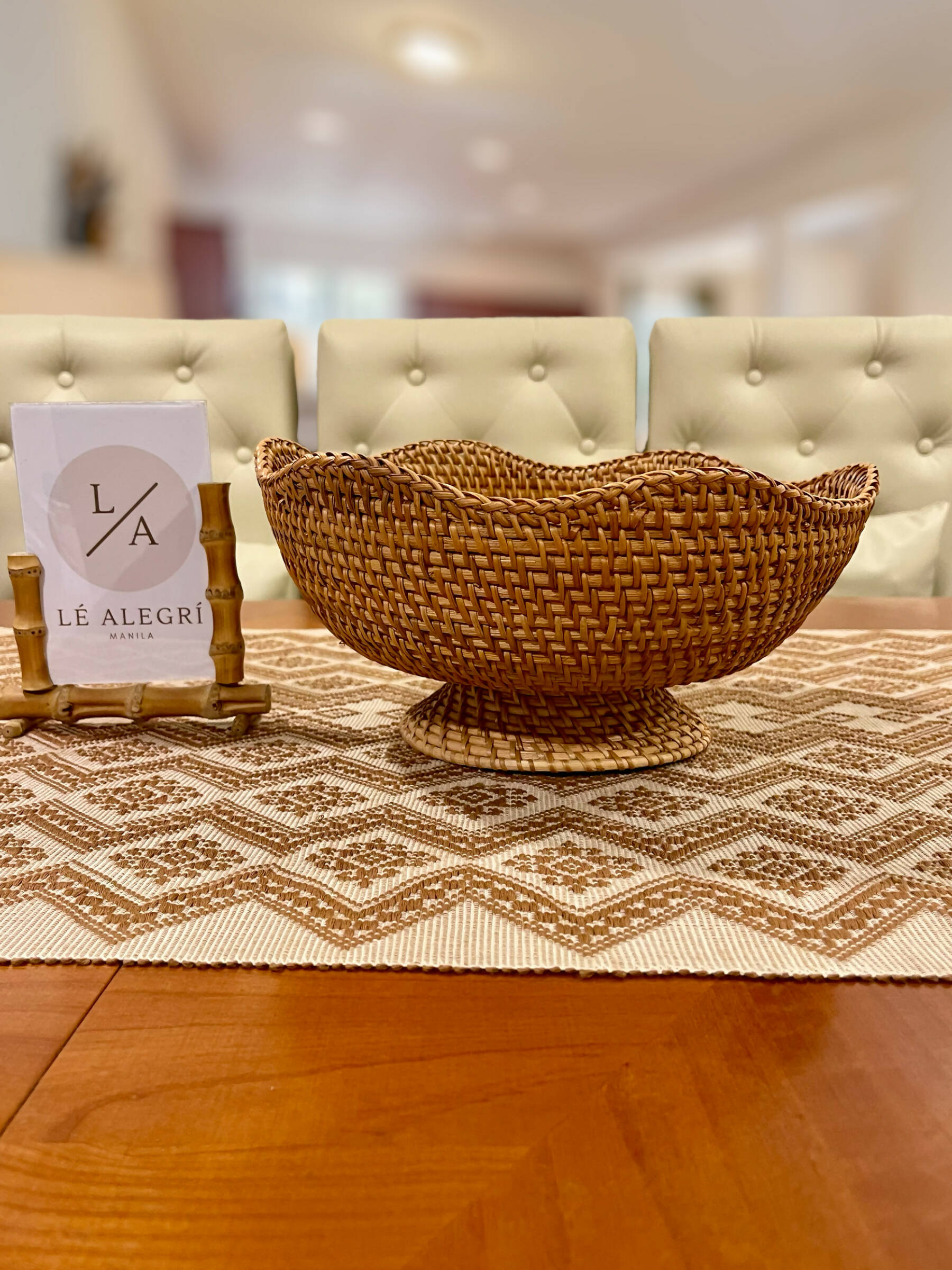 Towered scalloped fruit basket, handwoven and intricately made to give life to dining or console table.