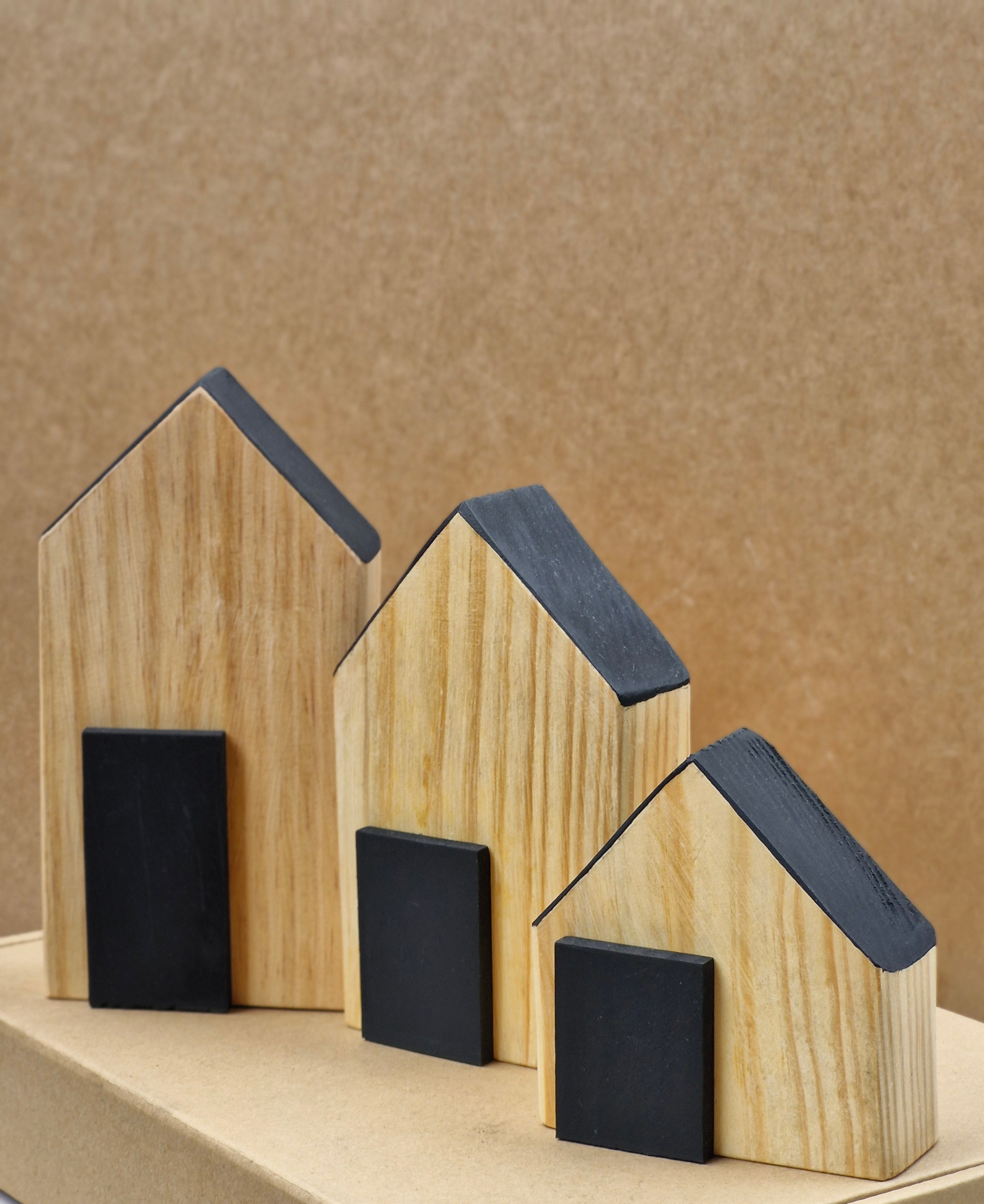 A capsule of quiet geometry and minimalist elegance.  Palette: natural wood, black noir Handmixed, non-toxic chalk paint Crafted from sustainably sourced local wood Sealed with beeswax wood balm for lasting durability Accenduated with bold doors and varying heights that form an asymmetrical set--bringing balance and visual interest Perfect for gifting, styling, or grounding a space in quiet character. Dimensions (in cm) Variant Height Width Thickness 1 9.5 9.5 4.0 2 14.5 9.5 4.0 3 17.0 9.5 4.0 Note: As each piece is fully handmade, minor size discrepancies may occur. These variations reflect the natural charm and individuality of every Moodlet.