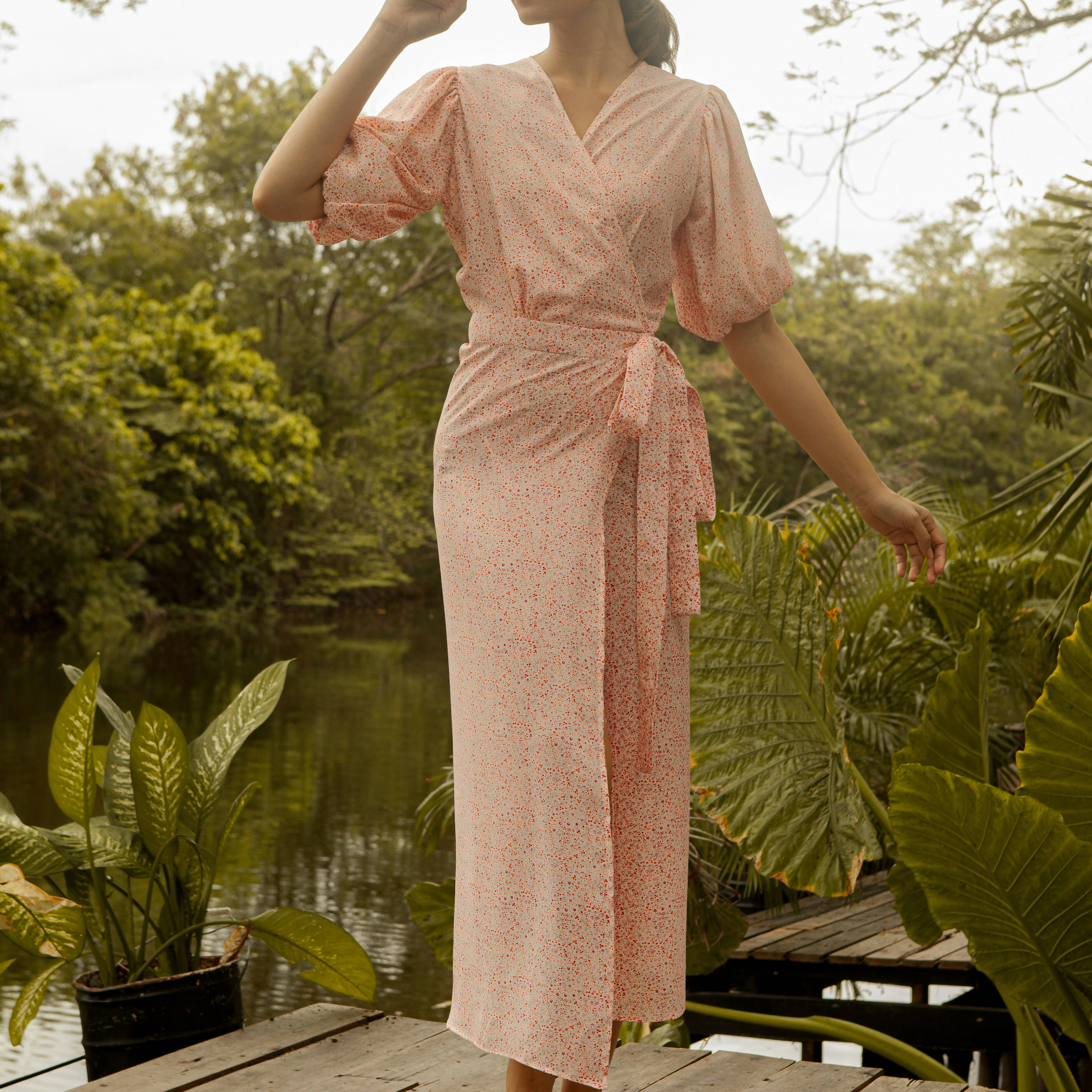 Tie on the side for an overlap front wrap dress or a front tie for a sexier take on the dress.  Wear as a cover up, best paired with bikini or swimsuit during holiday trips, bandeau / sleeveless top and pants for city life. Style: Women’s Dress Mushroom Sleeve, Zero Button, Tie Waist Closure, Floor Length Fabric Composition: Lightweight Crepe Care instructions: Gentle hand wash or dry-cleanable   Size Chart: S: Bust 34”, Waist 27” M: Bust 37”, Waist 30” L: Bust 40” Waist 33” XL: available soon! XXL: available soon! Length: Shoulder to Hem 53" Model's measurements are 5'10" and 31-24-35.