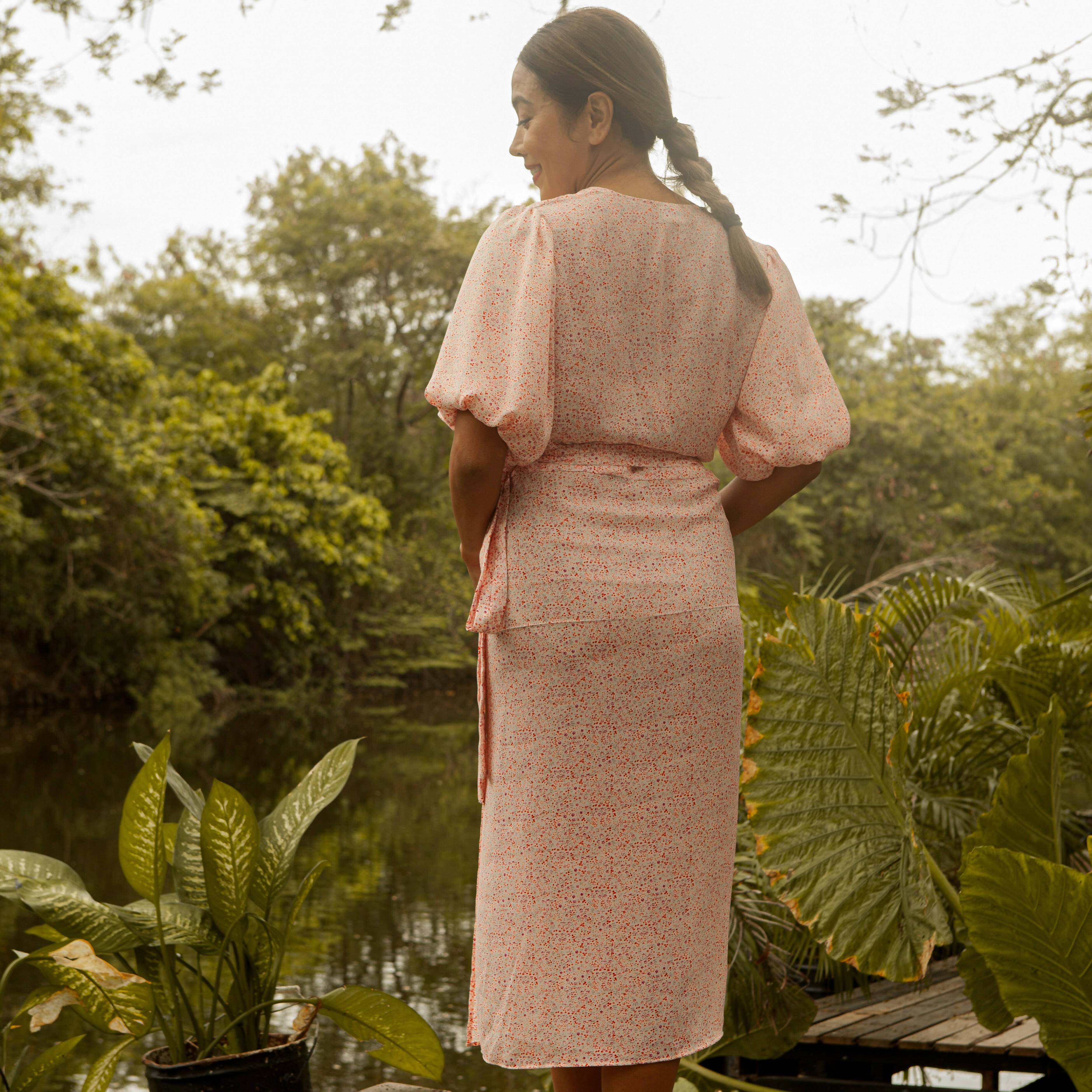 Tie on the side for an overlap front wrap dress or a front tie for a sexier take on the dress.  Wear as a cover up, best paired with bikini or swimsuit during holiday trips, bandeau / sleeveless top and pants for city life. Style: Women’s Dress Mushroom Sleeve, Zero Button, Tie Waist Closure, Midi Length Fabric Composition: Lightweight Crepe Care instructions: Gentle hand wash or dry-cleanable   Size Chart: S: Bust 34”, Waist 27” M: Bust 37”, Waist 30” L: Bust 40” Waist 33” XL: available soon! XXL: available soon! Length: Shoulder to Hem 47" Model's measurements are 5'7" and 34-27-36.