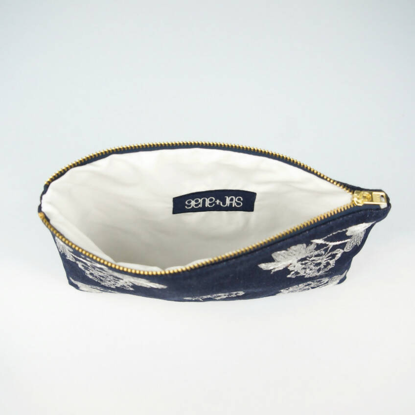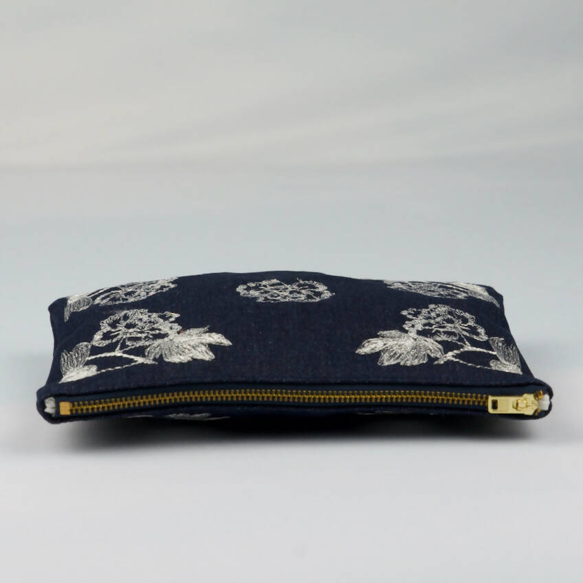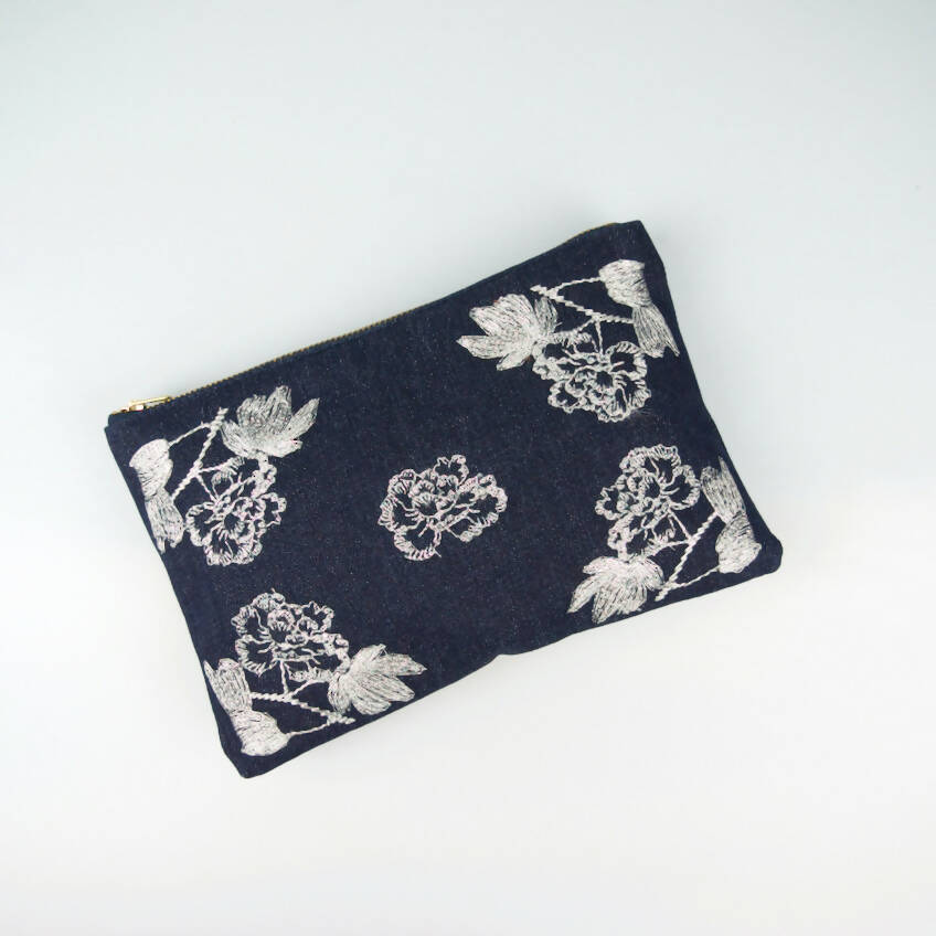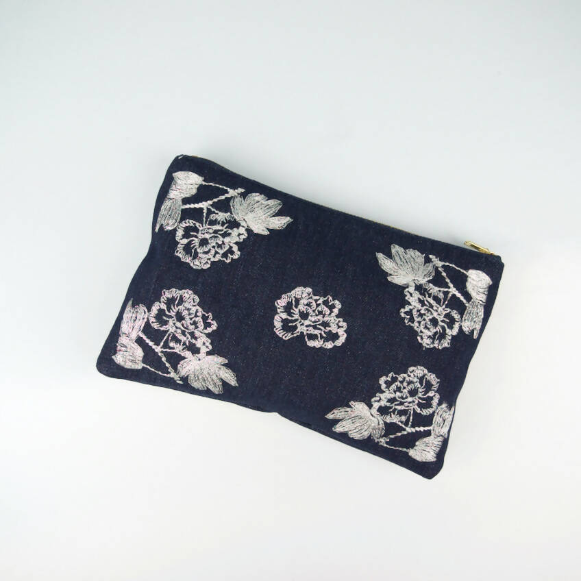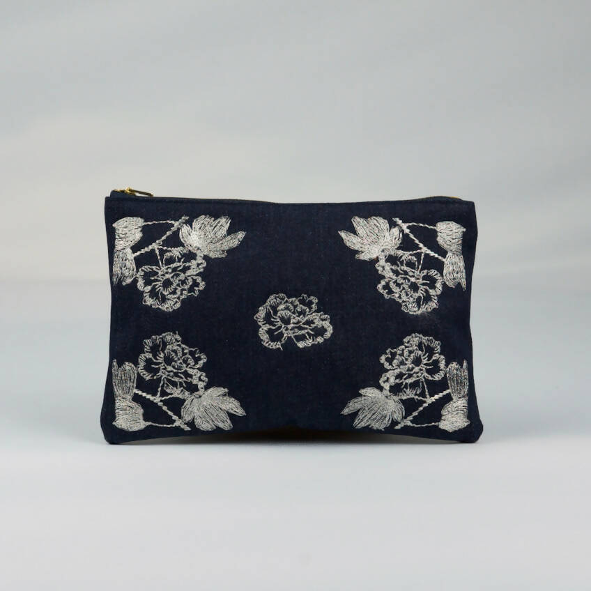 Silver Lotus Flower on Small Denim Zip Up Pouch