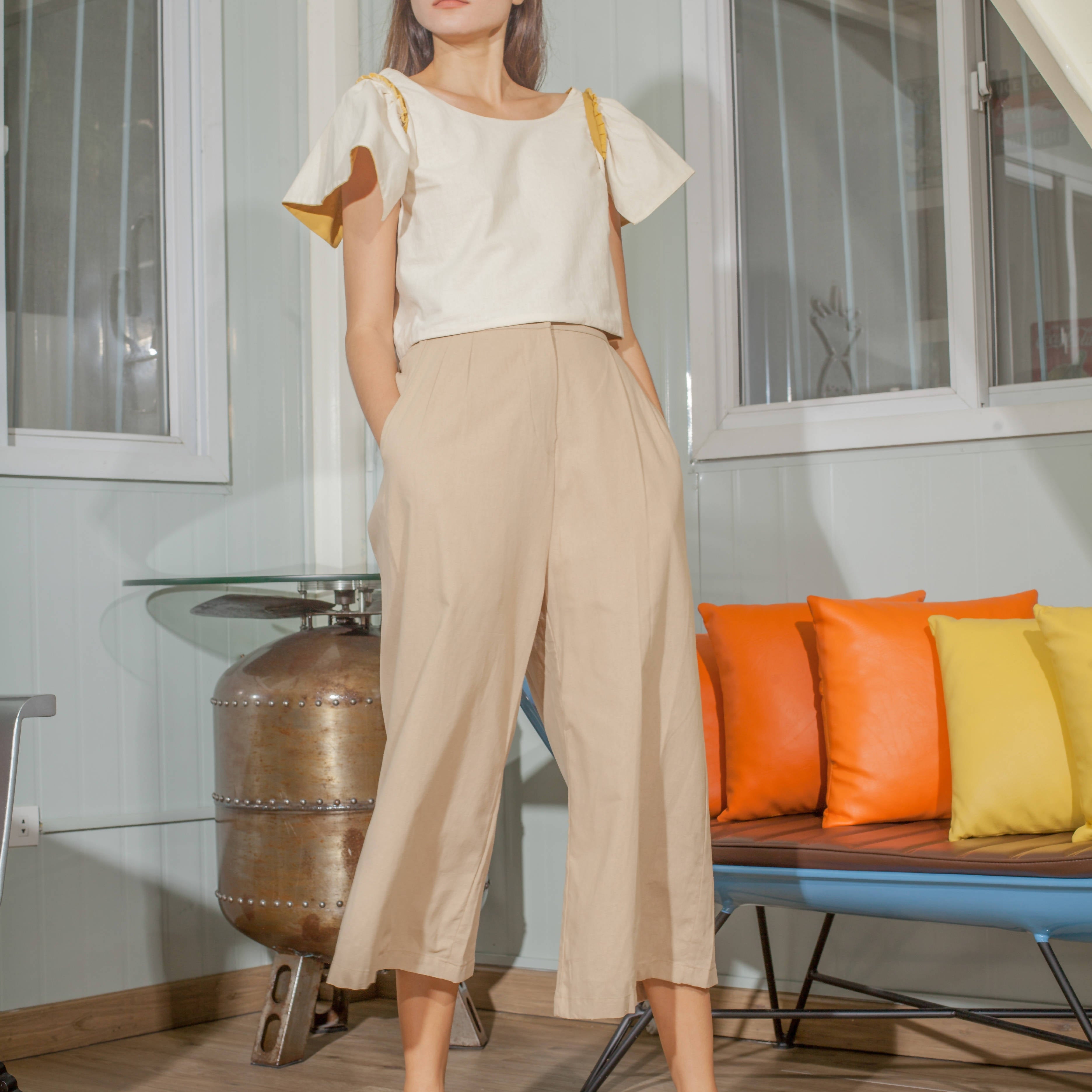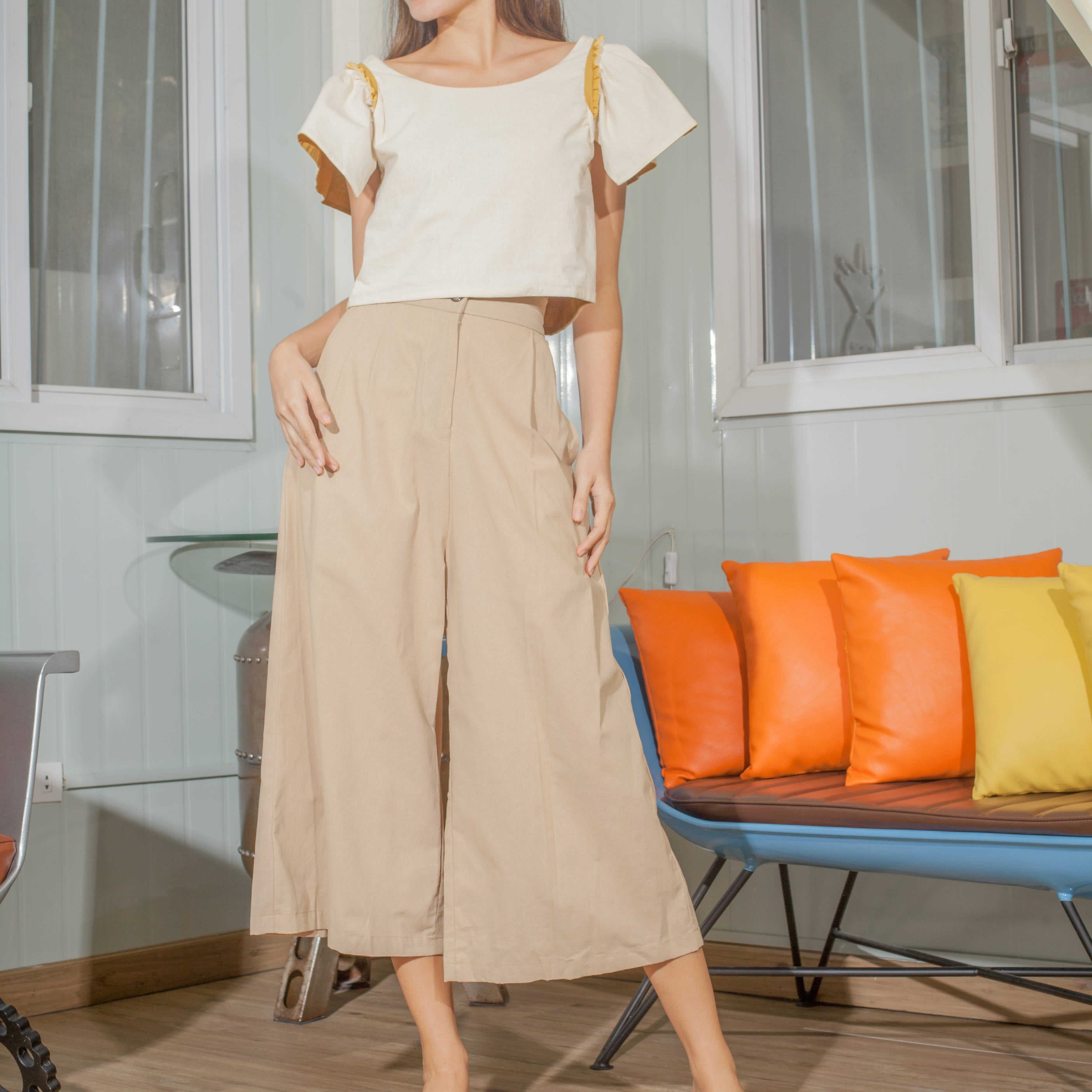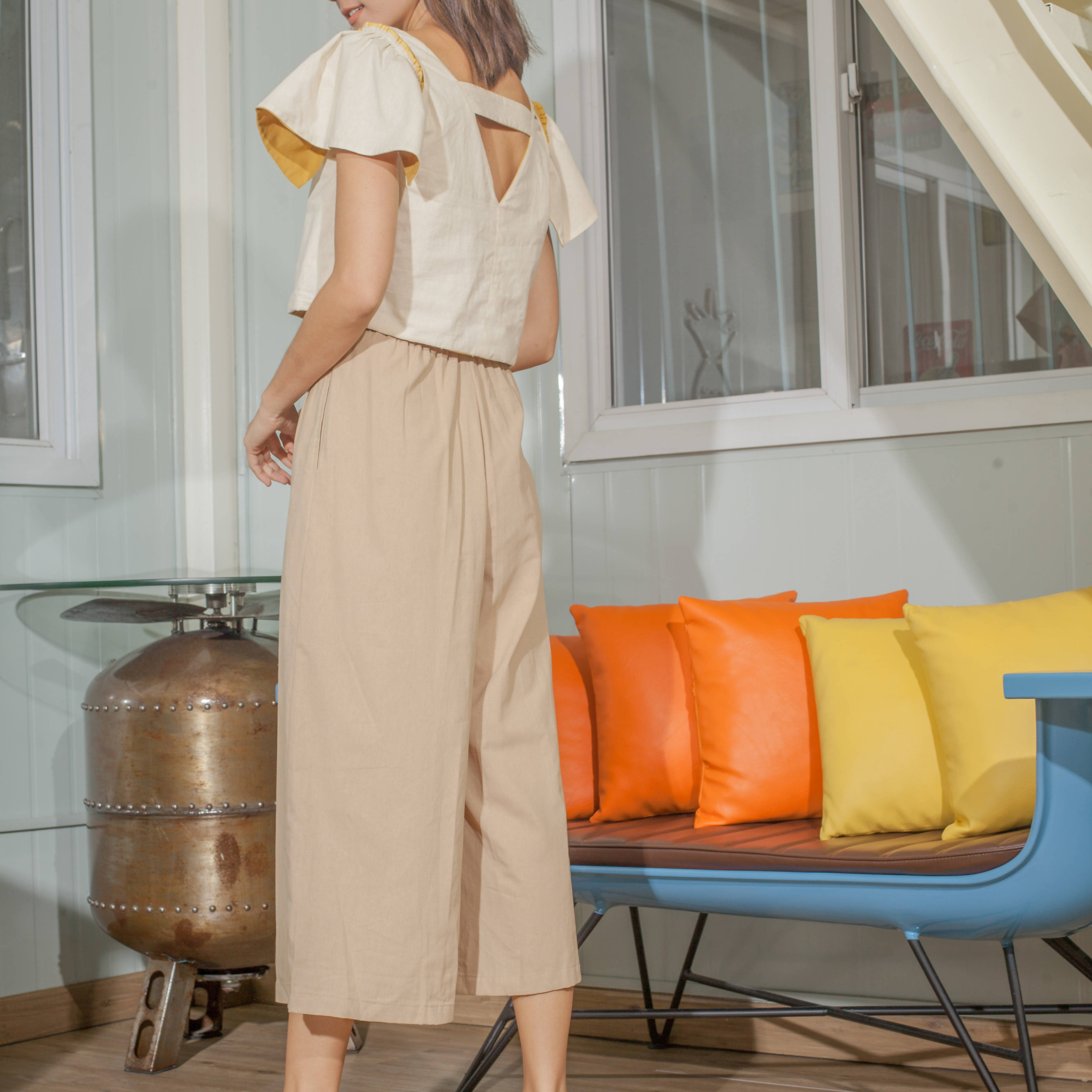 Style: Women’s Pants Available in 7 Colors: Nude, Dark Tan, Mustard, Dark Brown, Dark Emerald, Copper and French Navy Flat Front Waistband, Single Button Detail, Back Elastic, Wide Hem Pants Fabric Composition: 100% Linen, Lightweight Fabrication Care instructions: Gentle hand wash or dry-cleanable Size Chart: S: Waist Relax 24” Stretch 27” M: Waist Relax 27” Stretch 30” L:  Waist Relax 30” Stretch 33” Length: 38” Model's measurements are 5'10" and 31-24-35.