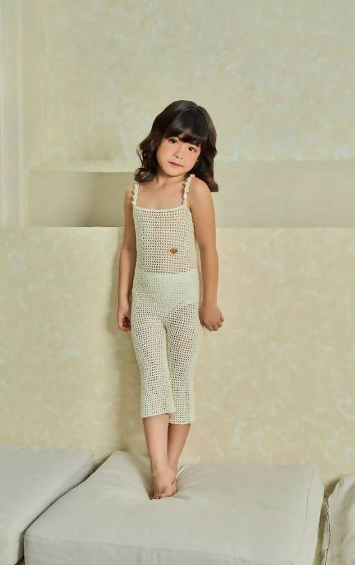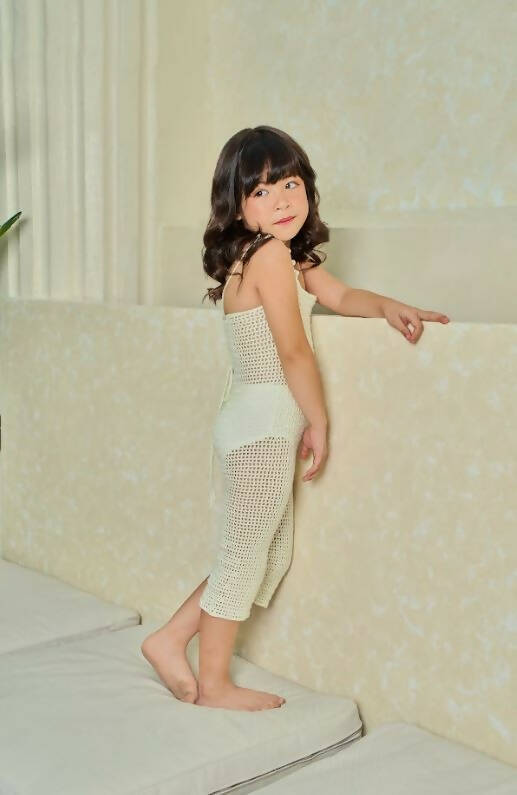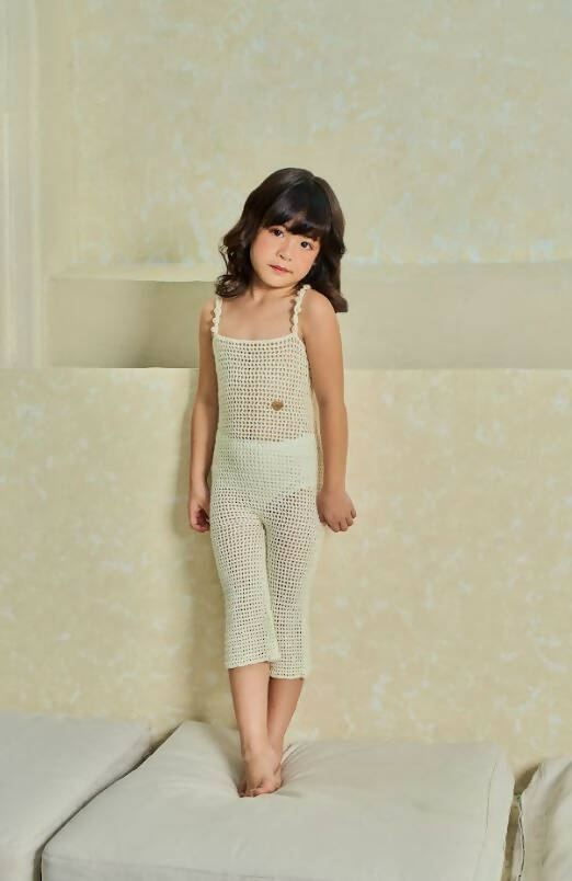 Kateri's crochet jumpsuit is something you’ll surely not miss. This must-have item has delicate pearls on its strap, carefully handcrafted with love. The power of its back-screaming style and sense of comfort. The back can be laced up for a perfect fit. The freshness of this cream-colored crochet will match your sunny day with your family!