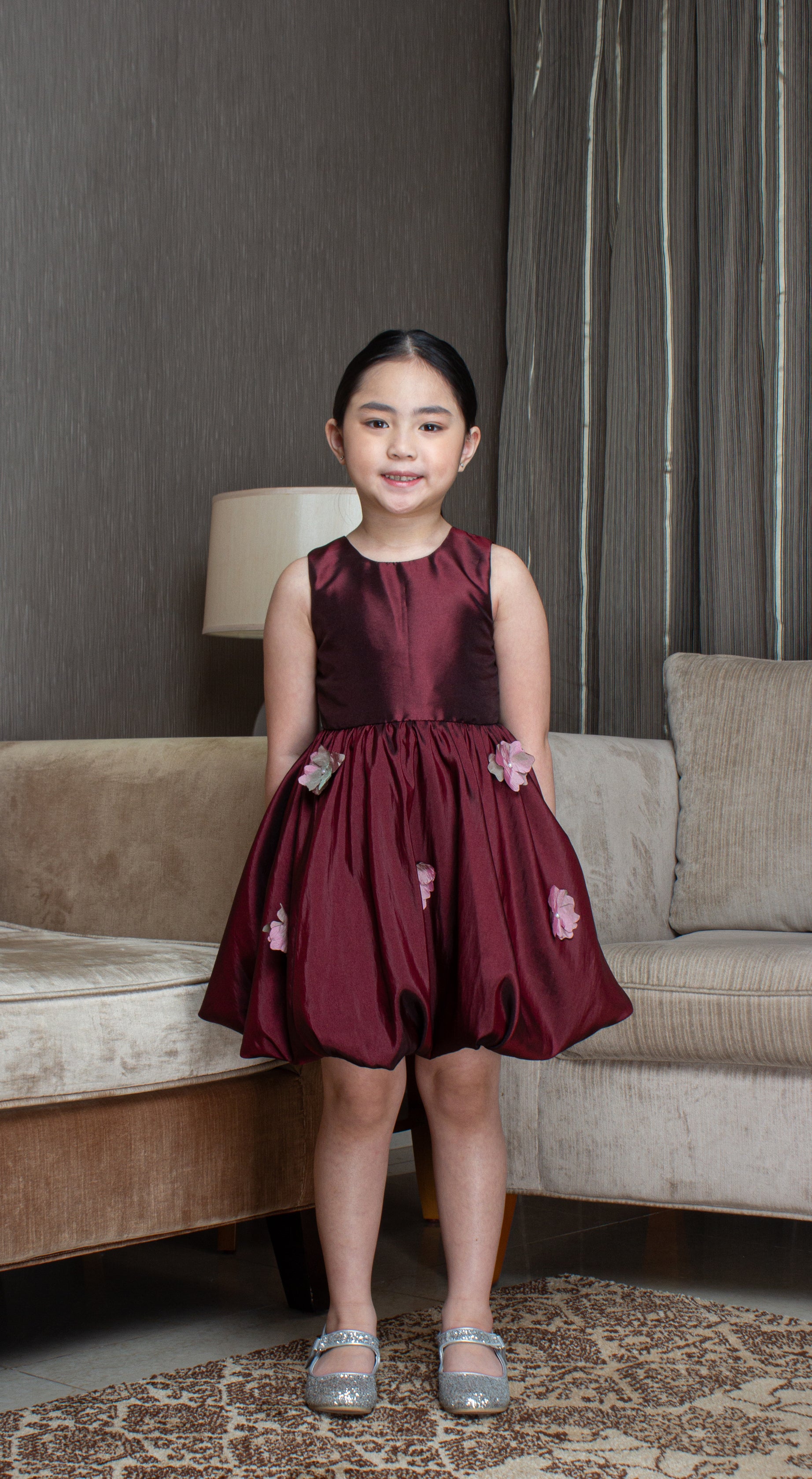 Another classic Unaricci favorite — a sleeveless top in solid-colored taffeta, sewn into a graceful mushroom-shaped skirt adorned with florets.  Understated yet elegant, perfect for timeless twinning moments.Size Chart: Age  Chest Waist Sh - Hem Hips 2-3yo 22" 20 5/8" 19 1/2" Free Size 3-4yo 22 1/2" 20 1/4" 21" Free Size 4-5yo 23" 21 1/4" 21 1/2" Free Size 6-7yo 23 1/2" 22 1/4" 24" Free Size