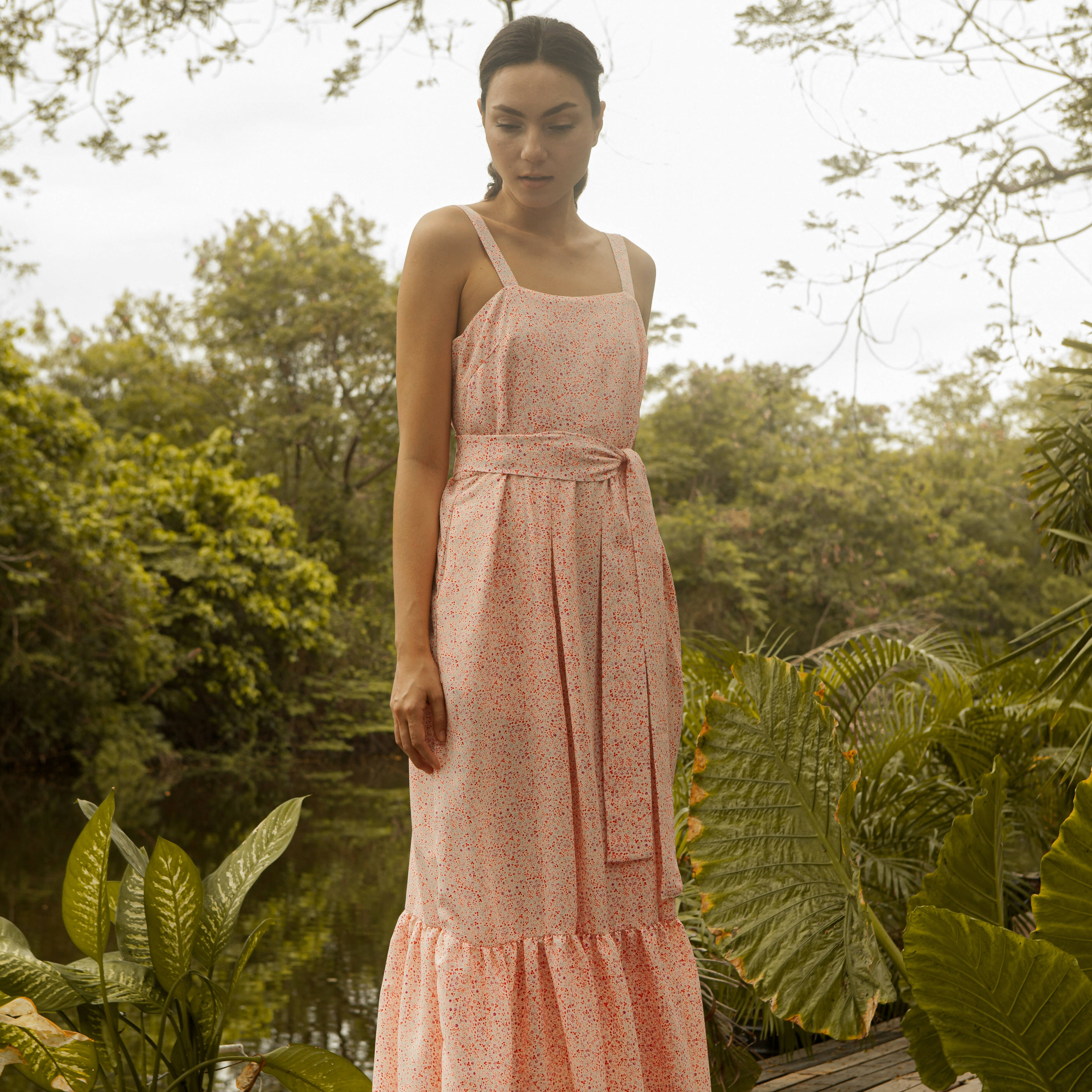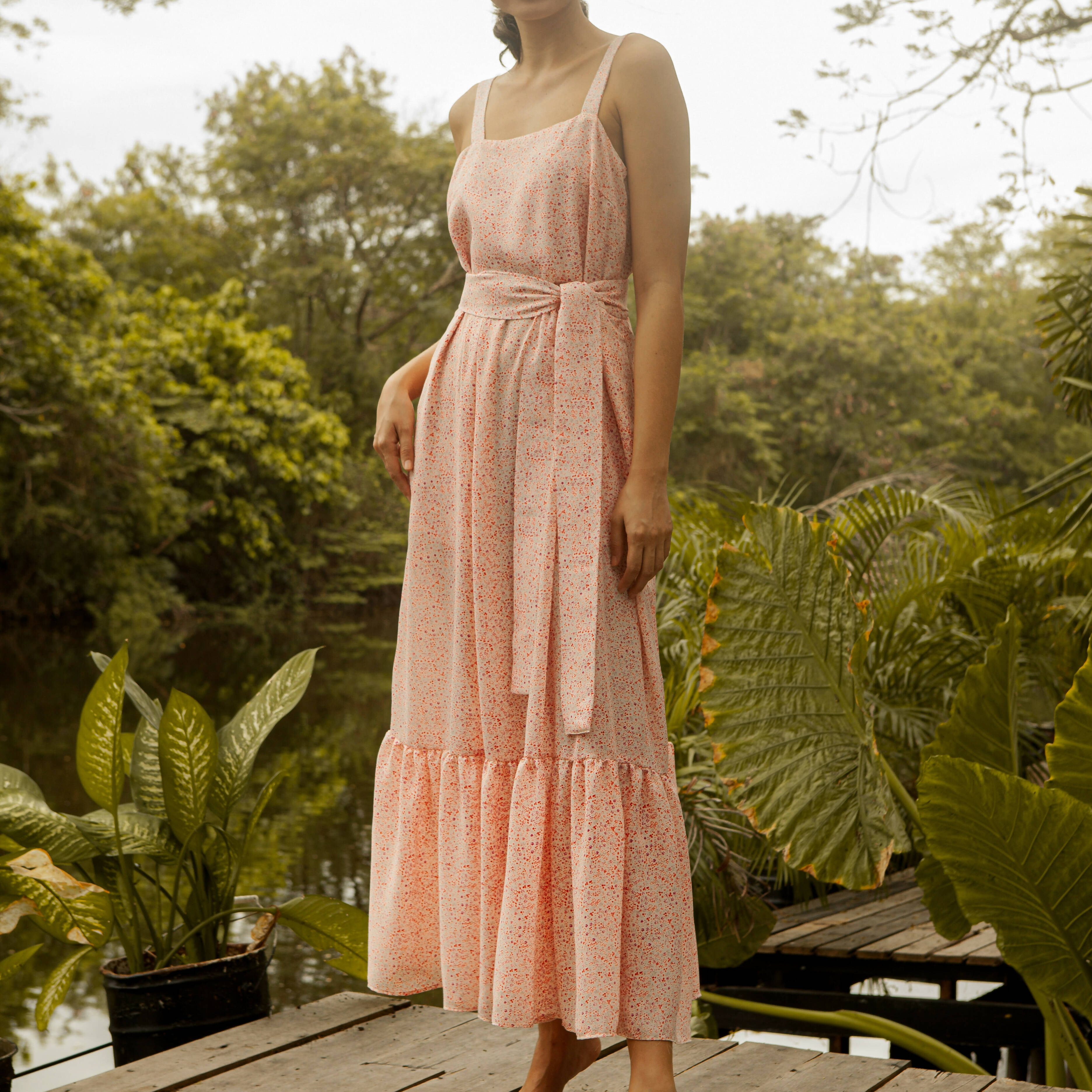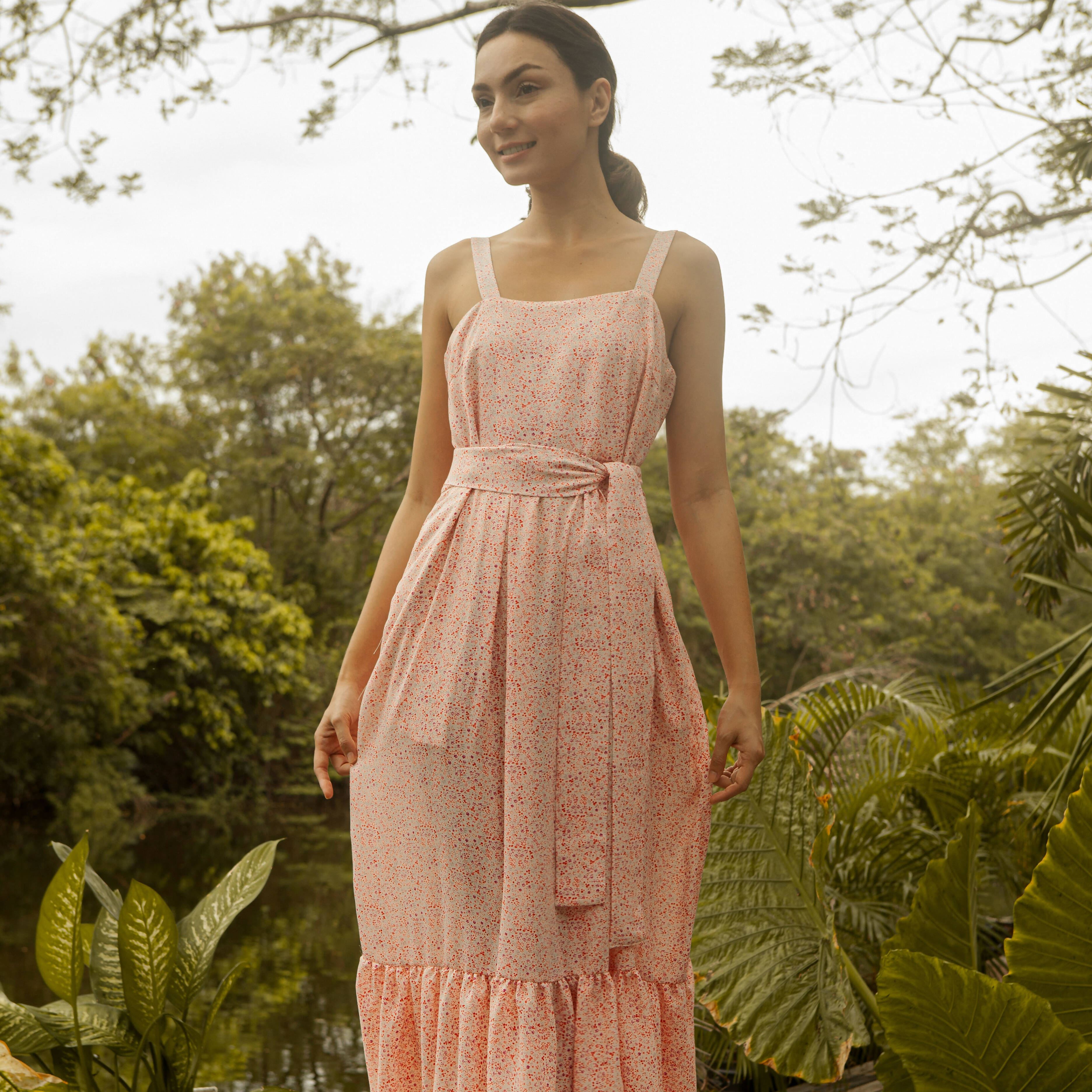 Style: Women’s Dress Wide Strap, Zero Button, Zero Zipper, Inclusive of Detachable Belt, Squark Neckline, Voluminous Skirt, Ruffle Hem, Side Invisible Pocket Fabric Composition: Lightweight Crepe Care instructions: Gentle hand wash or dry-cleanableSize Chart:S: Bust 35”, Waist 37”M: Bust 38”, Waist 40”L: Bust 41”, Waist 43”  Model's measurements are 5'10" and 31-24-35. Model is wearing small.