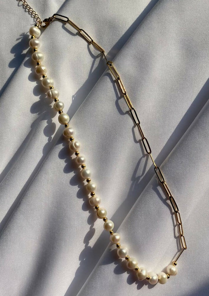 Freshwater Pearl Necklace Material: Gold Plated Paper Clip Chain Length: 18 inches Shape: Potato Size: 8-9 mm Spacer: Gold Plated Balls