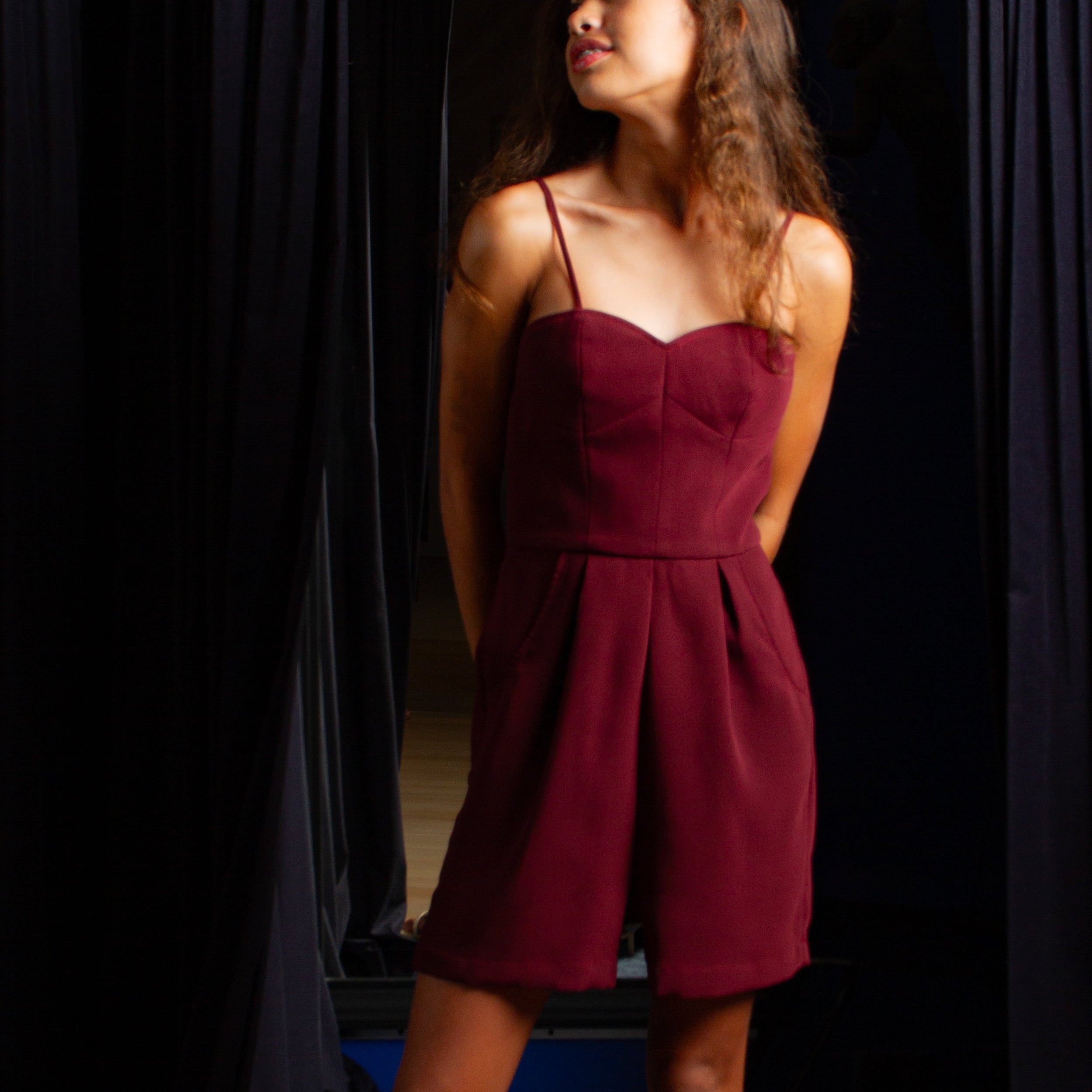Spaghetti Strap Romper in Maroon Crepe
